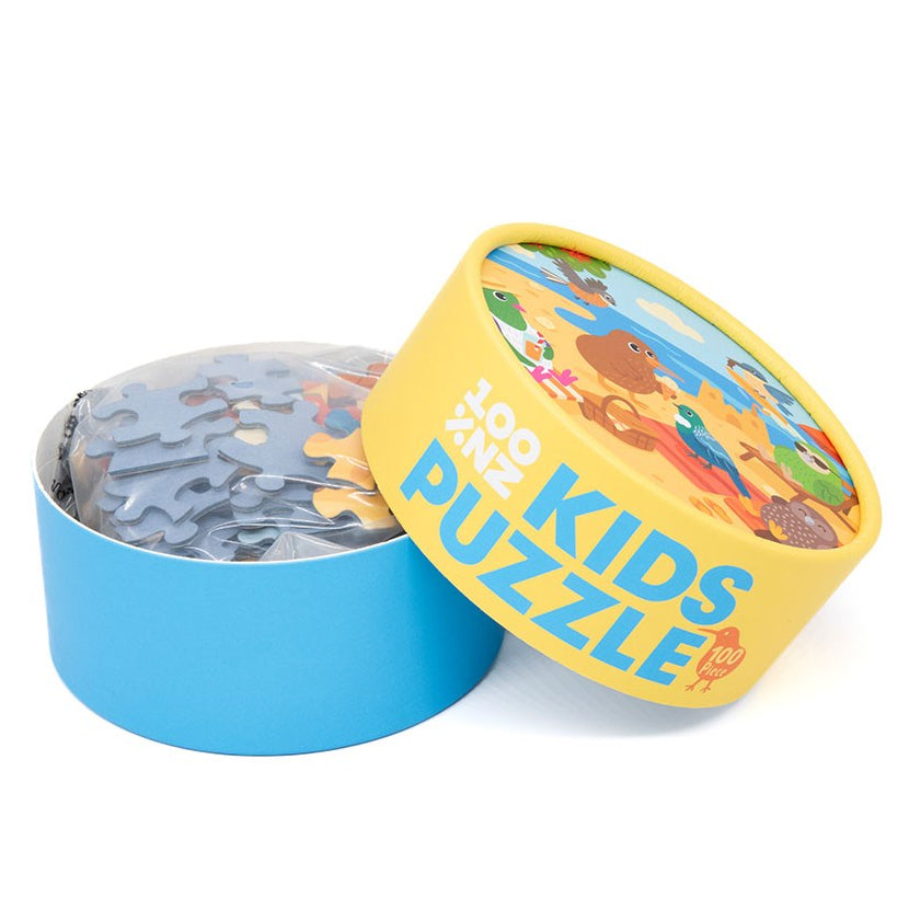 100 piece kids puzzle is bright, bold, and full of character, celebrating New Zealand with playful illustrations printed on premium blue puzzle board for durability.