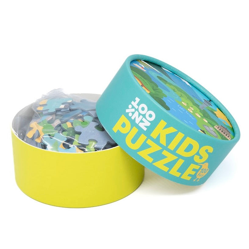 100 piece kids puzzle is bright, bold, and full of character, celebrating New Zealand with playful illustrations printed on premium blue puzzle board for durability.
