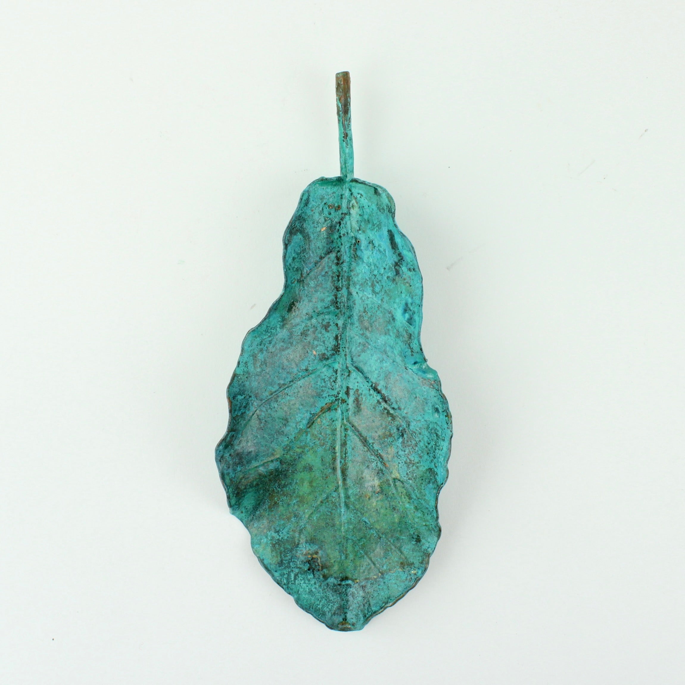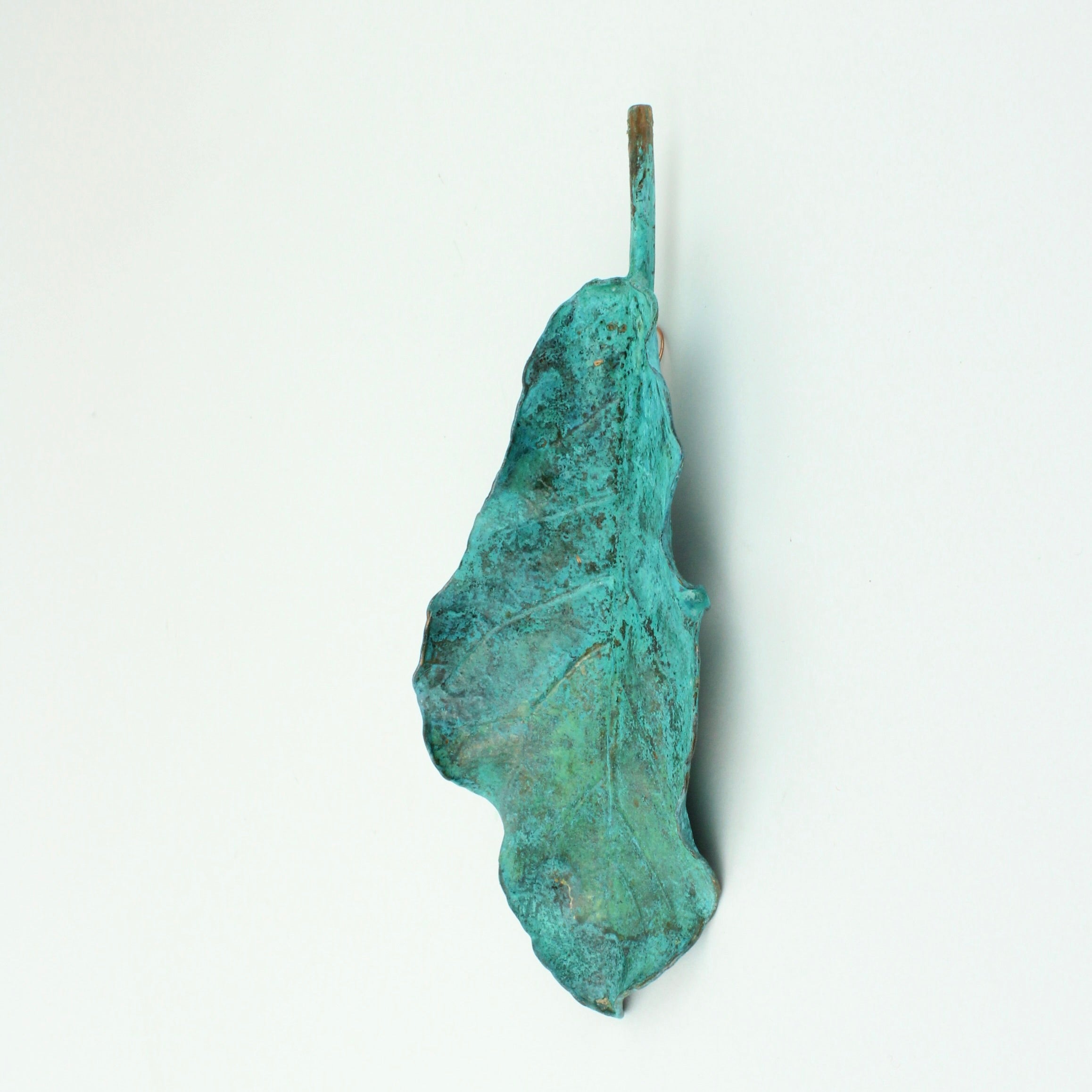 Vaughan Otto uses real New Zealand native puka leaves through a process of electroplating which encases the original leaf in copper. An oxide is used to give a verdigris finish.