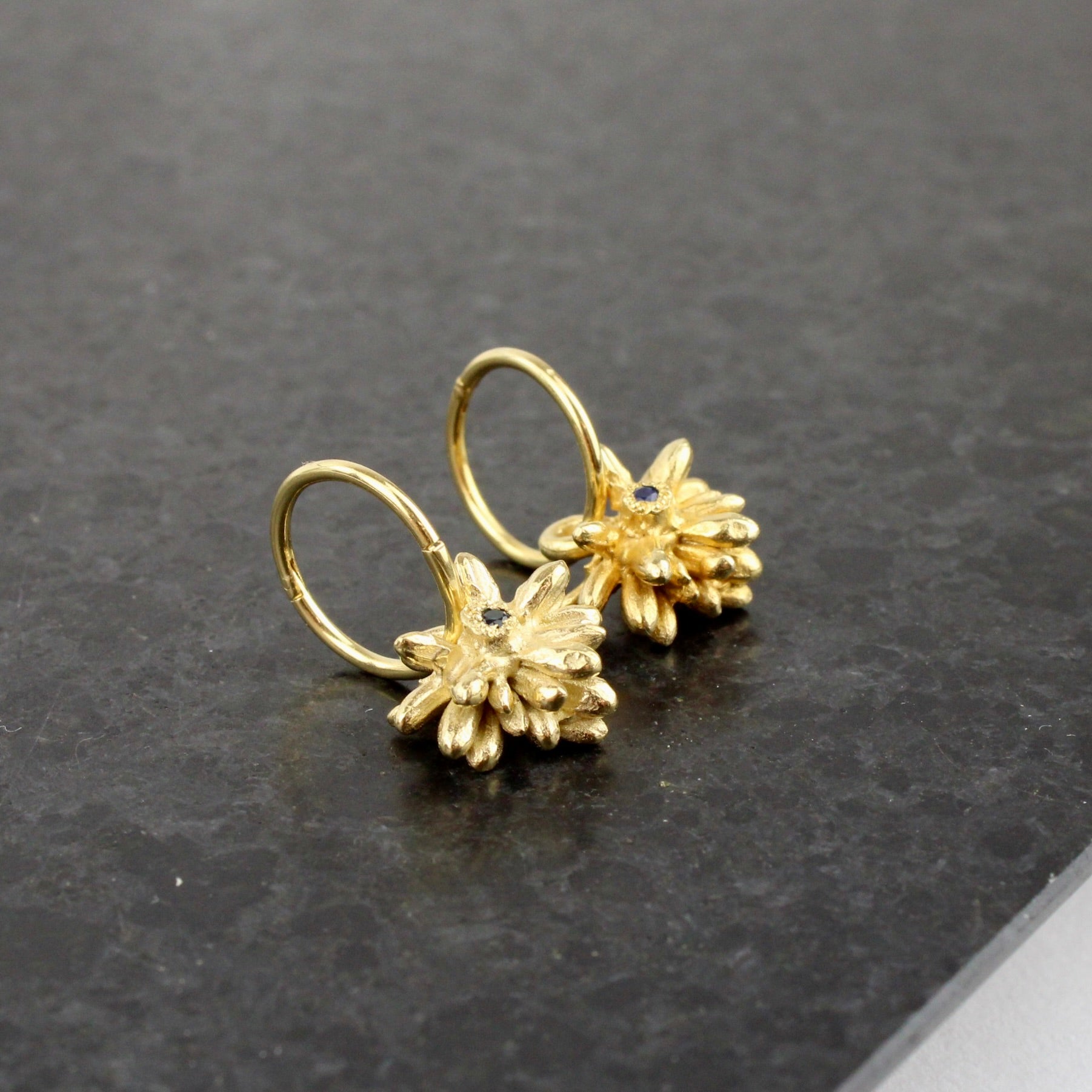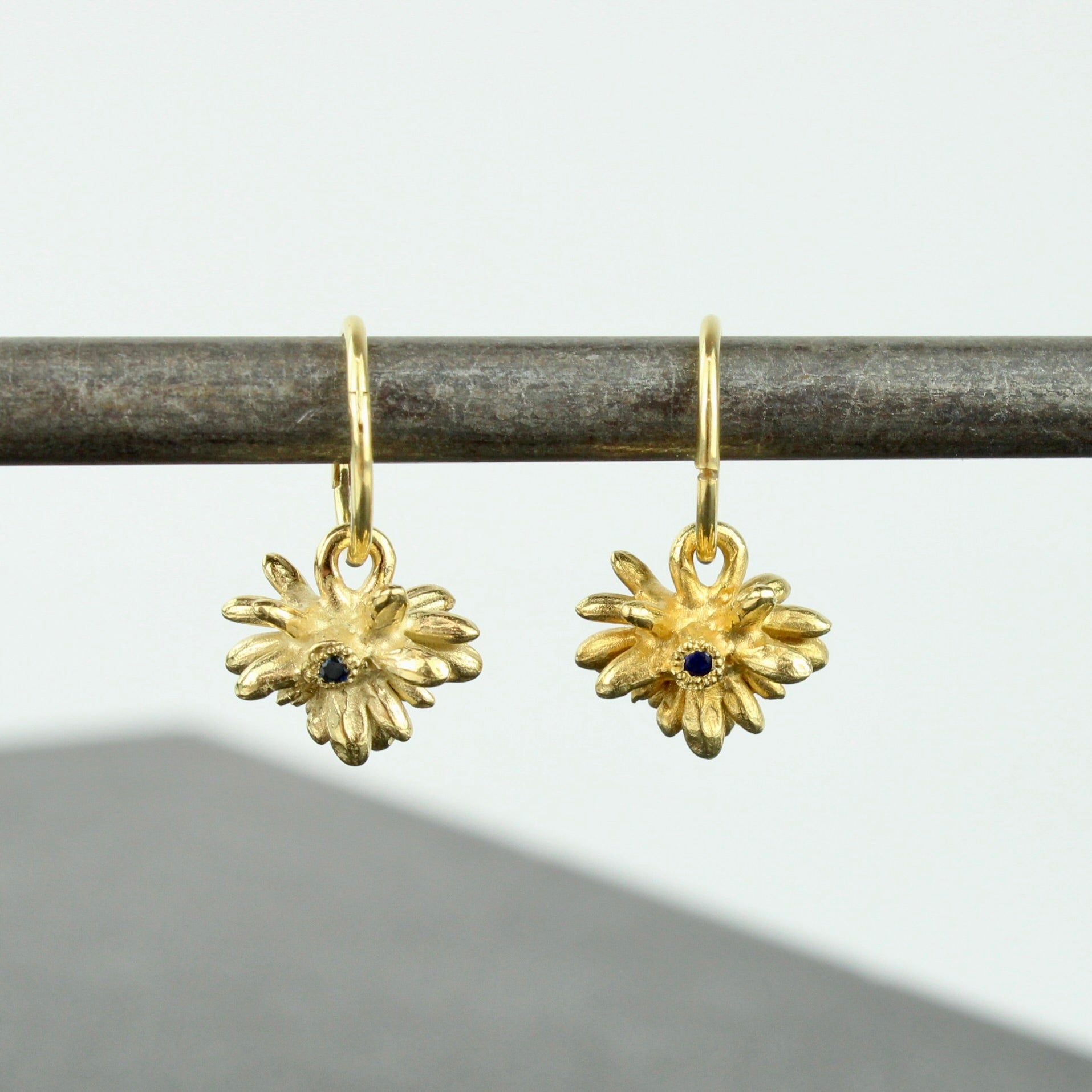 Handmade gold plated sterling silver earrings cast from native Coprosma seed pods and set with tiny light-blue sapphires.