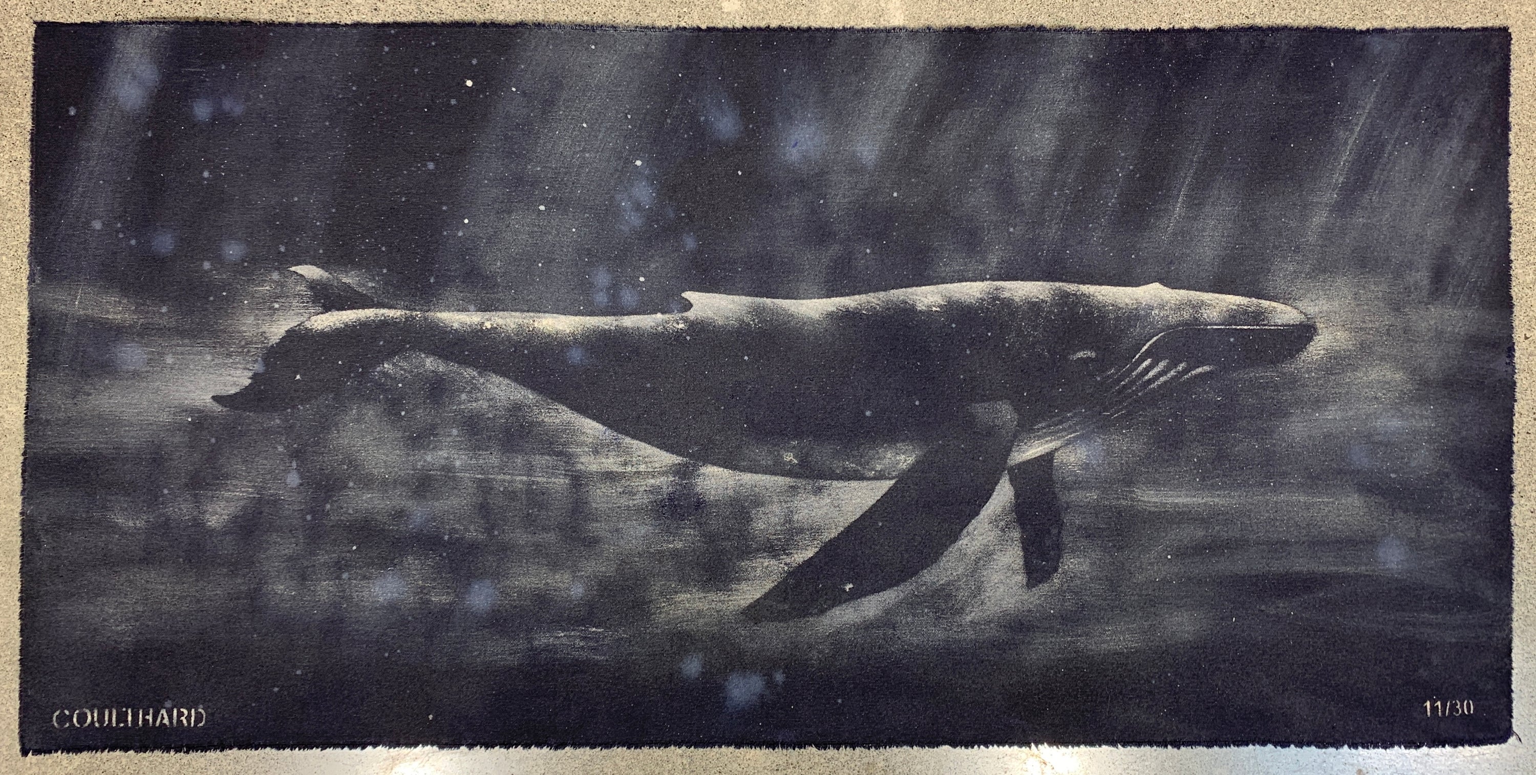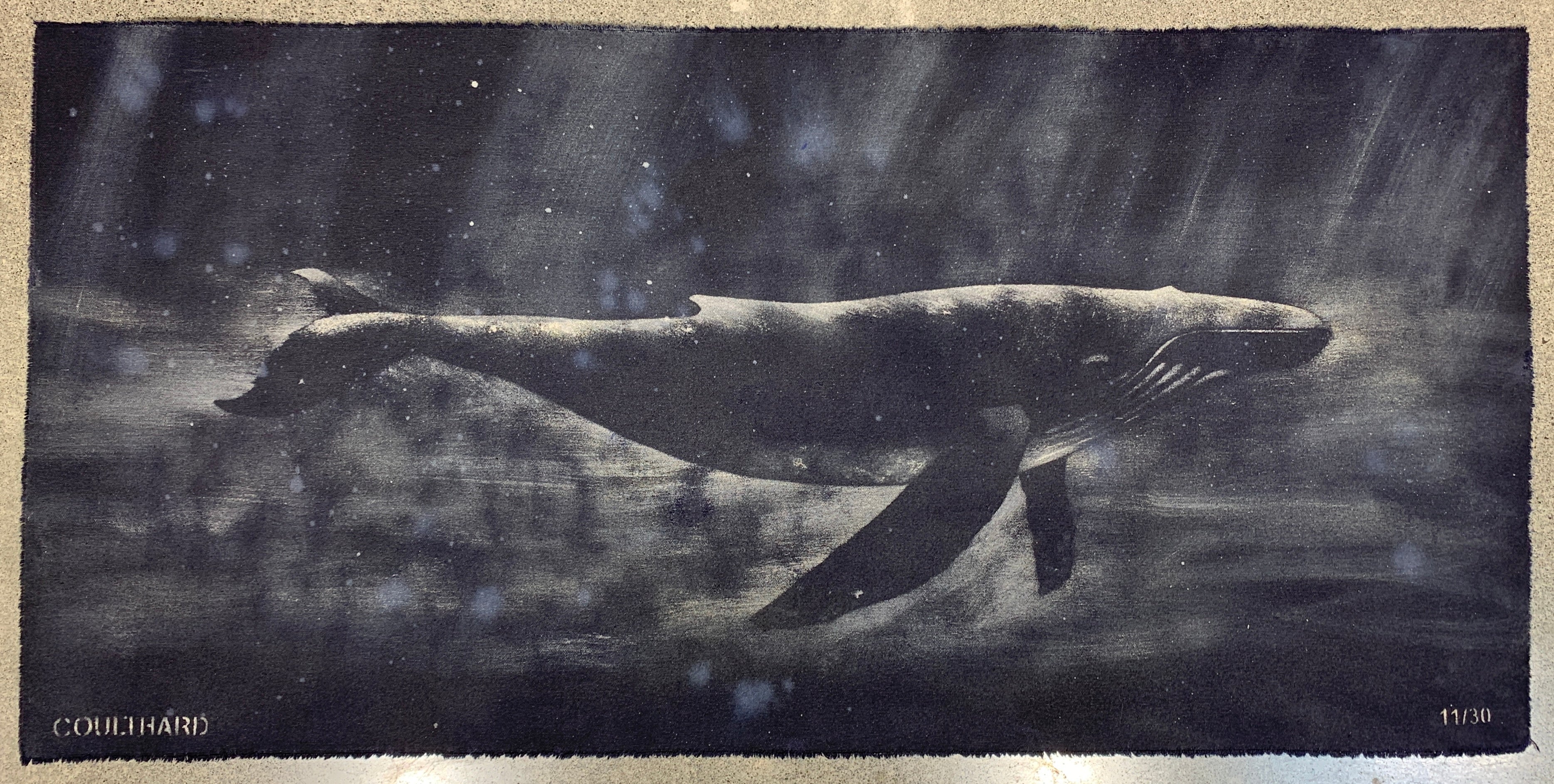 Paula Coulthard’s Dark Navy Whale series follows the same whale design across each work, yet no two are ever identical. Painted using a stencil and then scrubbed with water over gravel, the process creates variations in splashes, textures and atmosphere, allowing each piece to subtly differ while the whale form remains constant.