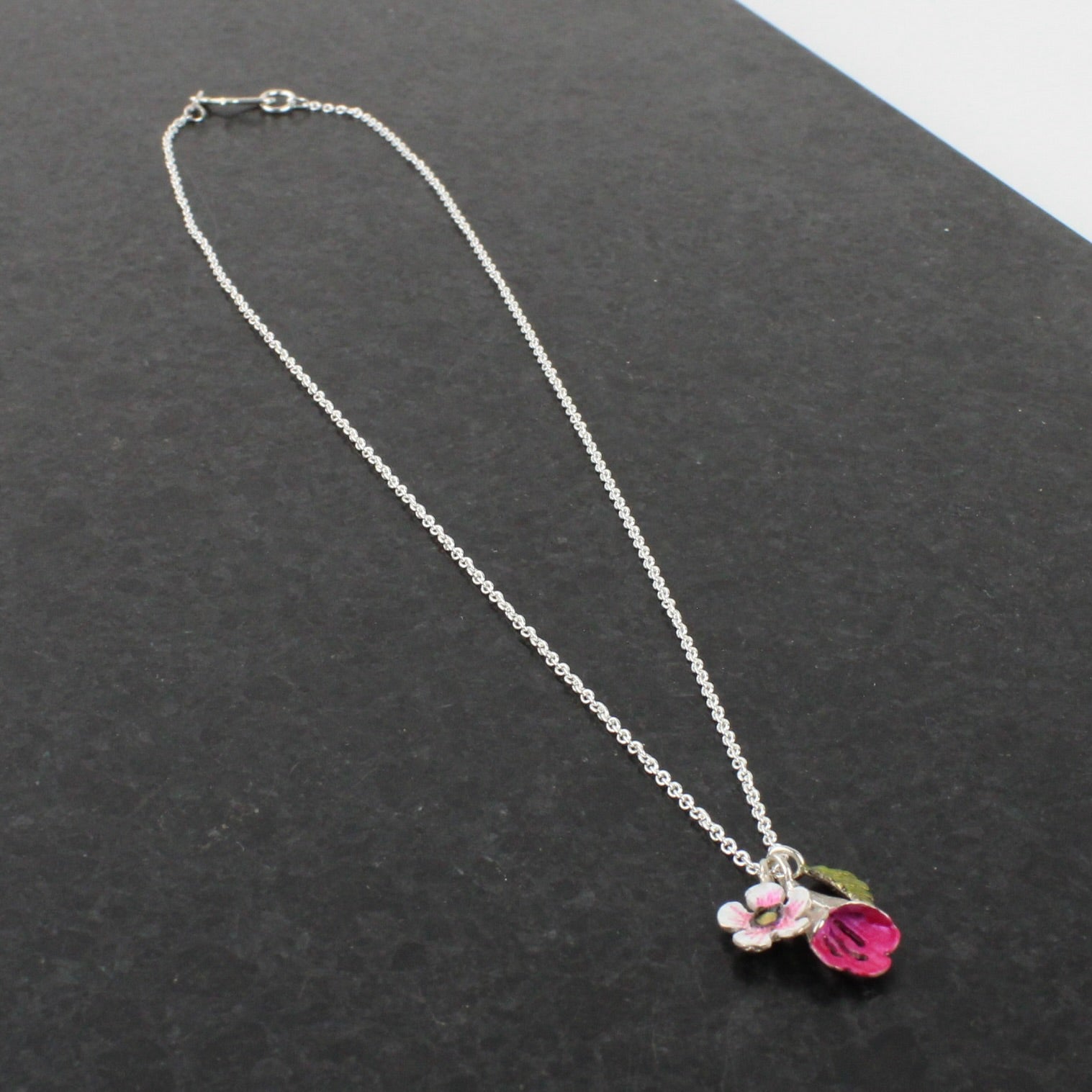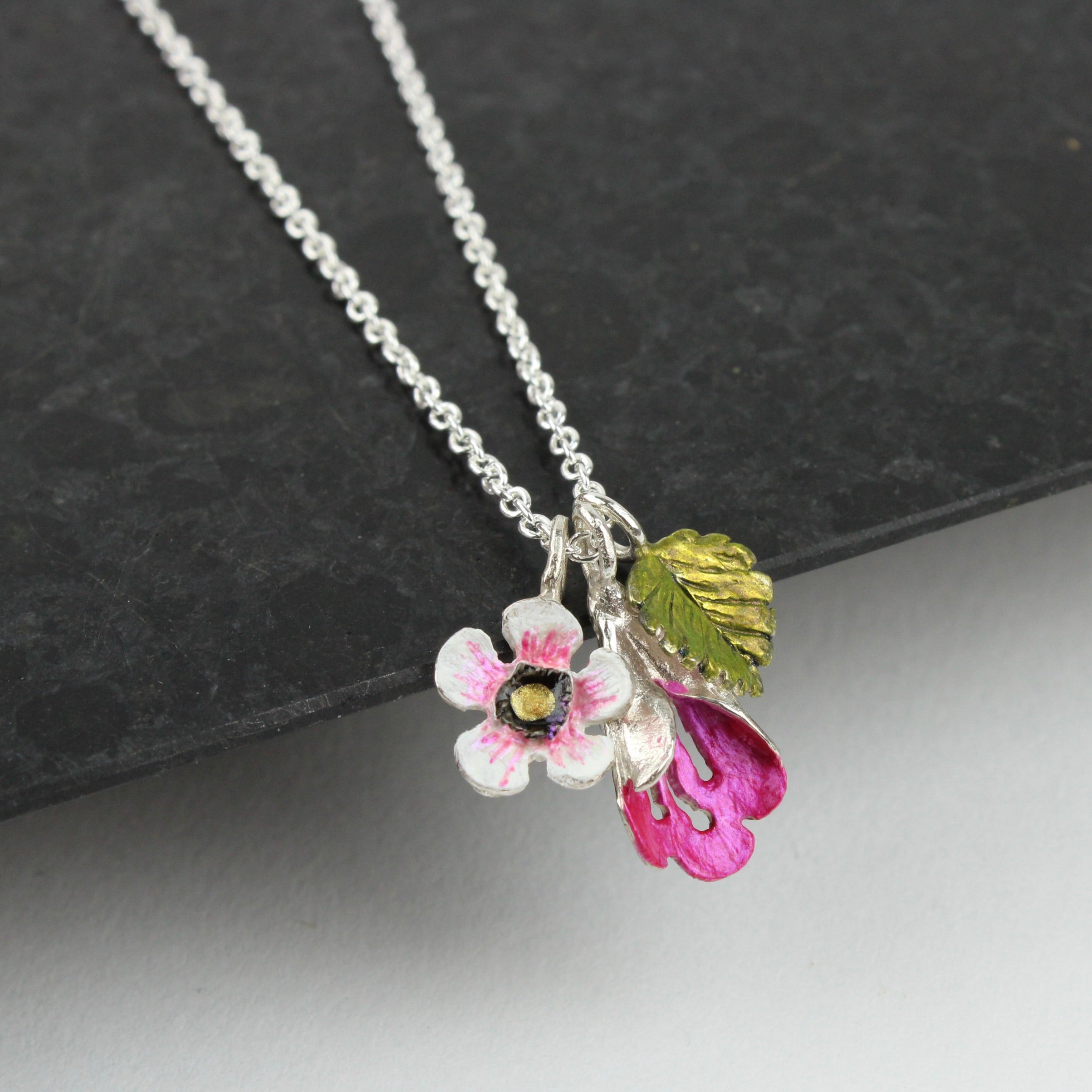 A bouquet of Manuka and Puriri flowers and Beech leaves hang from sterling silver rings. Hand painted with porcelain paint. 32mm long bouquet on 450mm sterling silver chain.