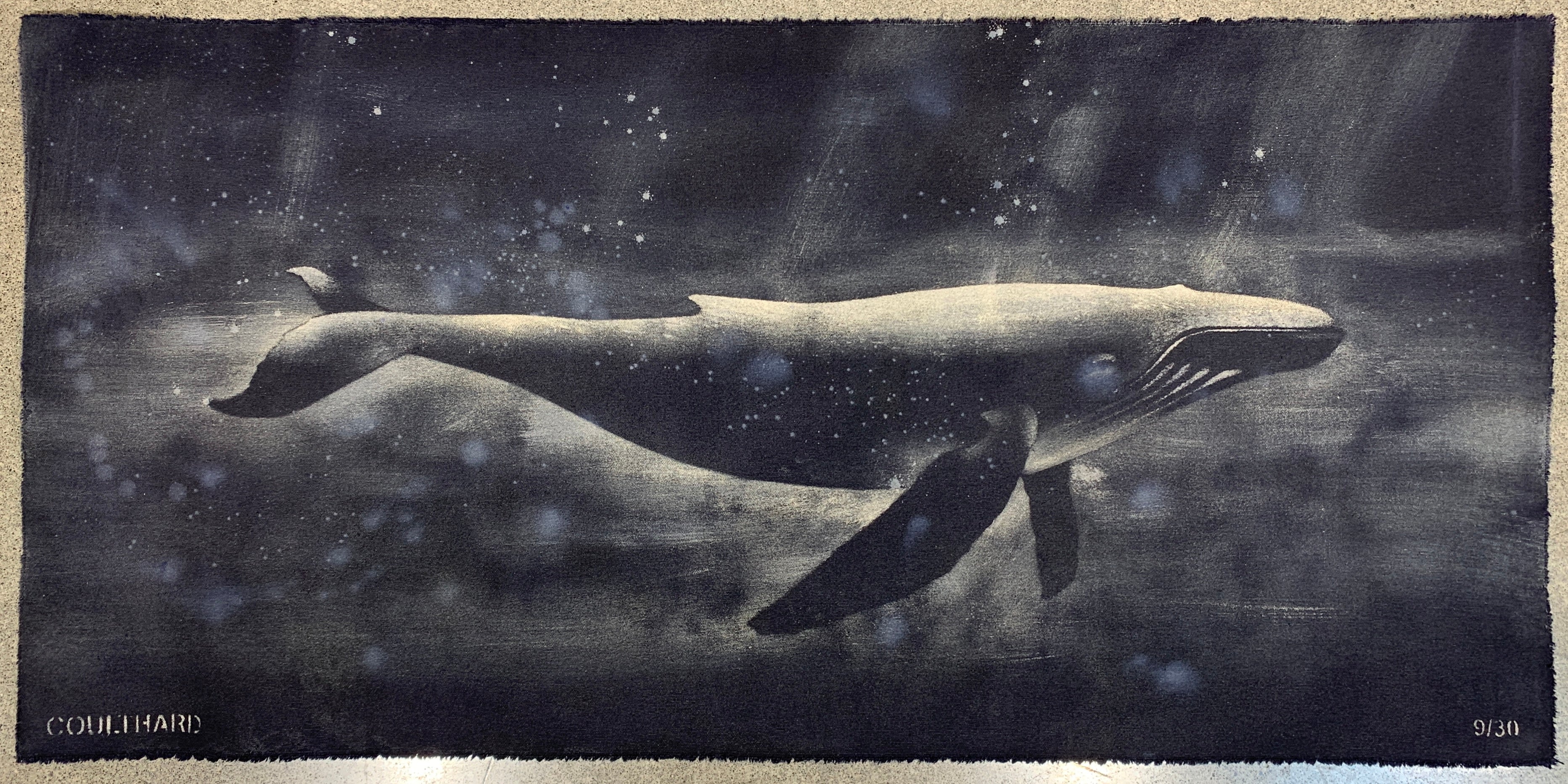 Paula Coulthard’s Dark Navy Whale series follows the same whale design across each work, yet no two are ever identical. Painted using a stencil and then scrubbed with water over gravel, the process creates variations in splashes, textures and atmosphere, allowing each piece to subtly differ while the whale form remains constant.
