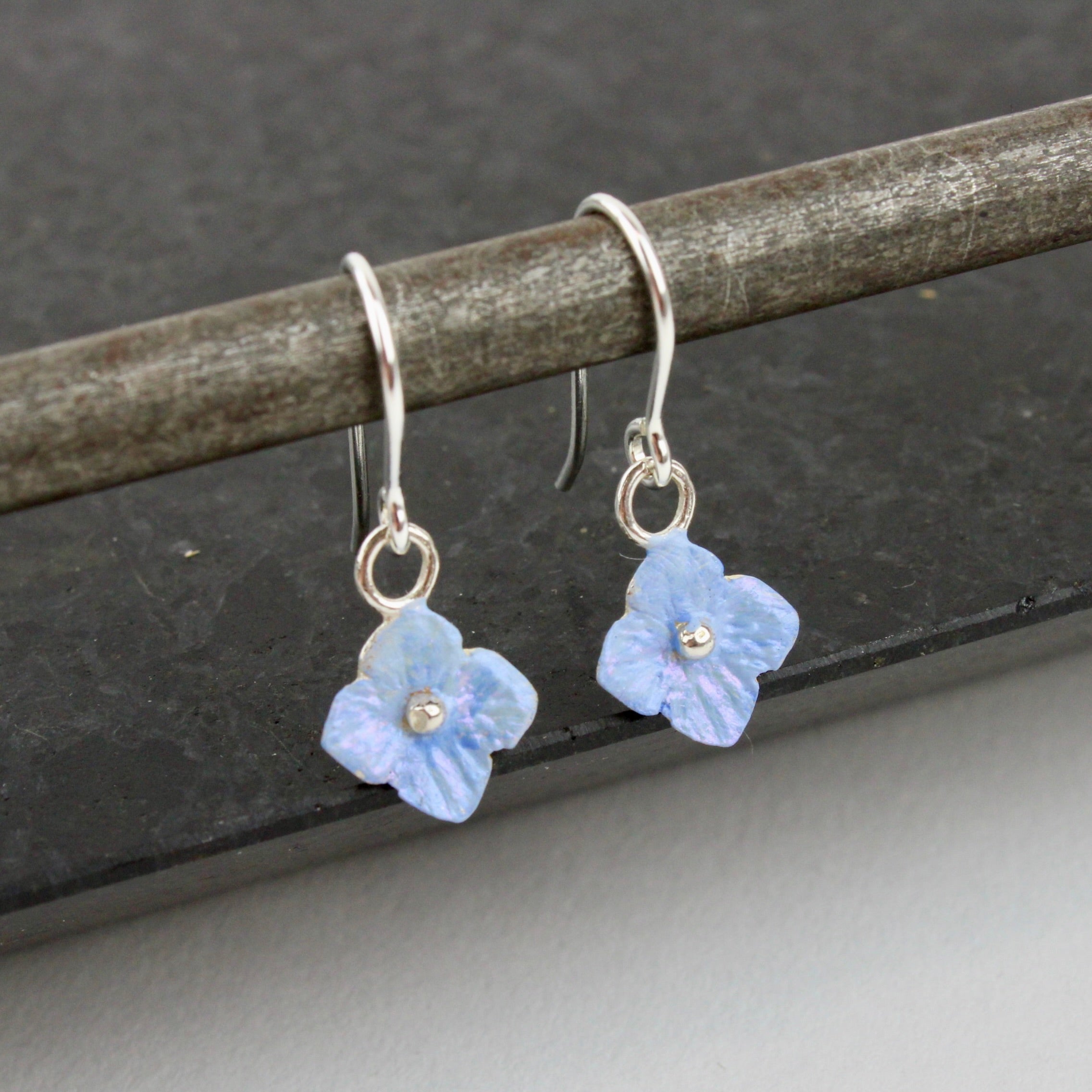 Sterling silver 10mm Hydrangea flowers, hand painted with porcelain paint in baby blues with pink tinges sterling silver ear hooks.