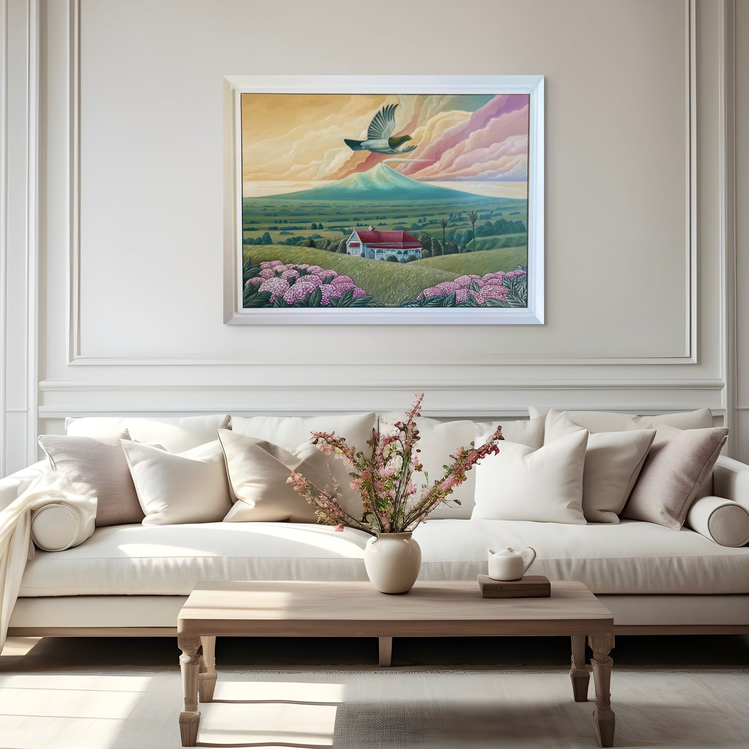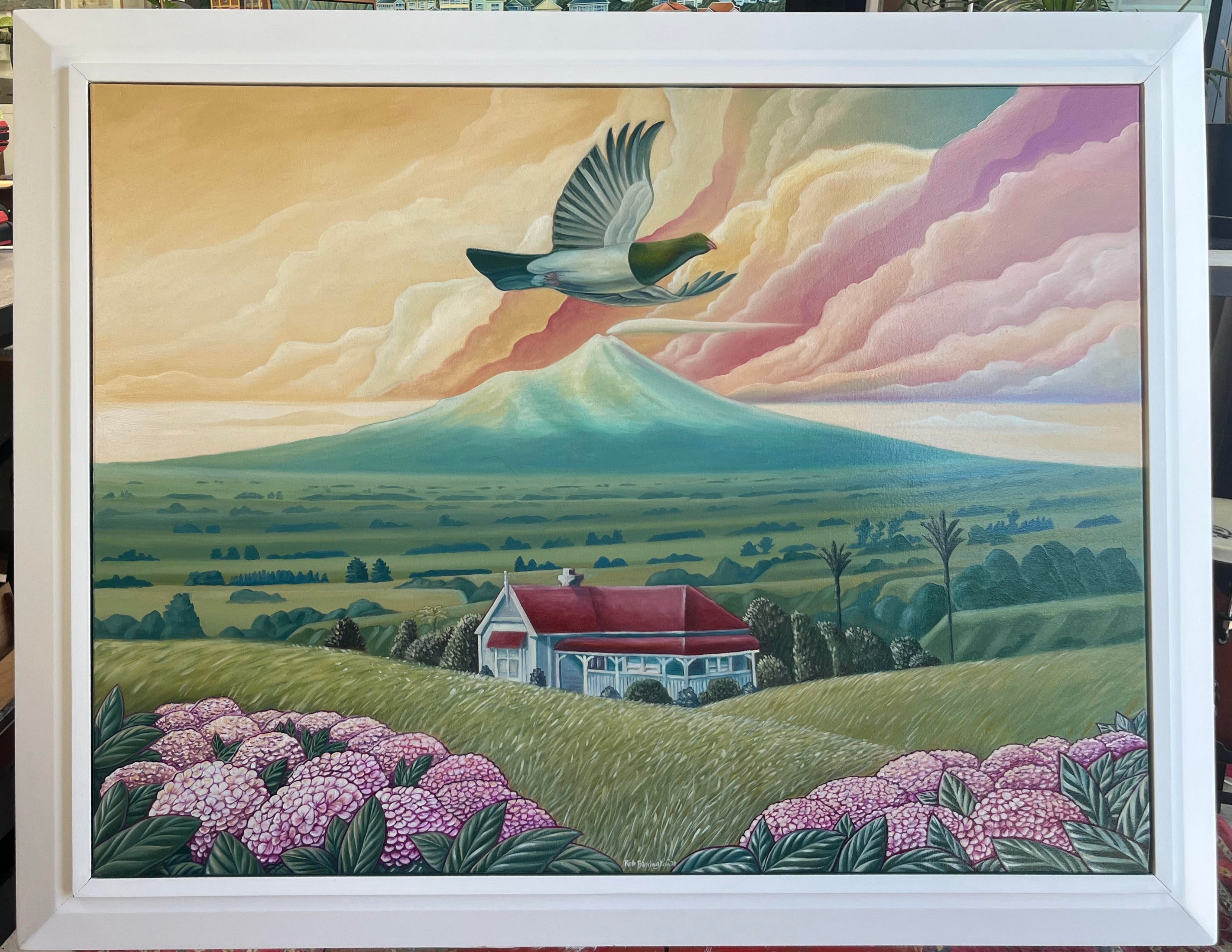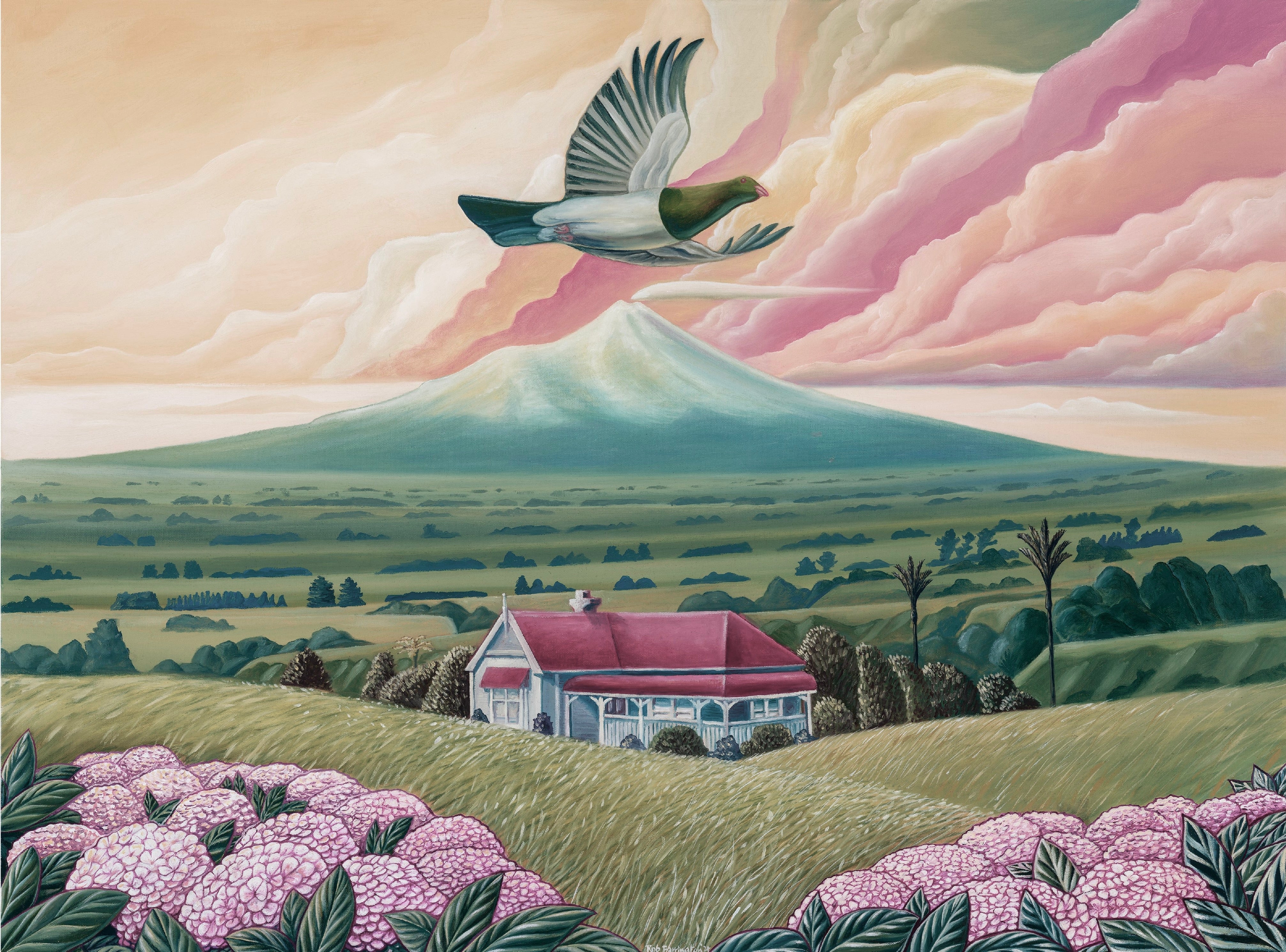 As Rob Barrington describes, Kereru @ South Taranaki, captures the majestic journey from Whanganui to Taranaki, where, on clear days, the sweeping vistas of Mt Taranaki reveal themselves in all their grandeur. As the road curves, the landscape unfolds to showcase iconic homes, from farmhouses to townships, anchoring the painting in a sense of place and memory. Native and domestic birds populate these lands, yet it is the Kereru, or native wood pigeon, that reigns supreme, commanding attention with its graceful flight. The work celebrates the interplay of landscape, architecture, and wildlife, inviting viewers to pause and experience a moment of natural and cultural connection.