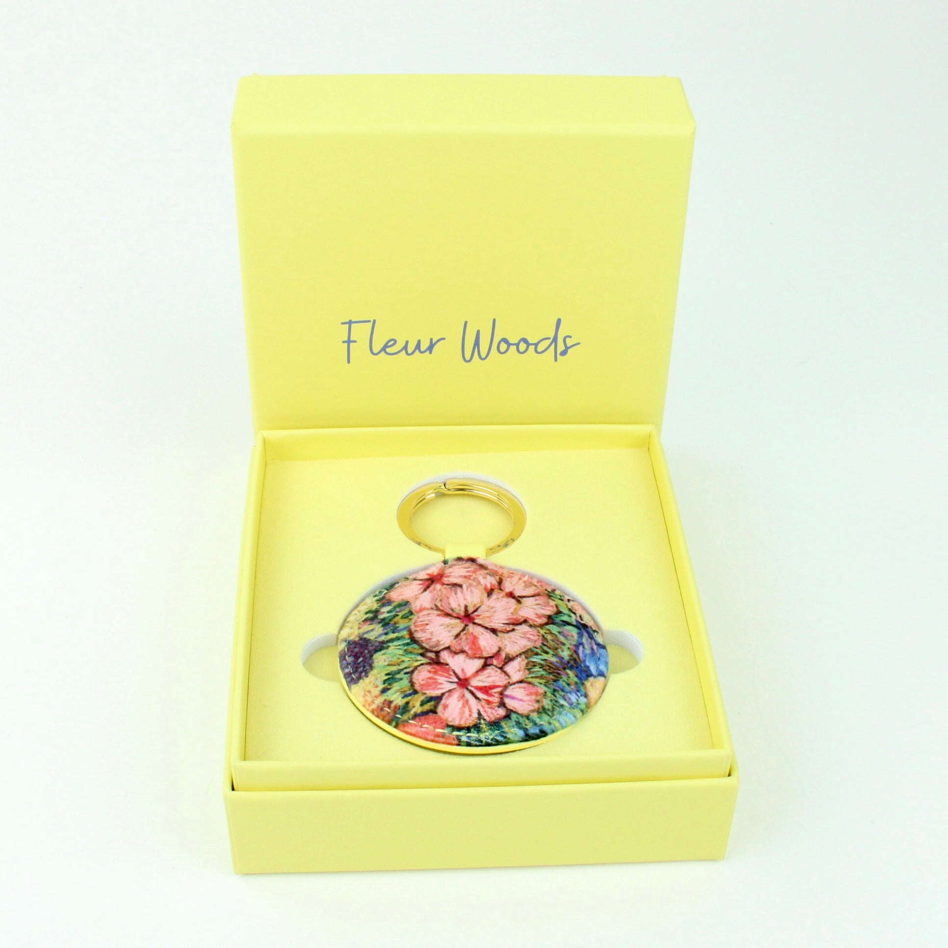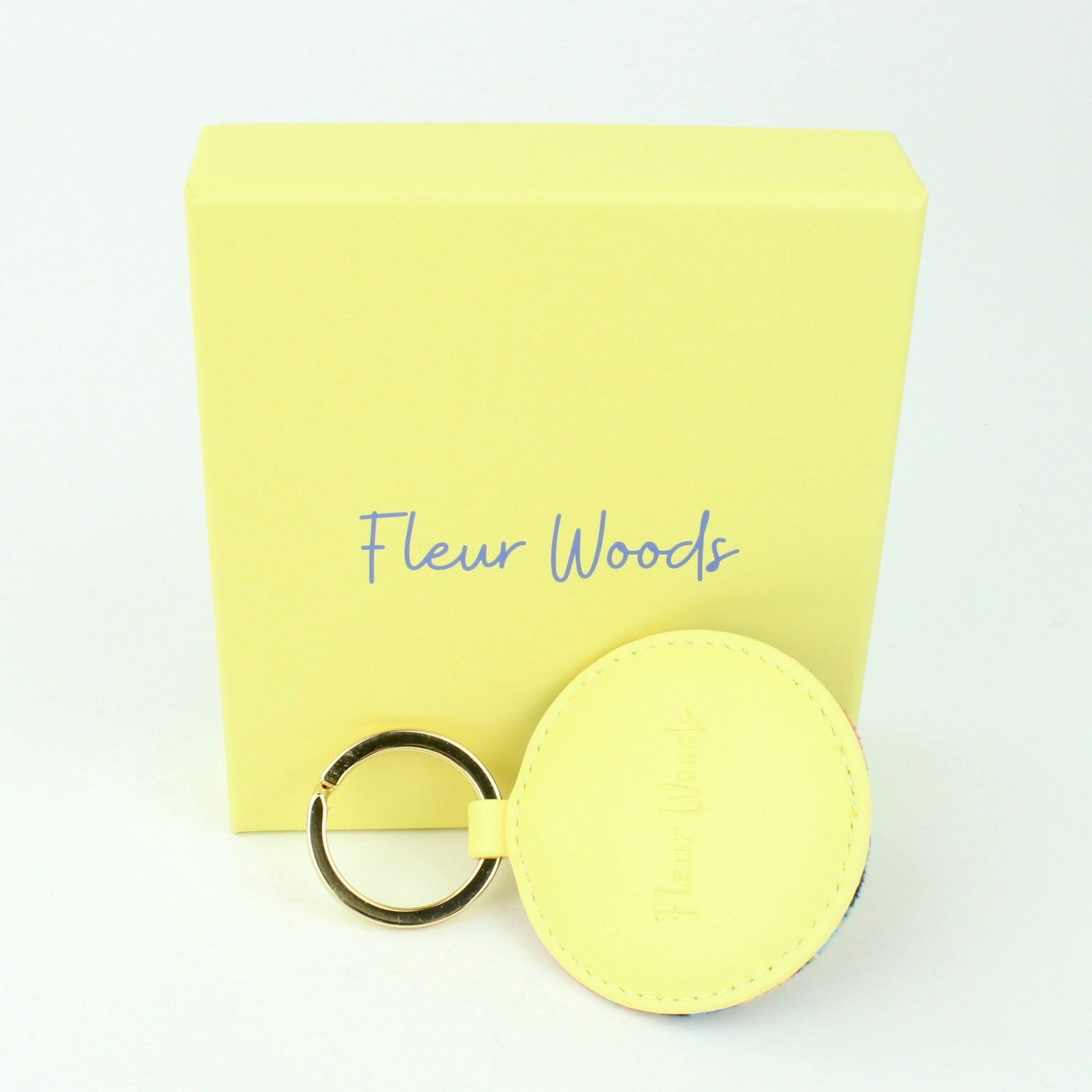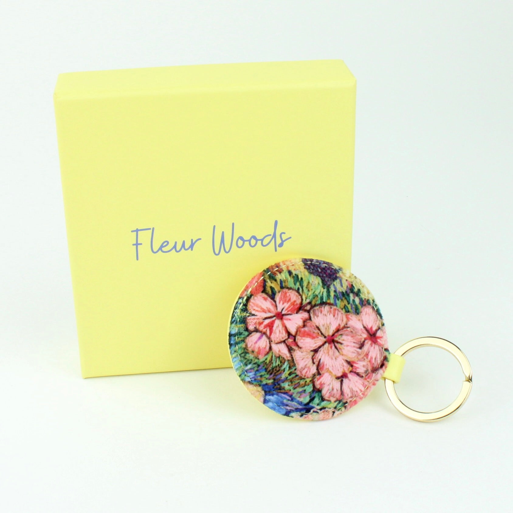 A collectable limited edition velvet & vegan leather key ring adorned with an image from Fleur Woods 'Rivers & Roads' original hand embroidered artwork. Comes beautifully gift boxed.