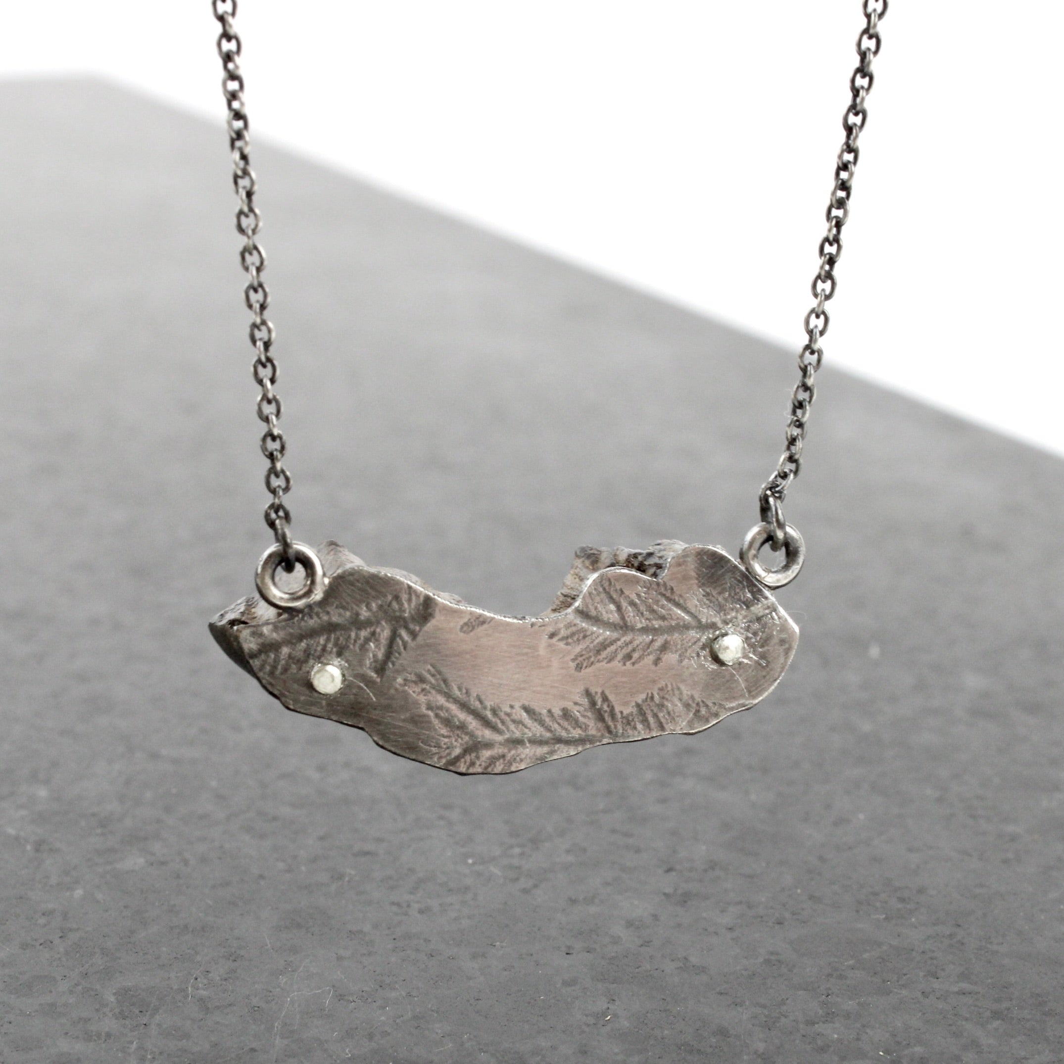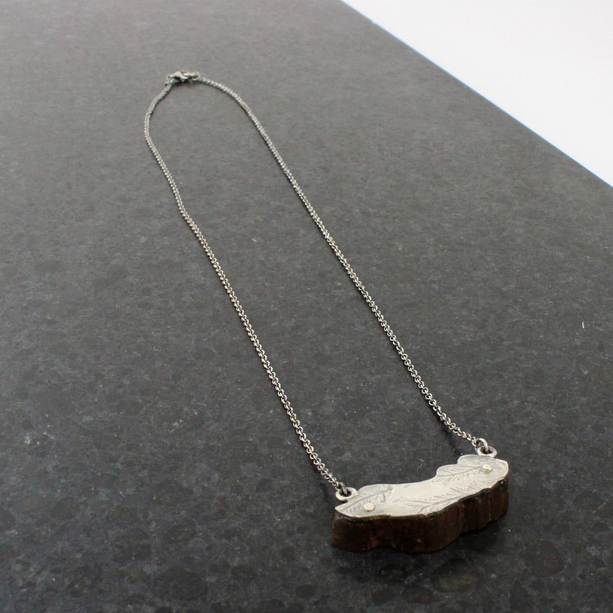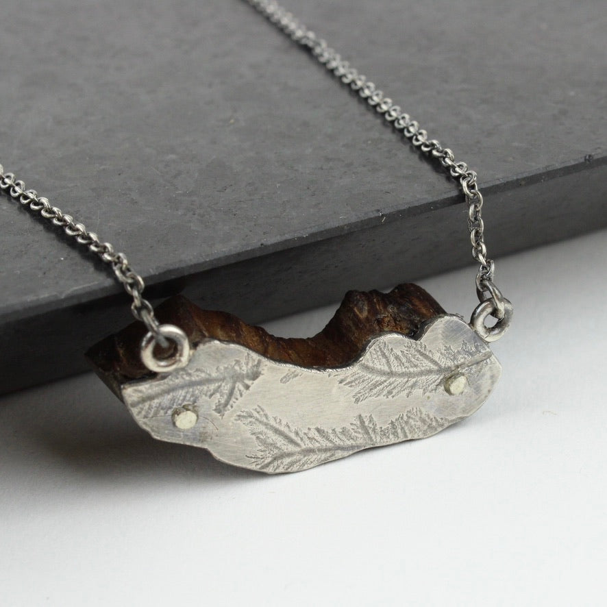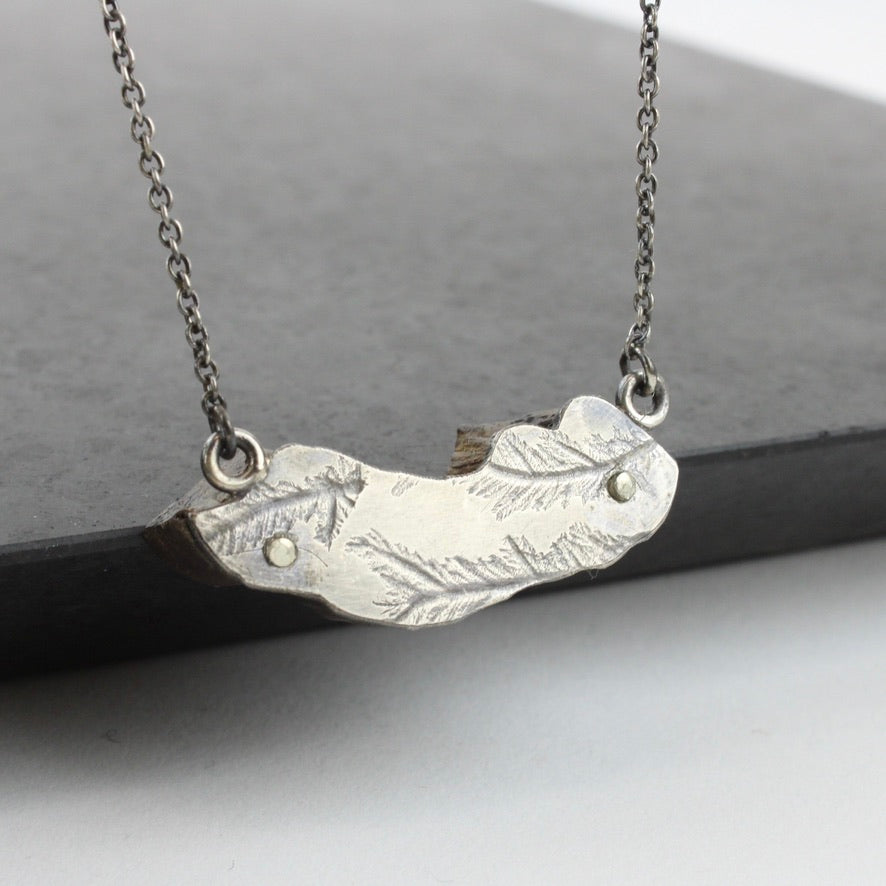 Seaweed printed sterling silver on polished ancient drfitwood