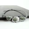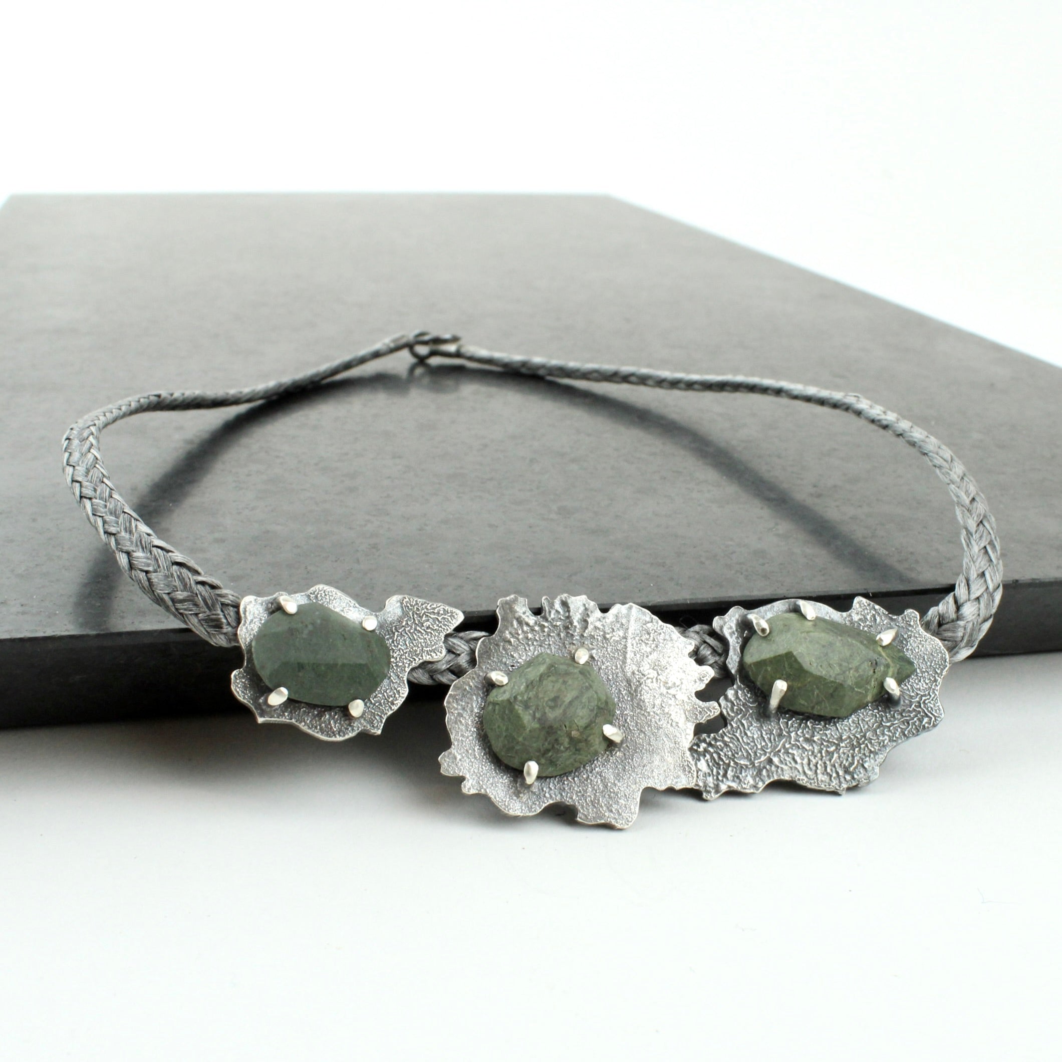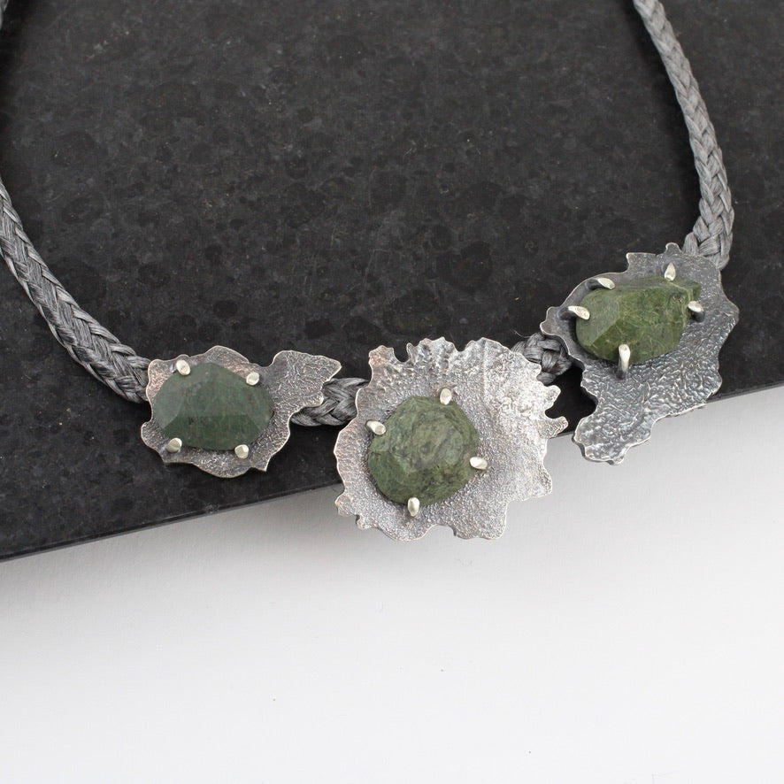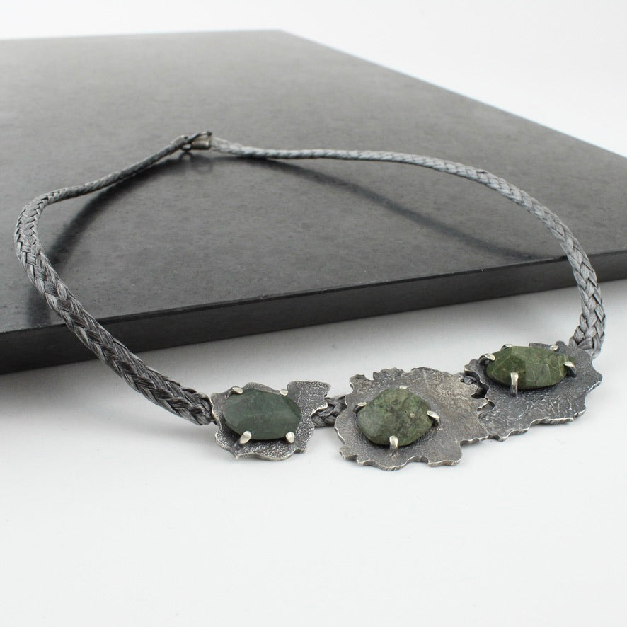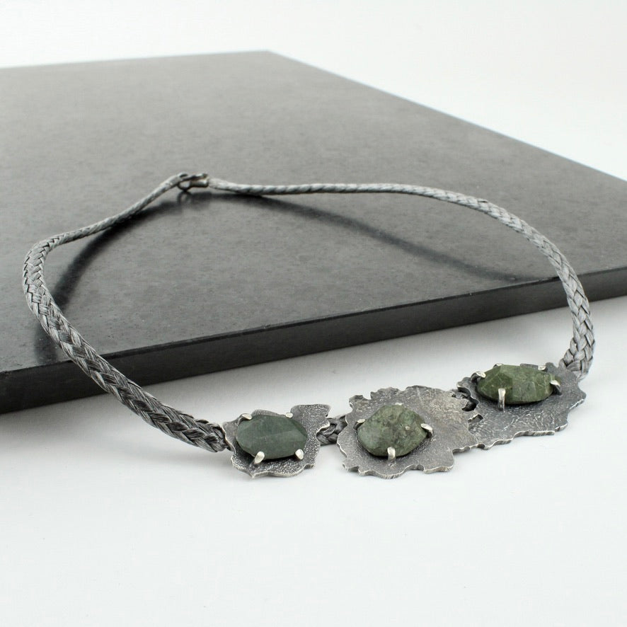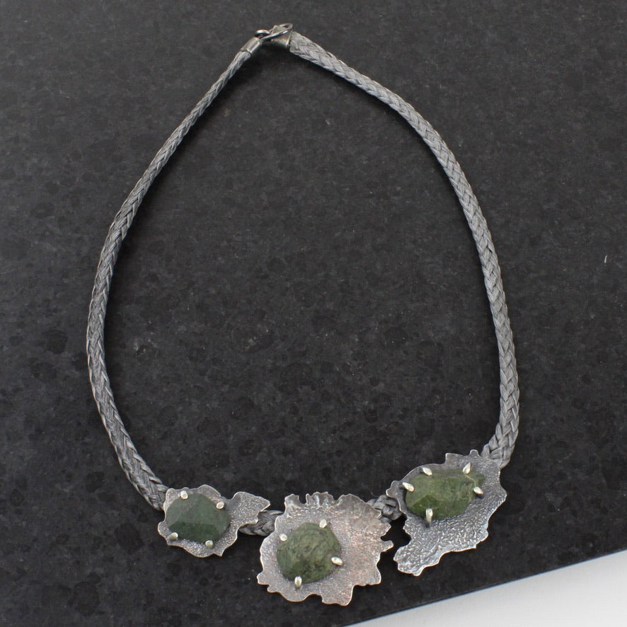 Hand cut beach stones and sterling silver on a 450mm kevlar cord