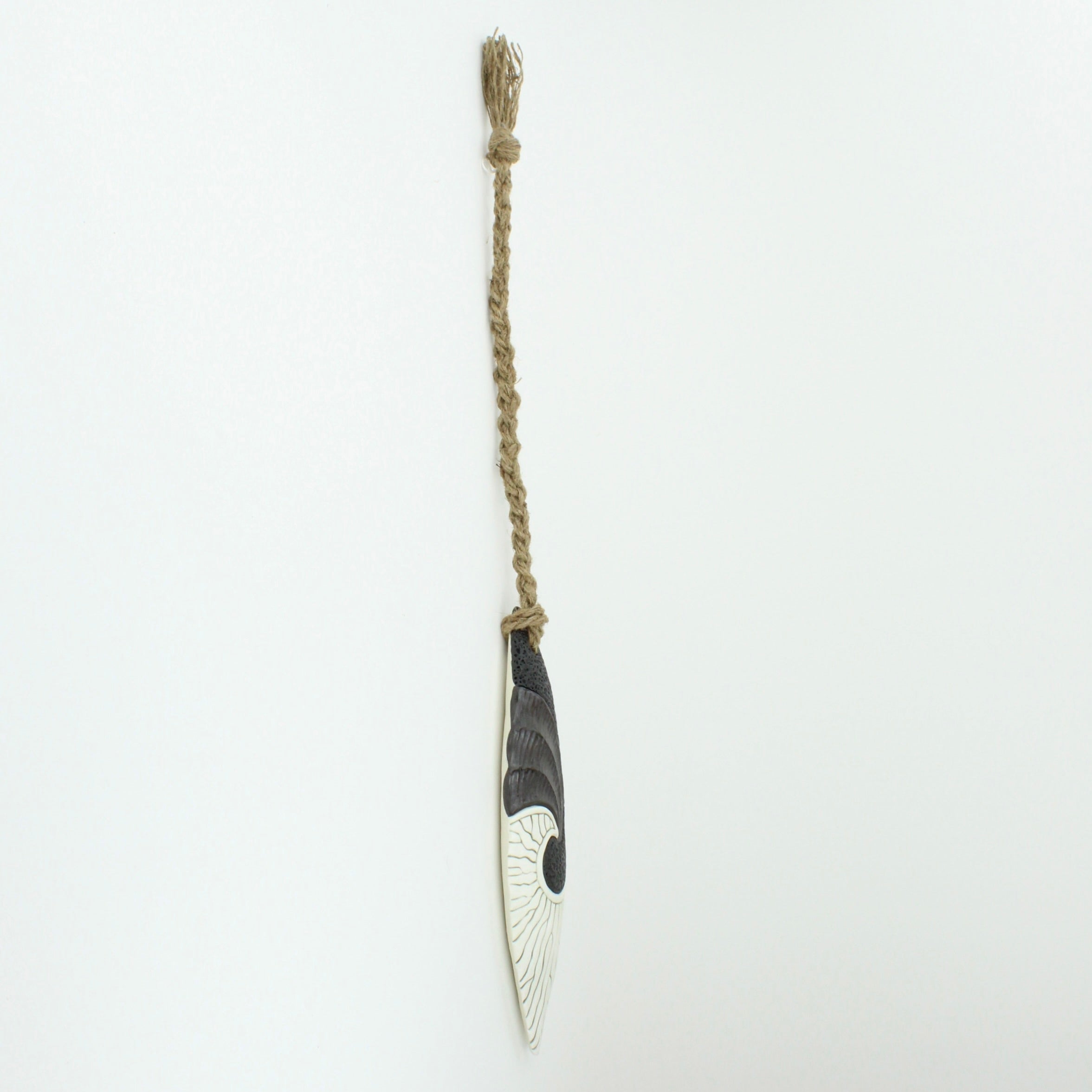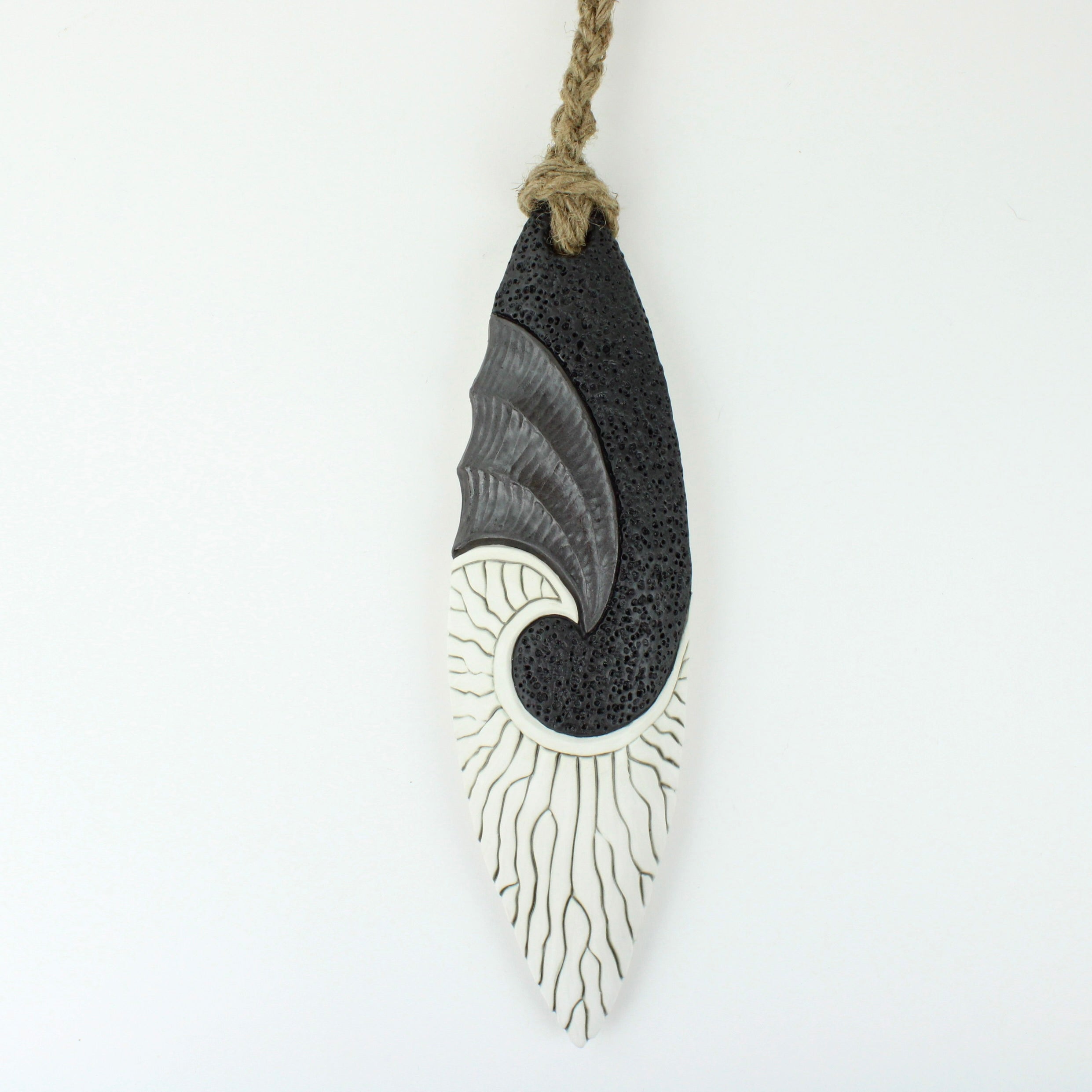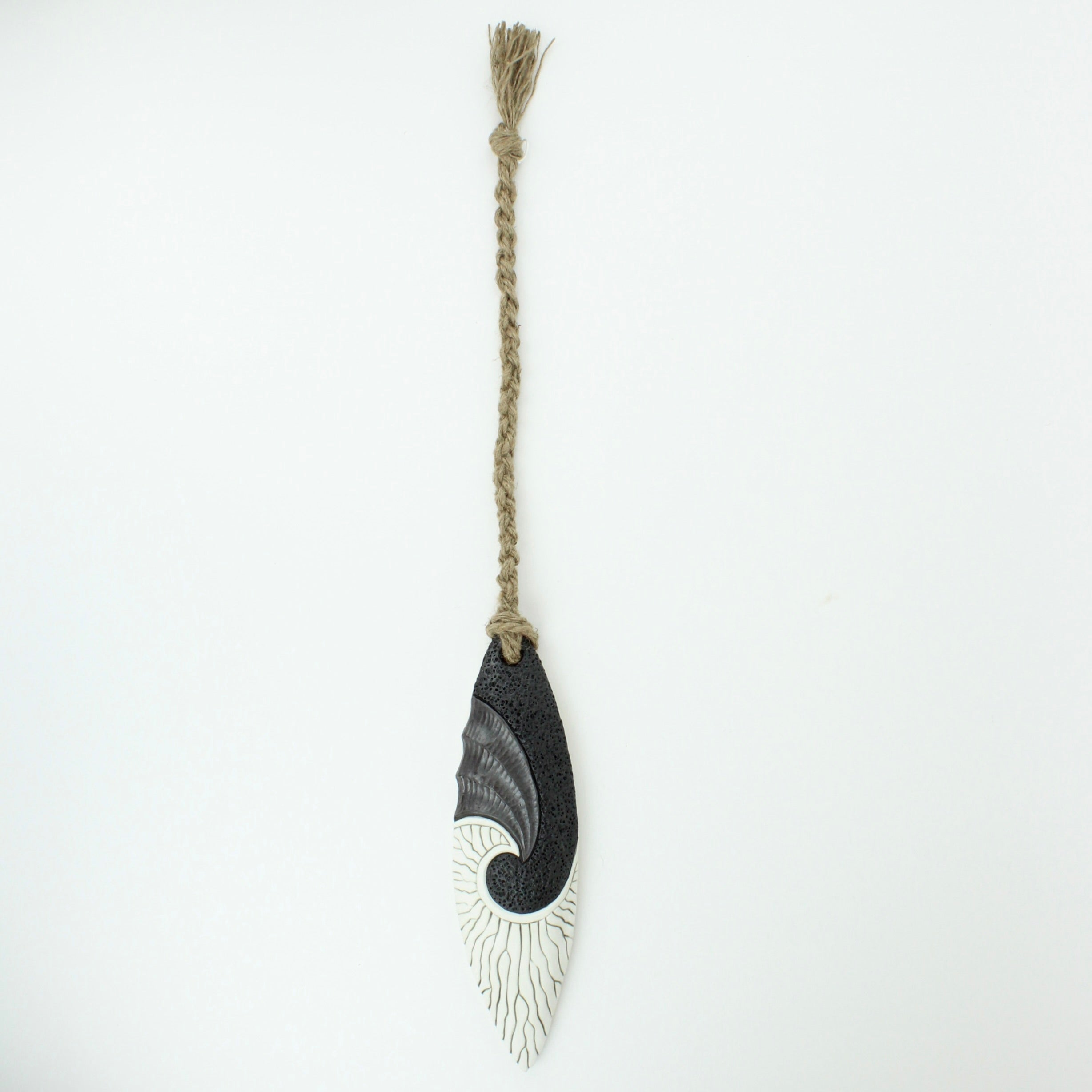 Organic ceramic wall hanging with a New Zealand flavour.nA discreet lope is secured at the top of the knotted four plait rope to enable the sculpture to be easily hung on a small picture hook or pin nail.