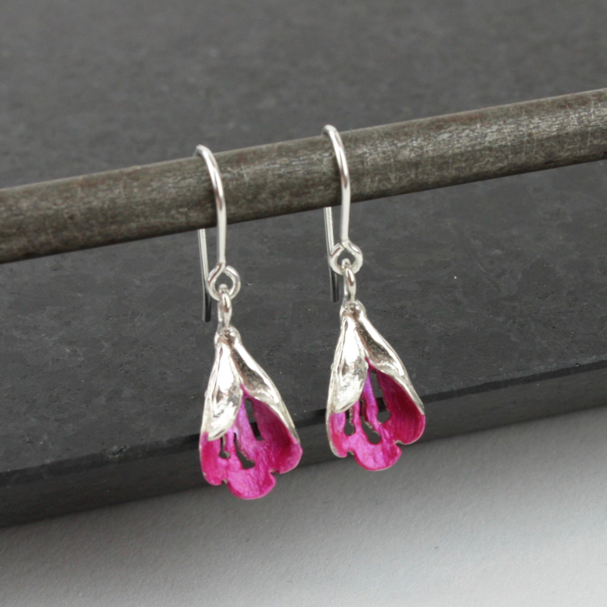 Sterling silver tubular 18mm x 10mm flowers, hand painted with porcelain paint in an ombre of dark to lighter pinks. Tiny detailed leaves adorn the reverse of the flowers. Hanging from sterling silver ear hooks.