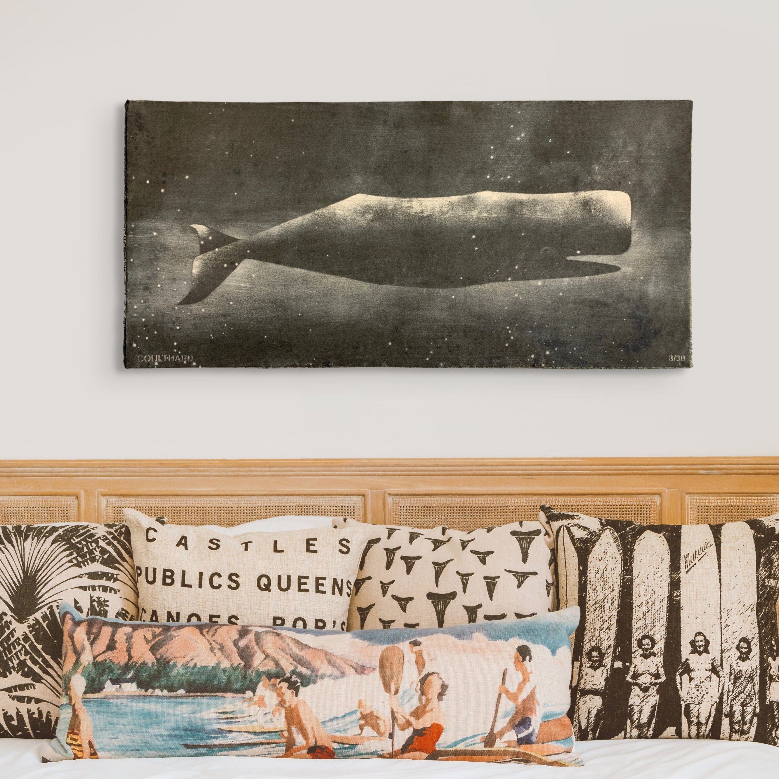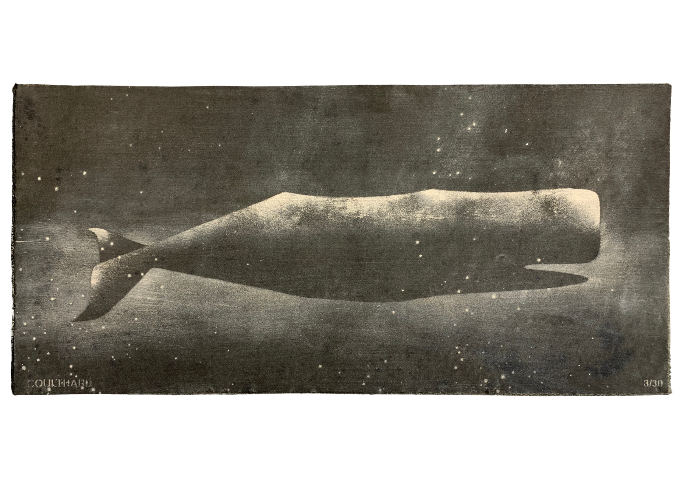 Paula Coulthard’s Small Heavy Whale series follows the same whale design across each work, yet no two are ever identical. Painted using a stencil and then scrubbed with water over gravel, the process creates variations in splashes, textures and atmosphere, allowing each piece to subtly differ while the whale form remains constant.