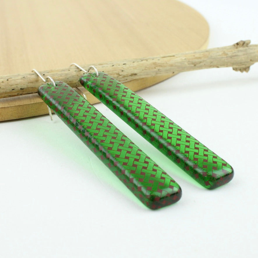 Recycled glass with kiln iron fused print inspired by woven flax on recycled sterling silver hooks