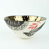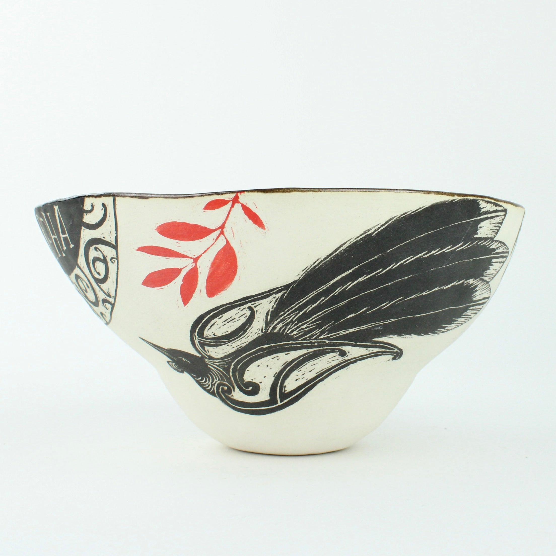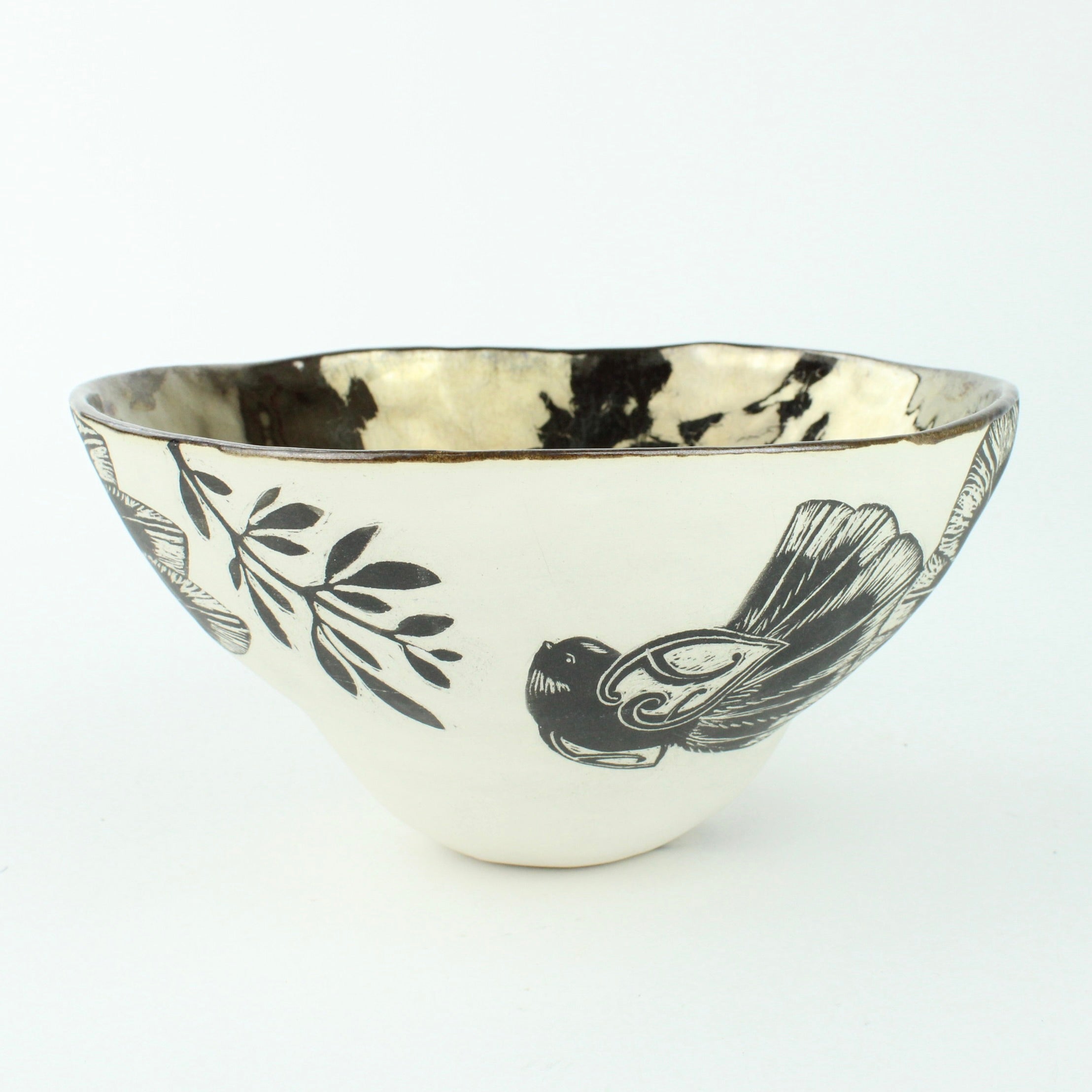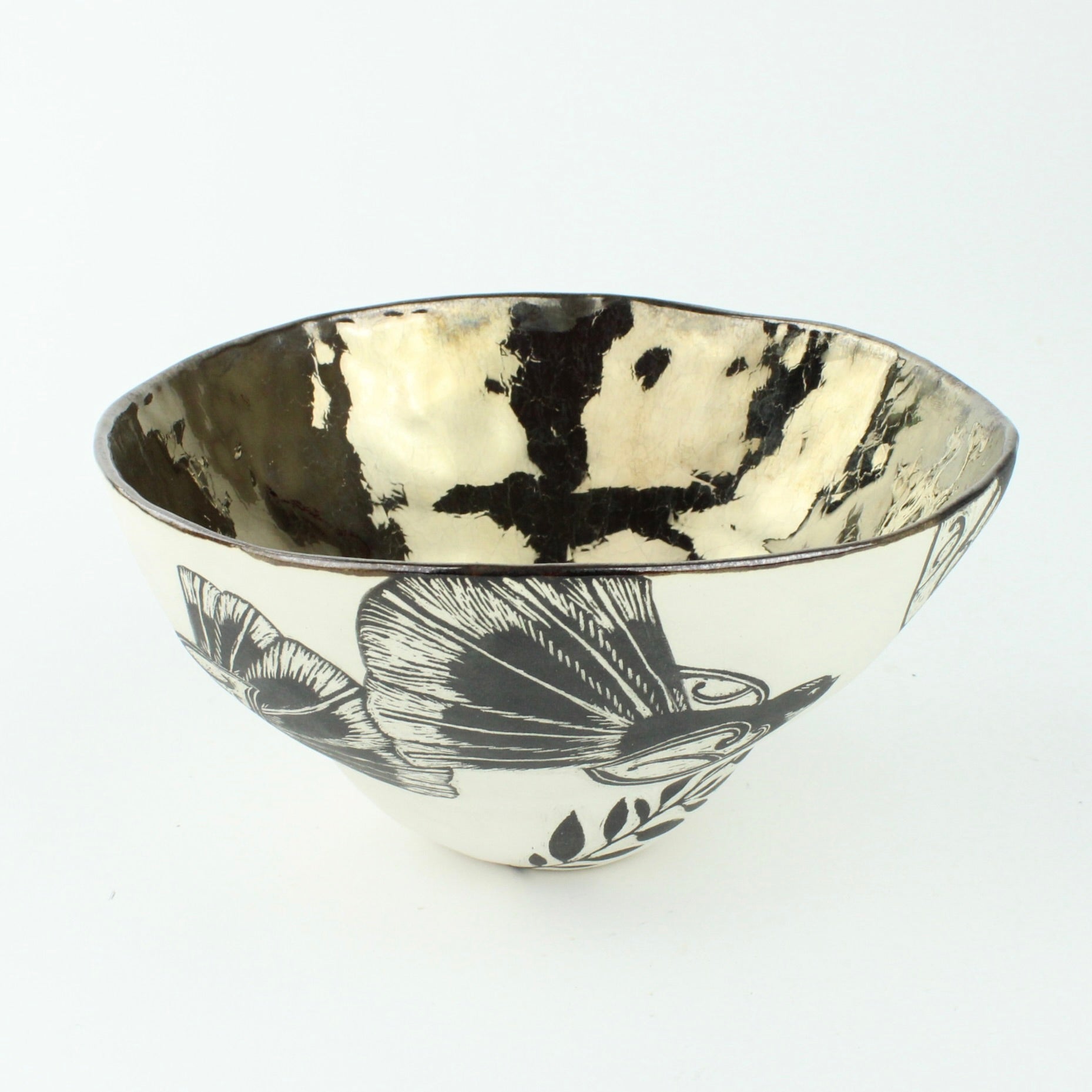 Handcrafted using traditional slab and coil techniques, this organically formed bowl features hand-painted sgraffito detailing and a fired-on golden interior.
