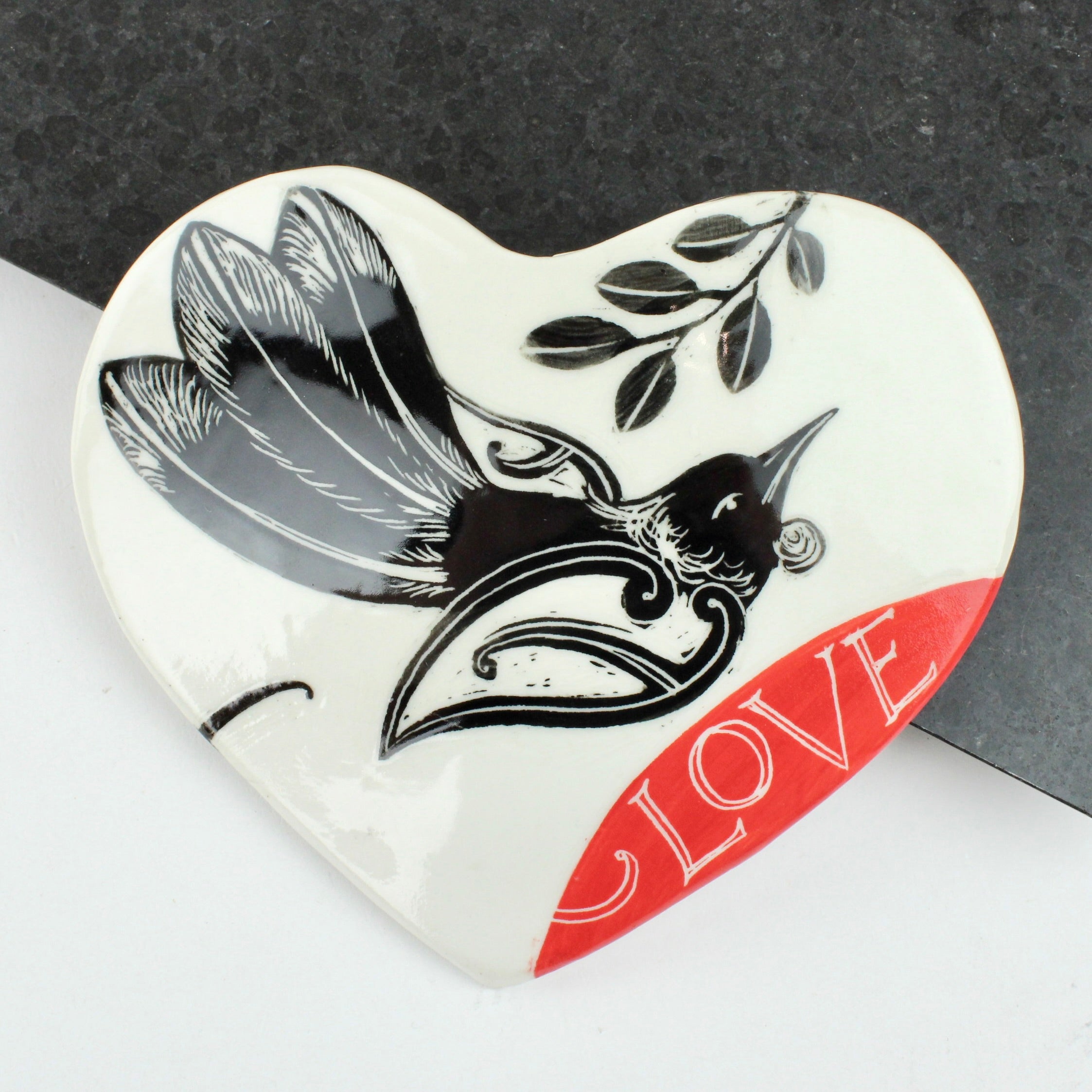 Handcrafted and painted ceramic wall hung heart with sgraffito detailing