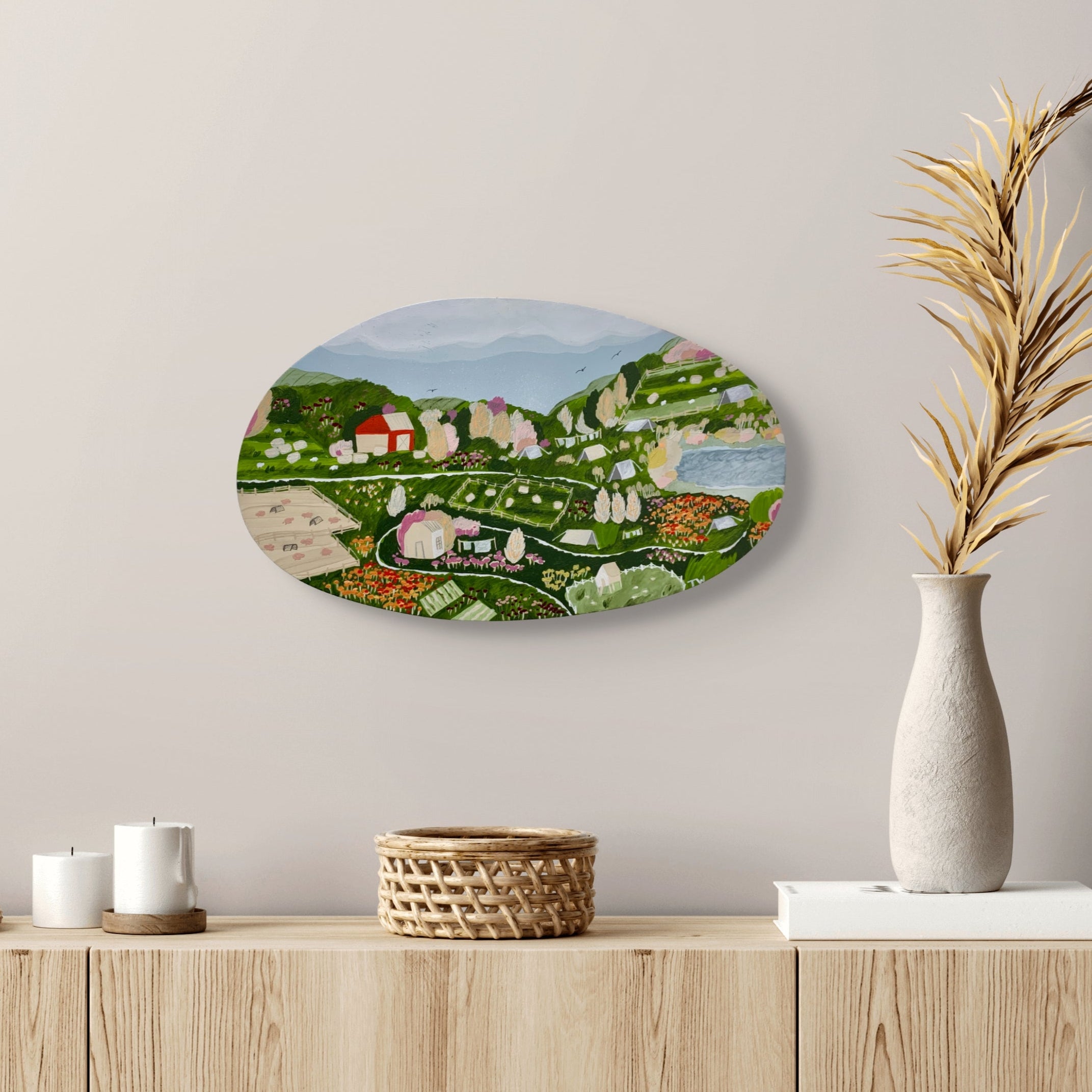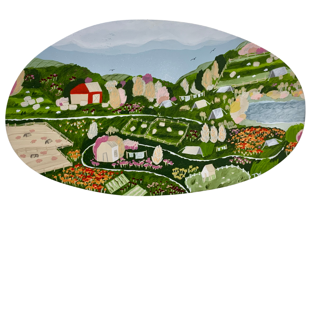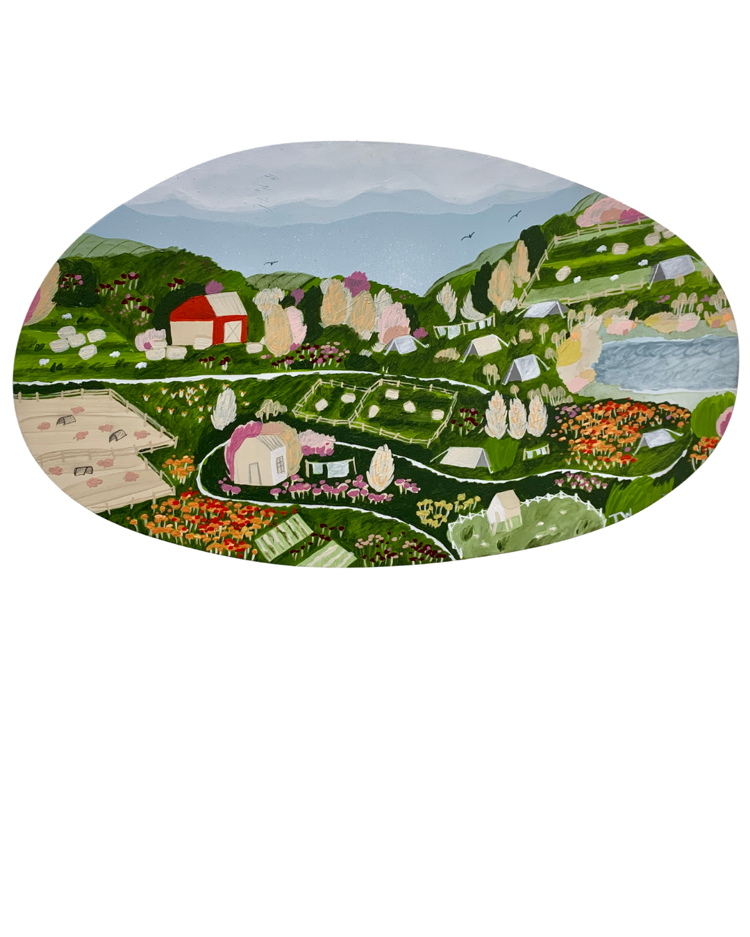Tracy Watson is celebrated for her delicate, illustrative landscapes that weave together seasonal colour palettes and simplified forms. Drawing deep inspiration from her surroundings—from rural fields dotted with hay bales and huts to lush wildflower meadows—she crafts original acrylic and mixed-media works that feel both intimate and vibrant.