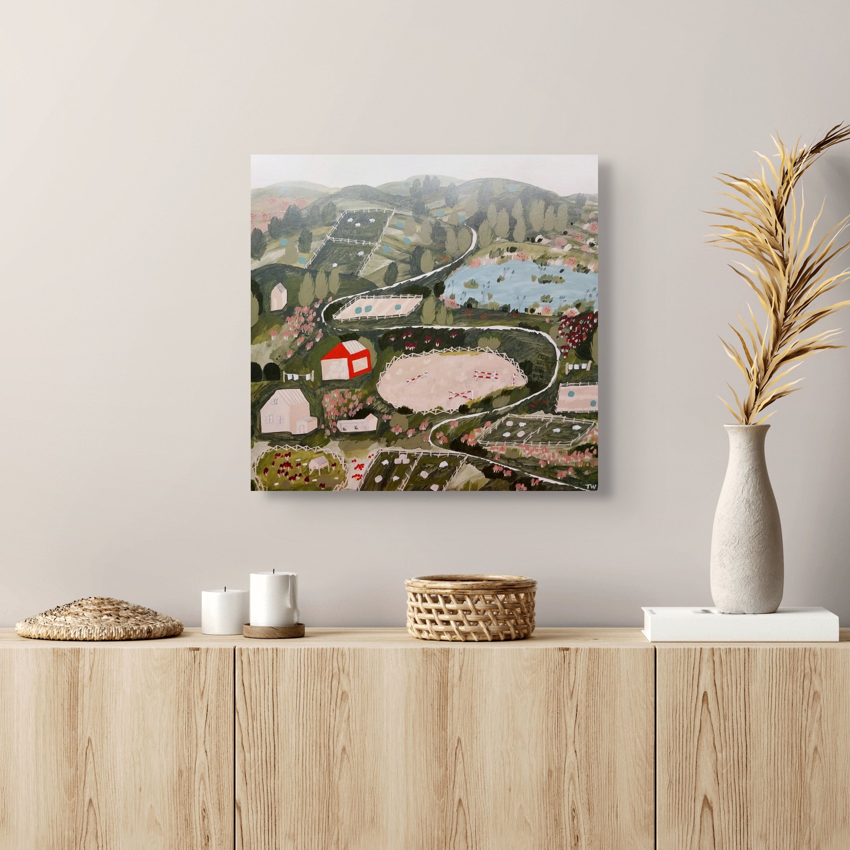 Tracy Watson is celebrated for her delicate, illustrative landscapes that weave together seasonal colour palettes and simplified forms. Drawing deep inspiration from her surroundings—from rural fields dotted with hay bales and huts to lush wildflower meadows—she crafts original acrylic and mixed-media works that feel both intimate and vibrant.