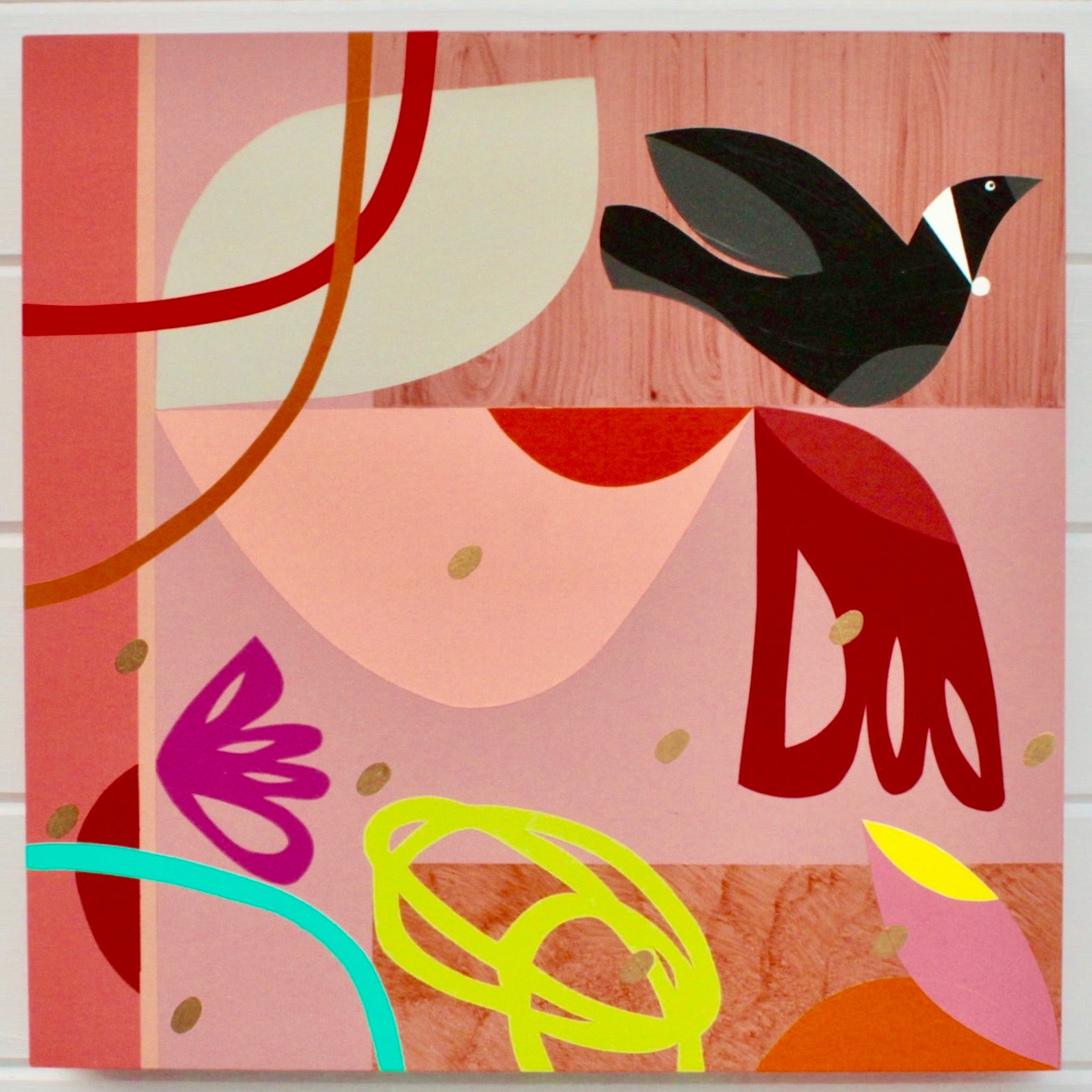 Annie Smits Sandano's native bird series combines her abstract form-based style explored in her wood cut prints. A new approach to making paintings which were rooted in figurative elements of New Zealand iconography culture.