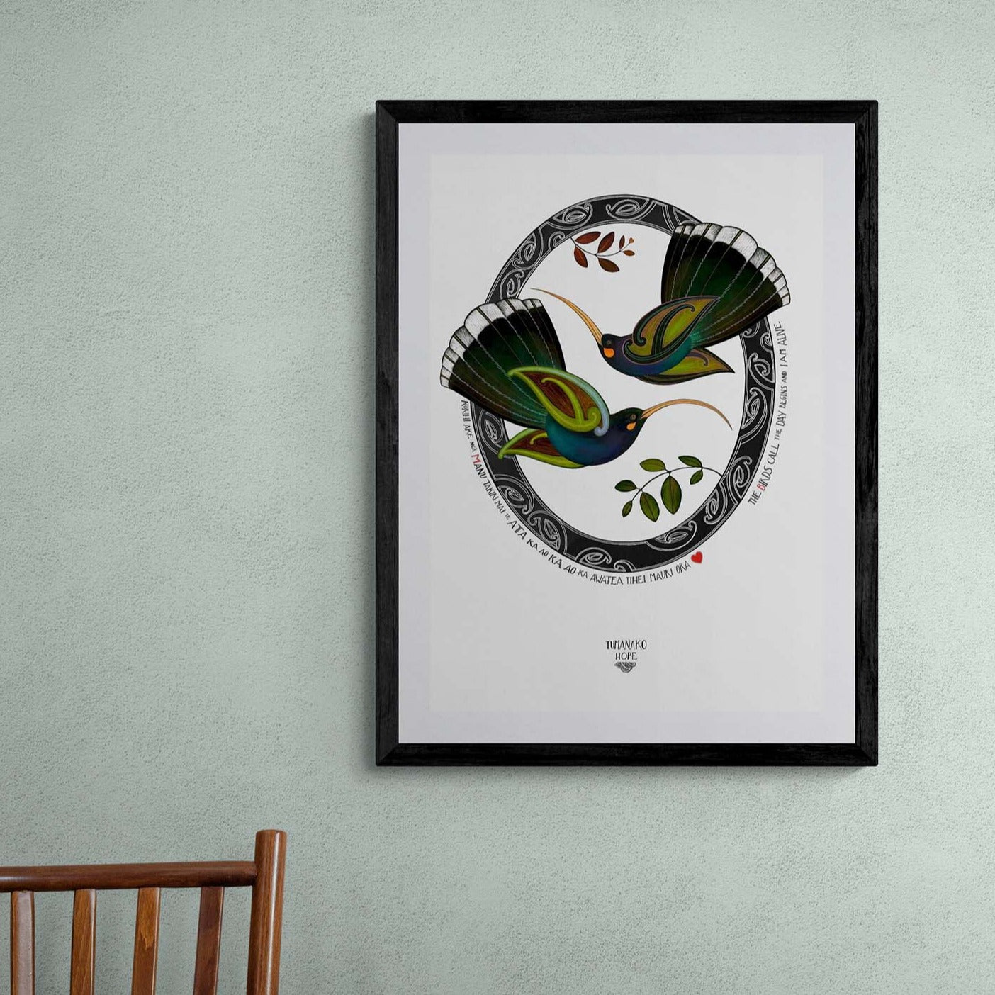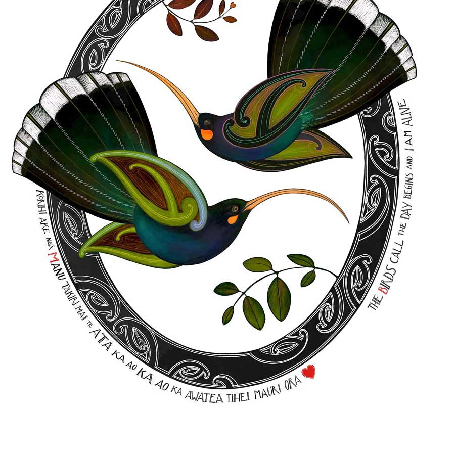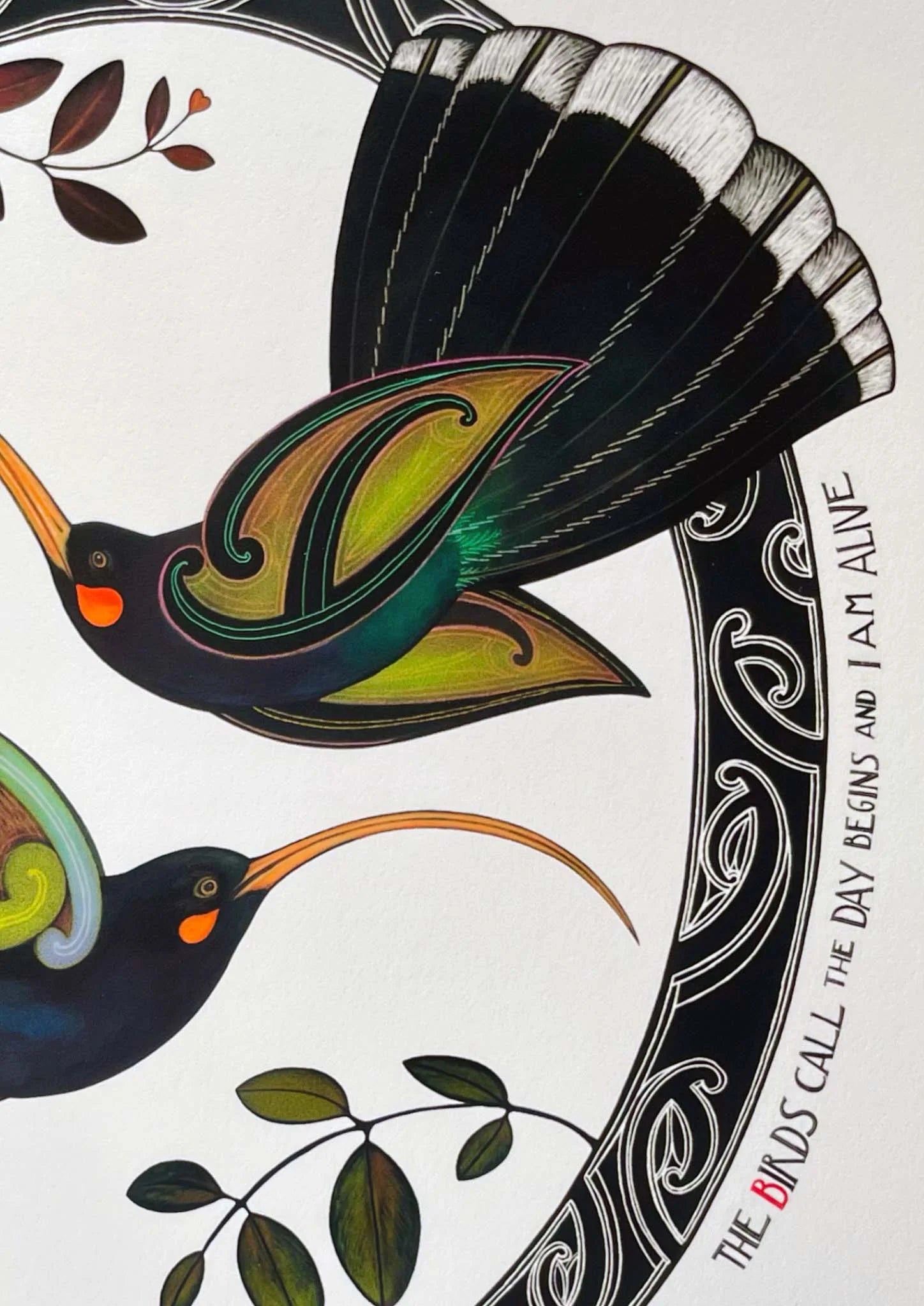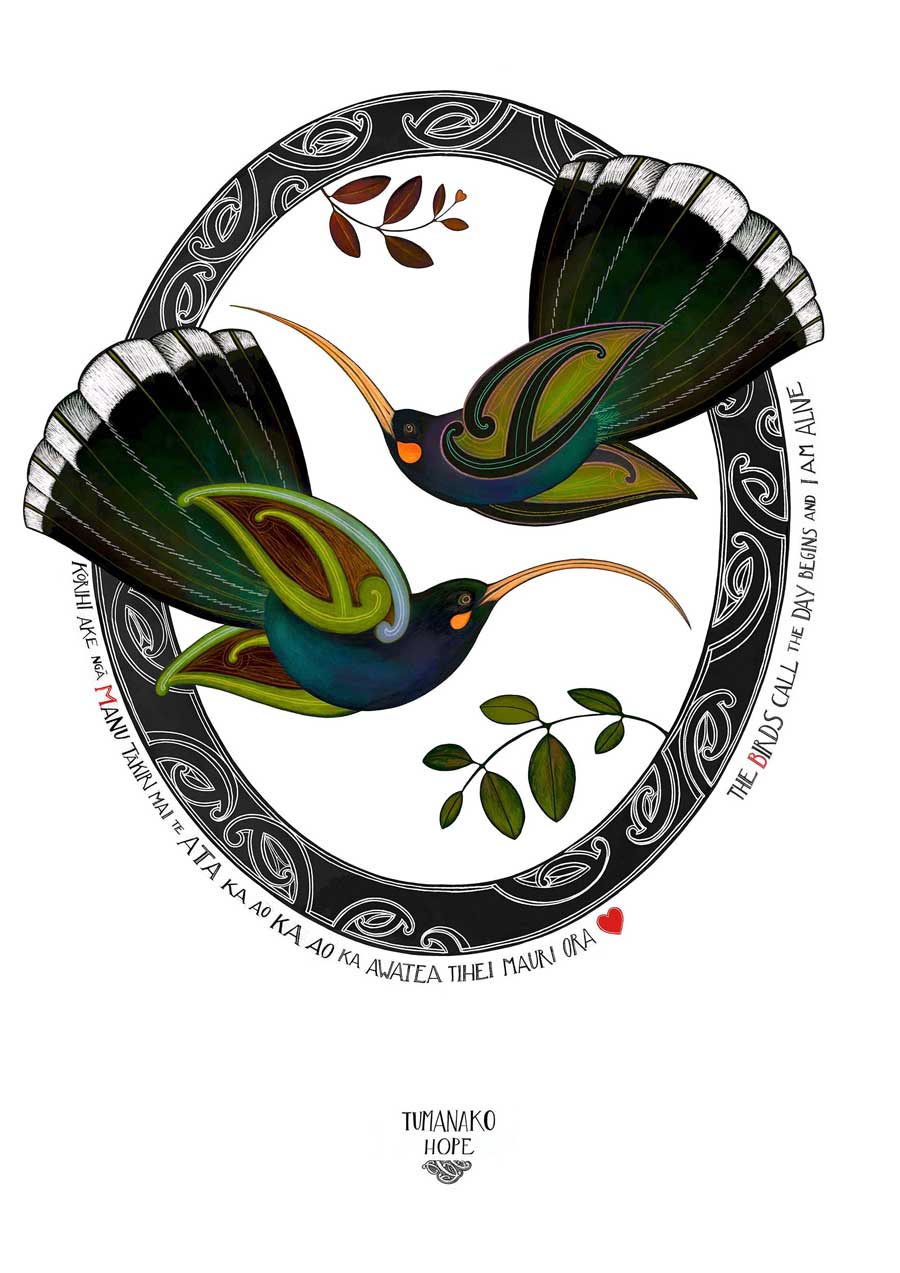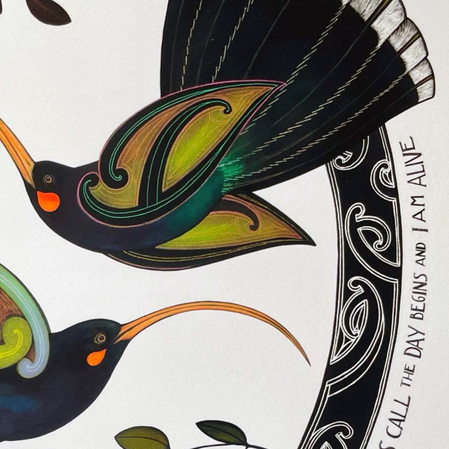 Tumanako is Hope - Beautifully coloured Huia fly, the dawn chorus a reminder that each new day holds the promise of a fresh start. This is a print of hope, every day is a new beginning.