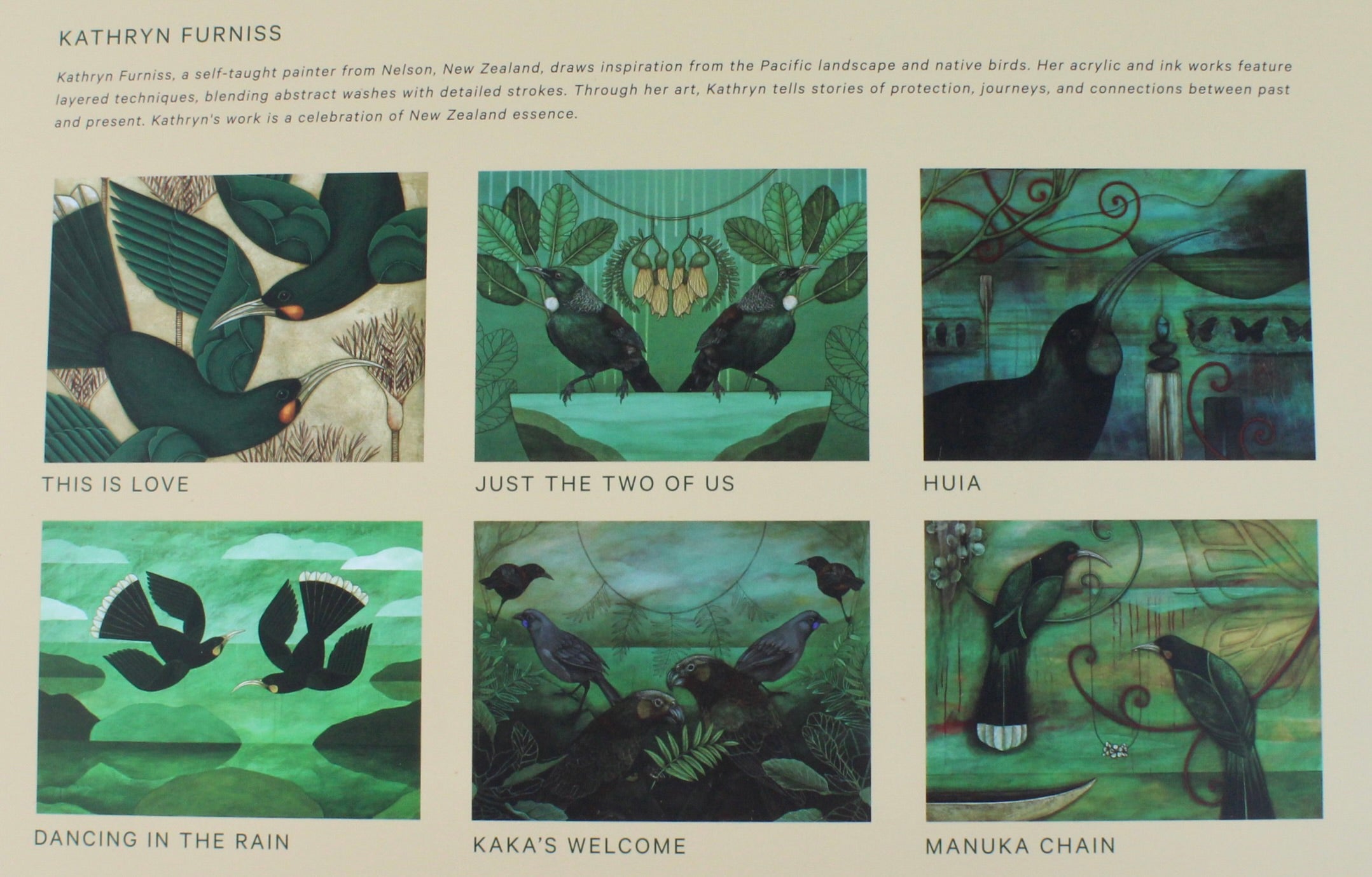 Kathryn Furniss, a self-taught painter from Nelson, New Zealand, draws inspiration from the Pacific landscape and native birds. Her acrylic and ink works feature layered techniques, blending abstract washes with detailed strokes. Through her art, Kathryn tells stories of protection, journeys, and connections between past and present. Kathryn's work is a celebration of New Zealand essence.