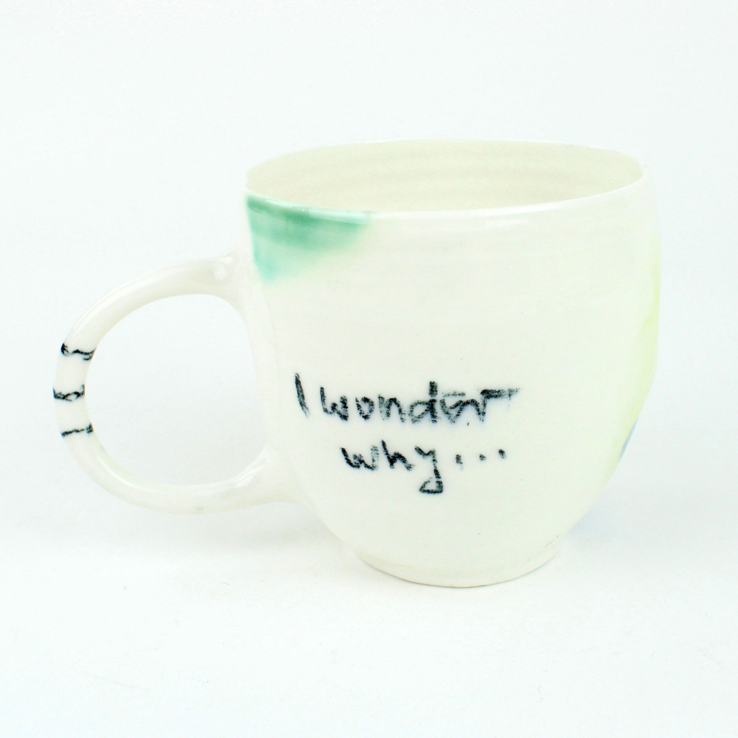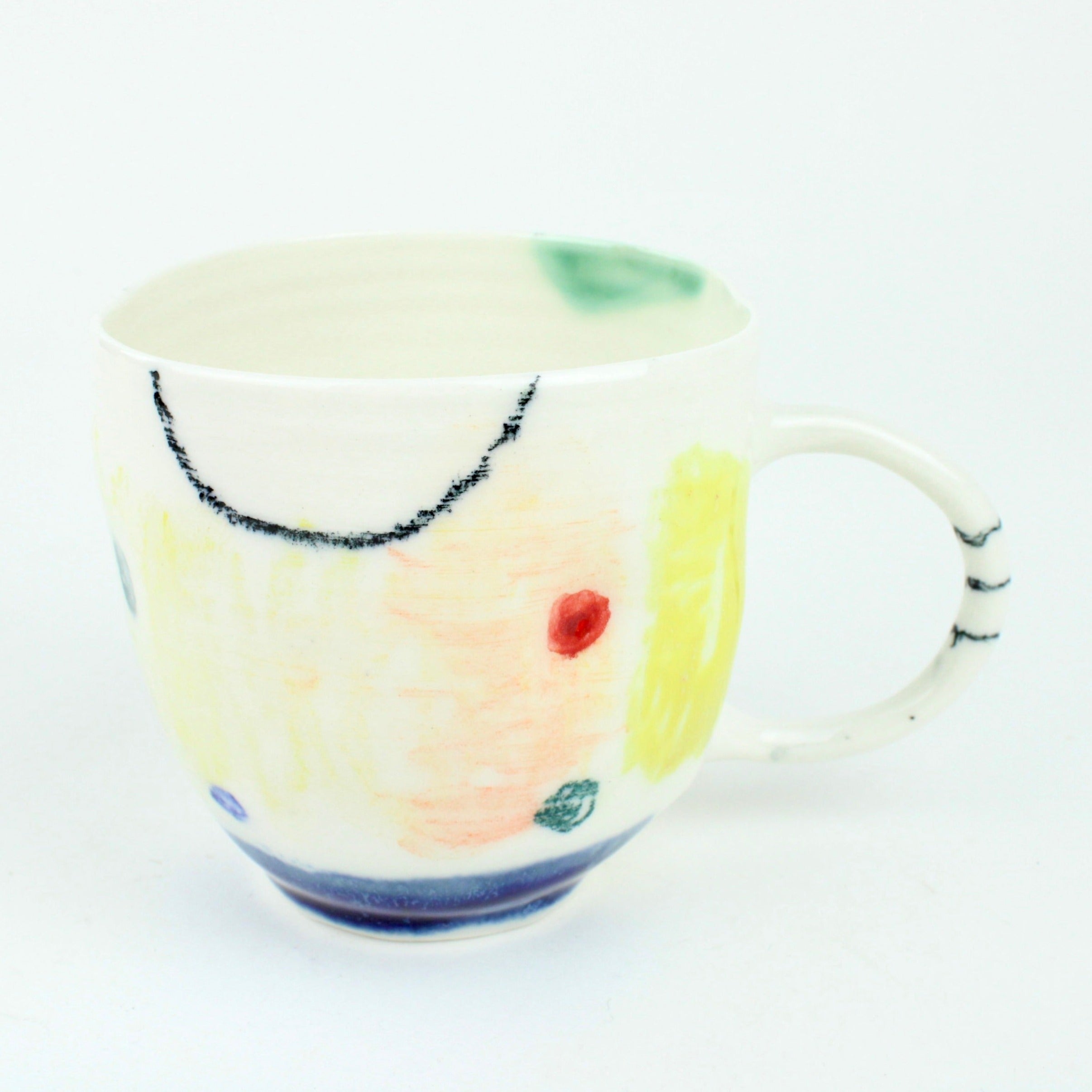 Recently she had an order for cups which were meant to be “crazy, splashy, dotty, and colourful" with stripy handles. After making them, Marion realised she liked the drawing she did with coloured pencils much better. So she made herself something vaguely resembling ceramic pencils and toned down the colours and made them less busy. Marion used dark stoneware clay dipped in white slip to achieve a crackle, and some are very fine porcelain.