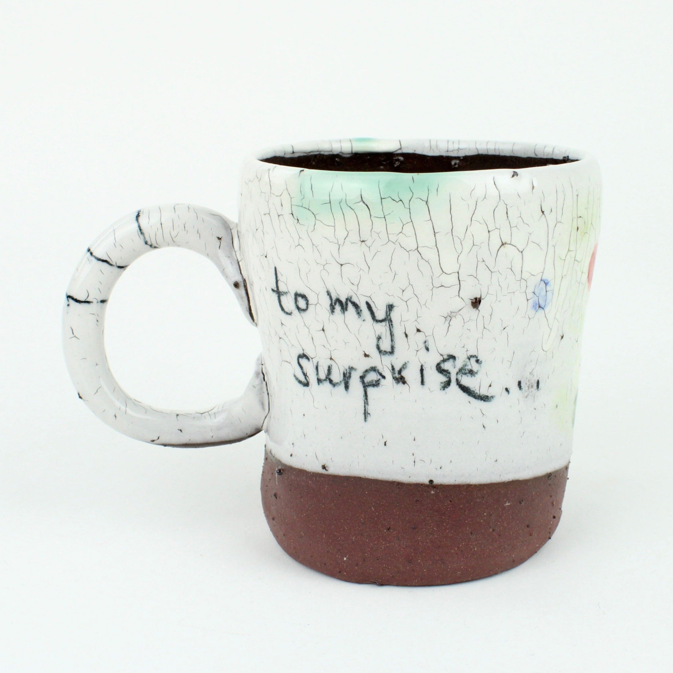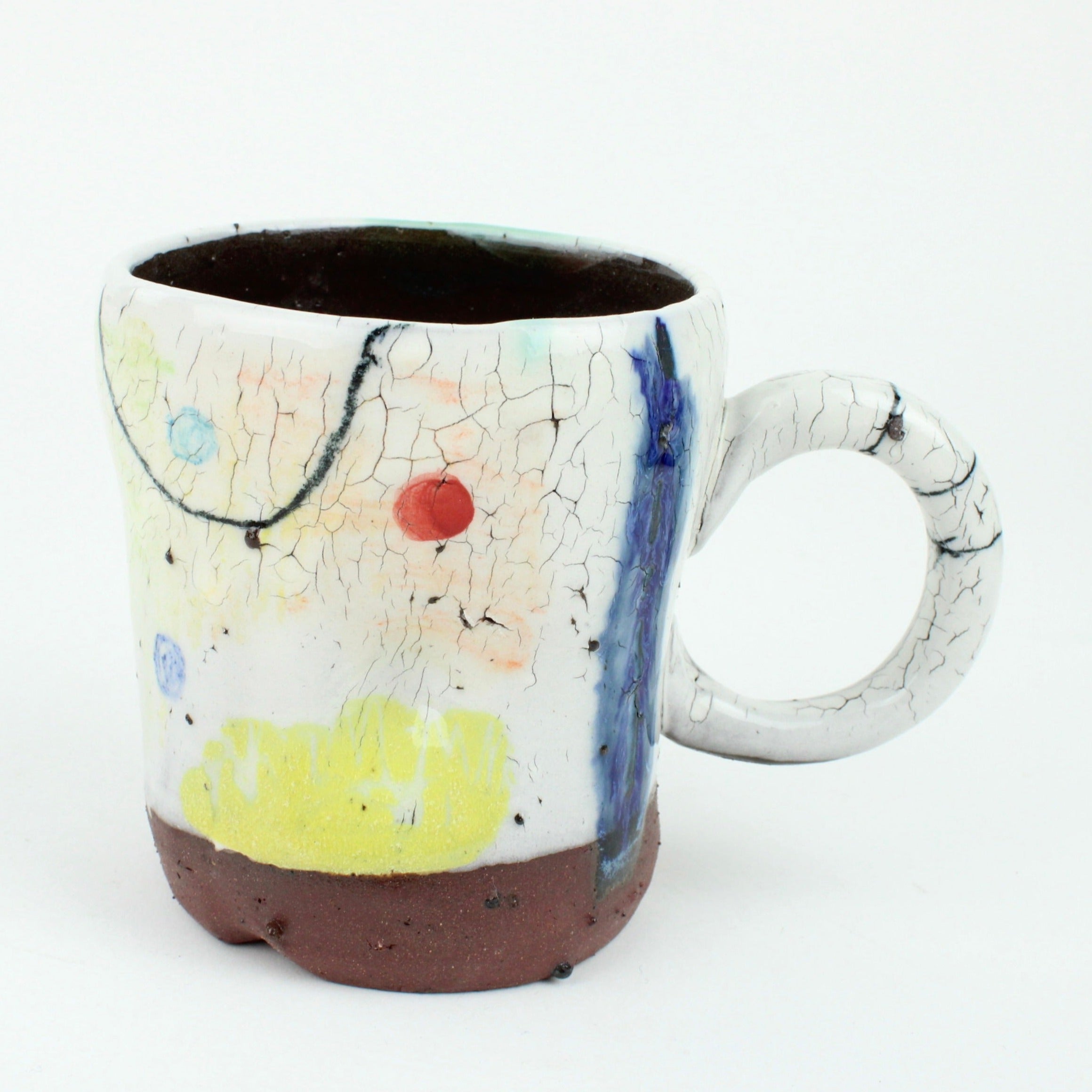 Recently she had an order for cups which were meant to be “crazy, splashy, dotty, and colourful" with stripy handles. After making them, Marion realised she liked the drawing she did with coloured pencils much better. So she made herself something vaguely resembling ceramic pencils and toned down the colours and made them less busy. Marion used dark stoneware clay dipped in white slip to achieve a crackle, and some are very fine porcelain.