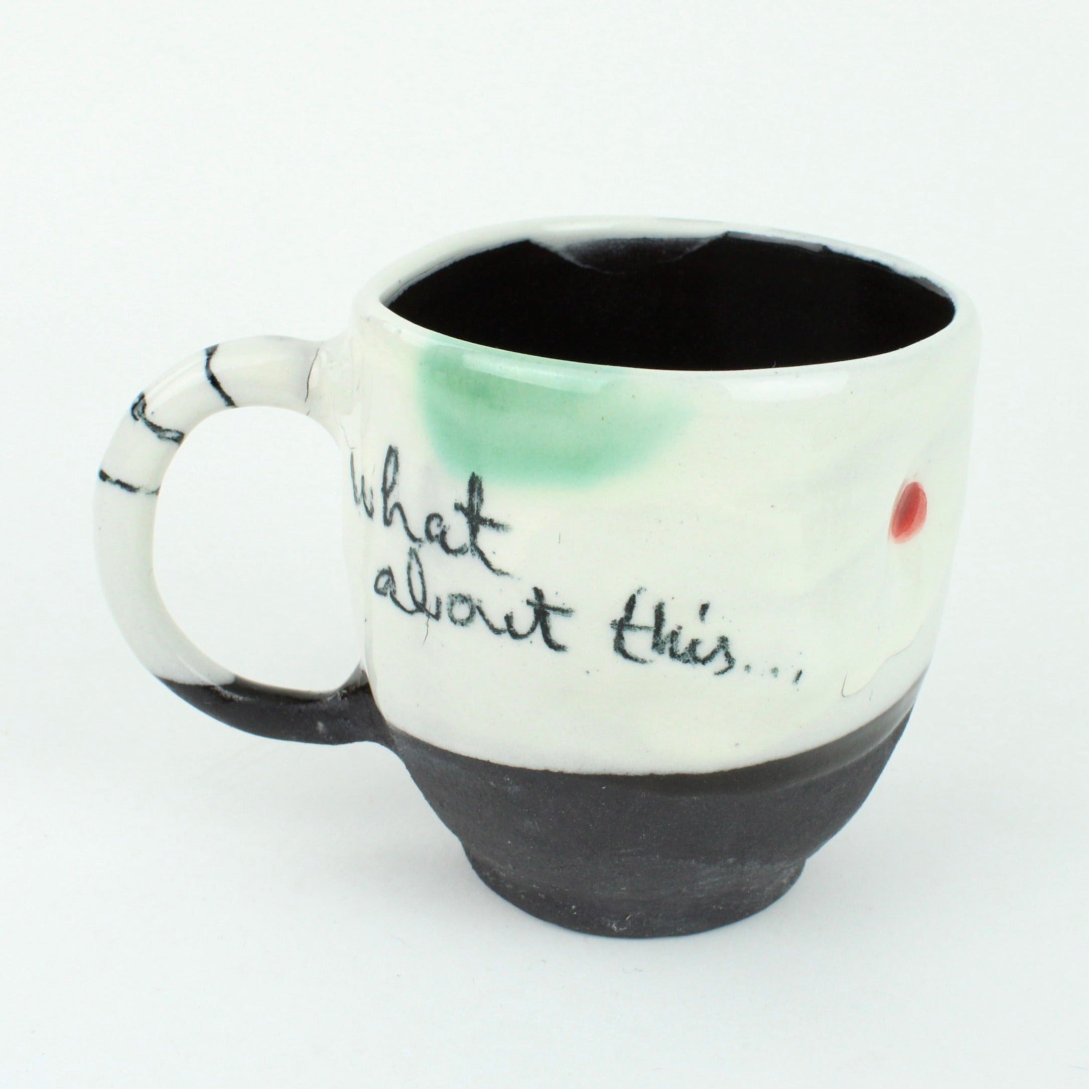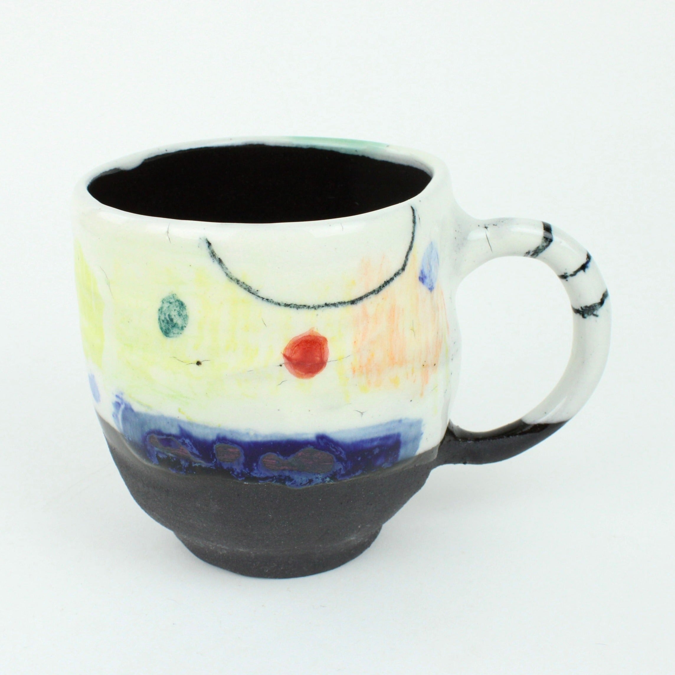Recently she had an order for cups which were meant to be “crazy, splashy, dotty, and colourful" with stripy handles. After making them, Marion realised she liked the drawing she did with coloured pencils much better. So she made herself something vaguely resembling ceramic pencils and toned down the colours and made them less busy. Marion used dark stoneware clay dipped in white slip to achieve a crackle, and some are very fine porcelain.