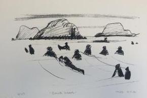 This drawing, of surfers at Back Beach, New Plymouth, 2004, has been made into a screenprint.