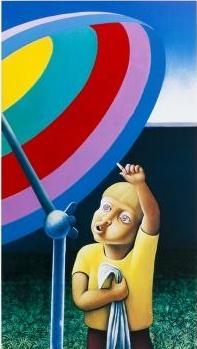 'Children often use gestures to draw our attention to special moments. This startling image of Thomas' wonder at the colours of our ordinary beach umbrella needed a painting from me to celebrate the fantasy of the moment, brought to my attention by his insistent gesture.' - Michael Smither