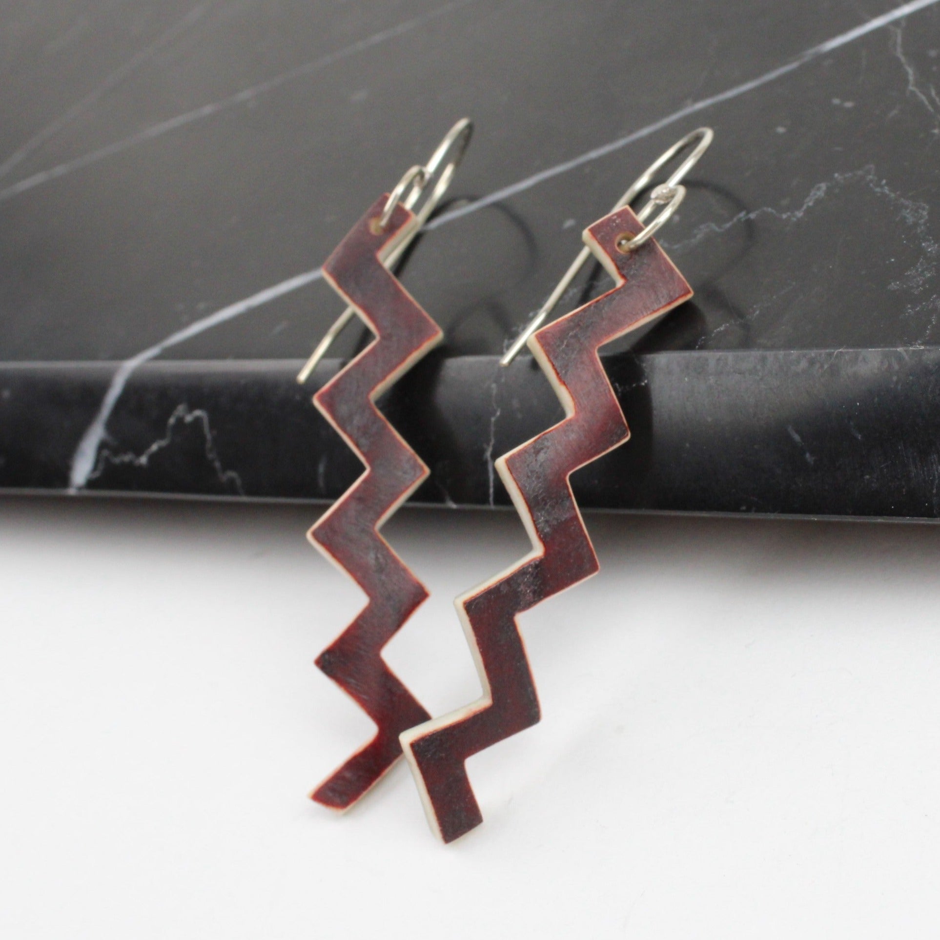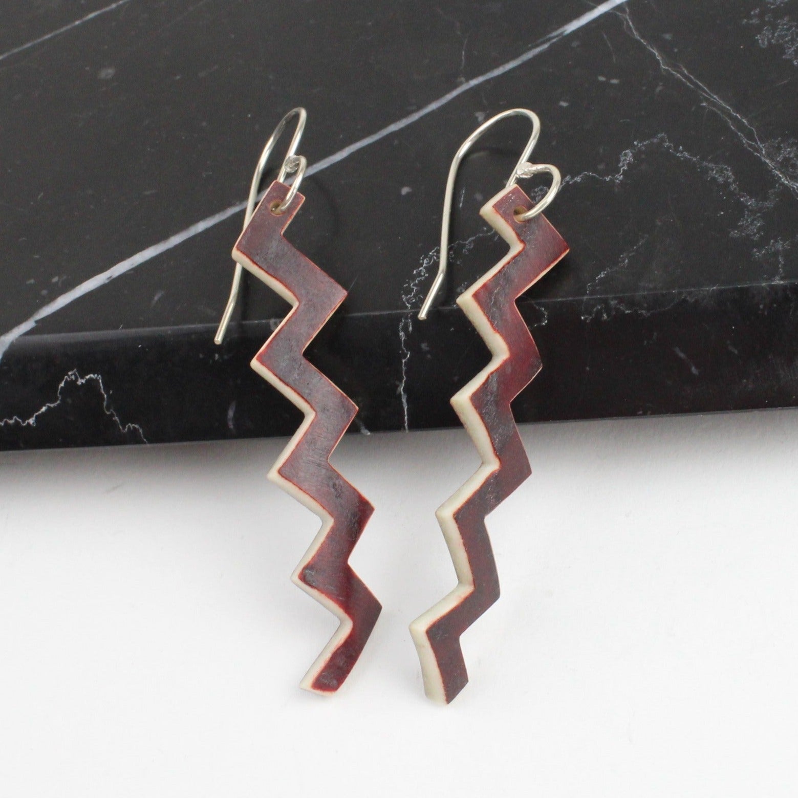 Carved, henna dyed antler and sterling silver hooks by New Zealand jeweller Rachel Lambert