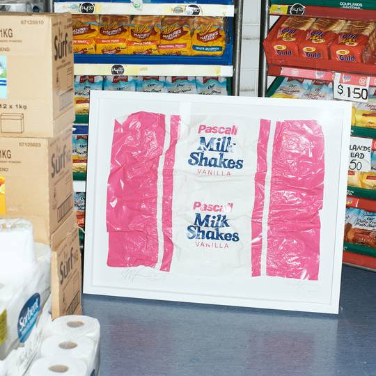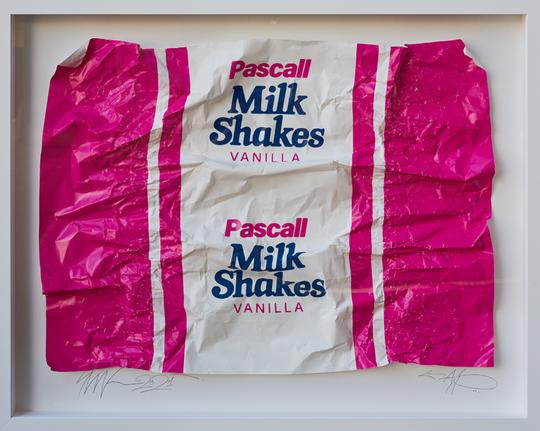 Each Milkshake is screen printed on waxed paper, and then wrapped, unwrapped and re-wrapped by Simon over the course of a few weeks. Once the print has the distinctive folds and wrinkles it's signed, numbered and framed