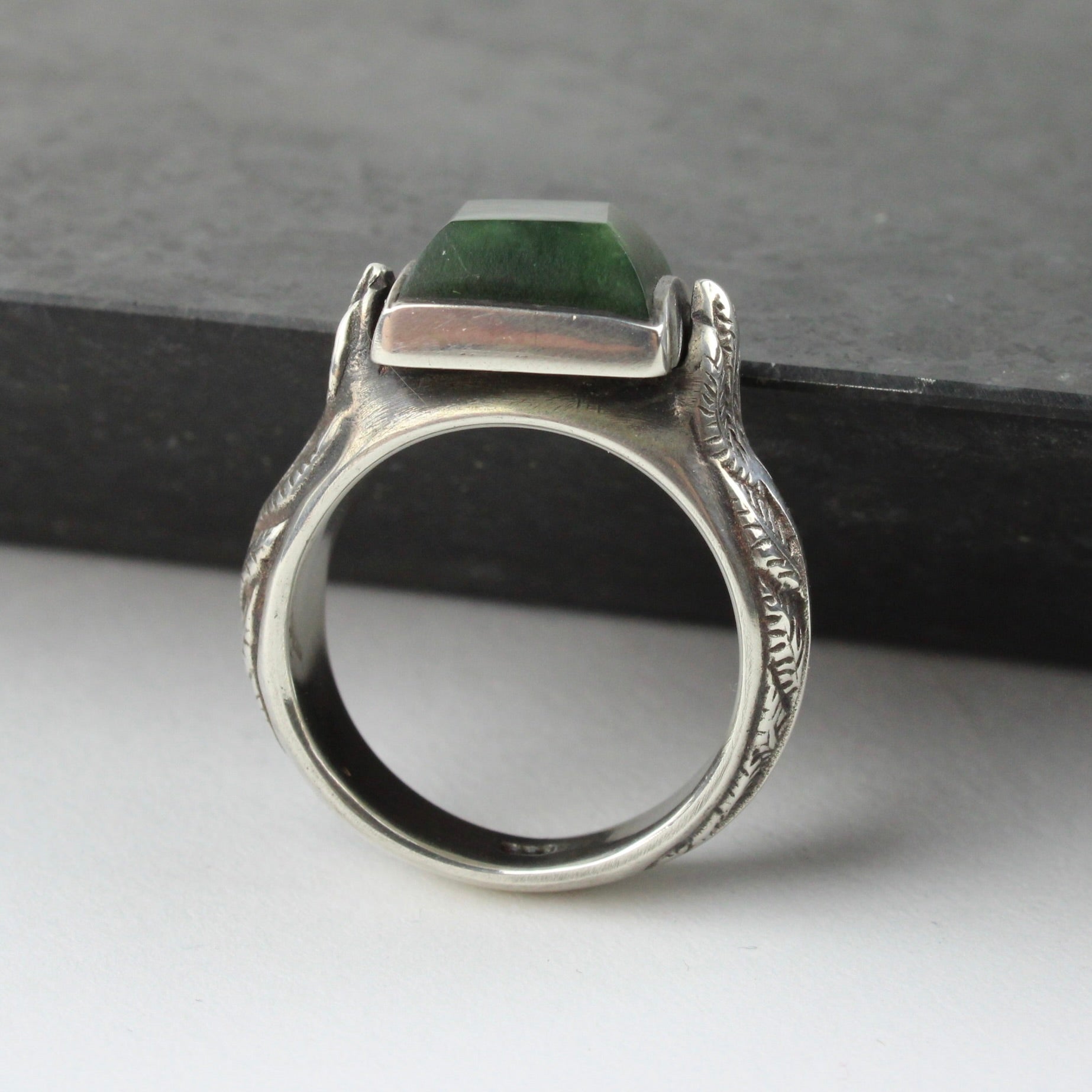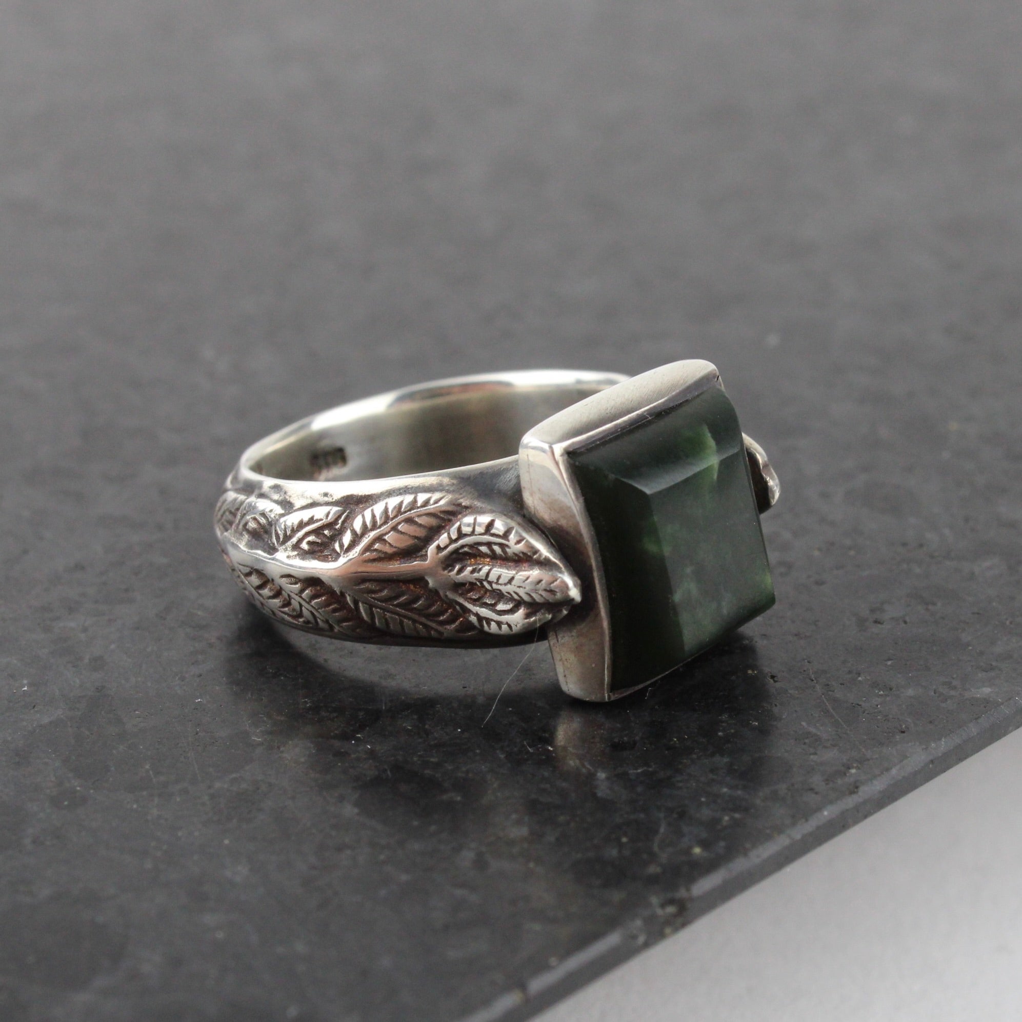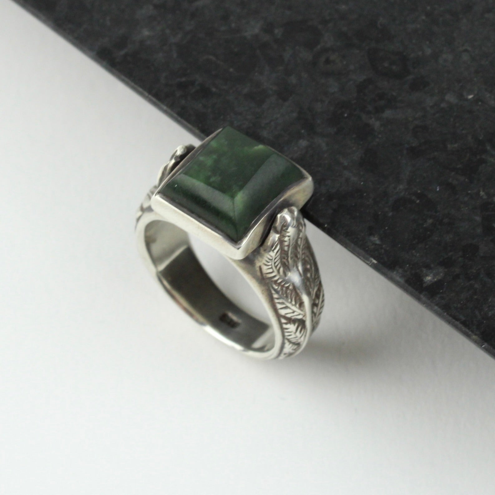 The Fern Ring is carved with delicate fern fronds reaching over the shoulders of the silver ring. Each ring is unique as the piece of pounamu set on top is individually hand cut and finished. A reminder of the precious quiet places in our bush.