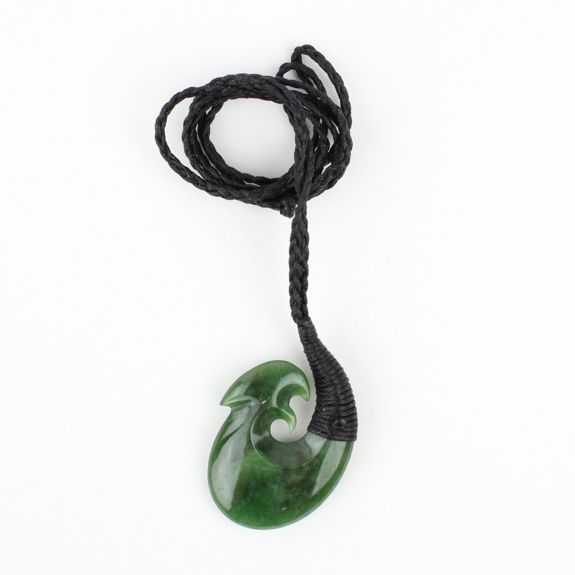 Kawakawa Pounamu Hei Matau pendant with complex binding and hand carved in New Zealand by master carver Tyson Lynes.