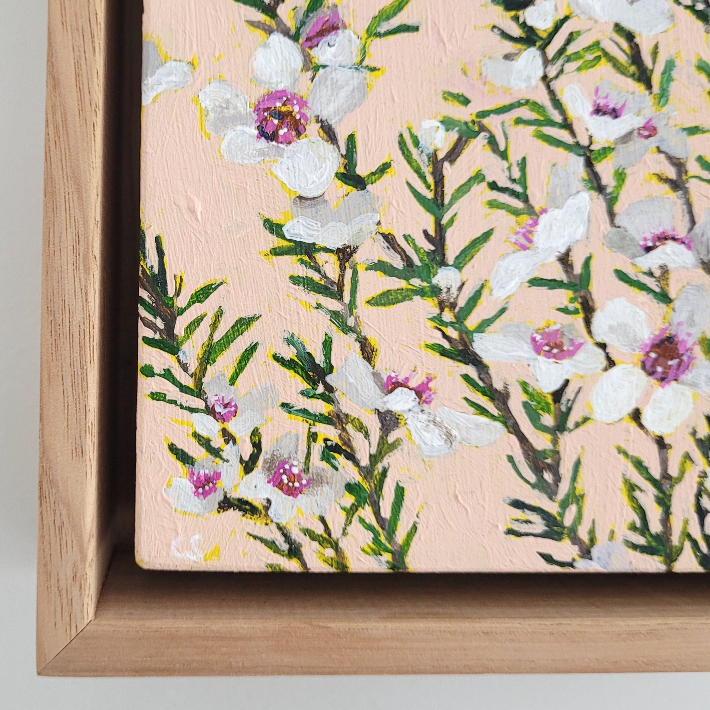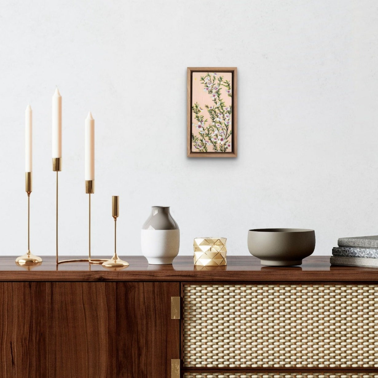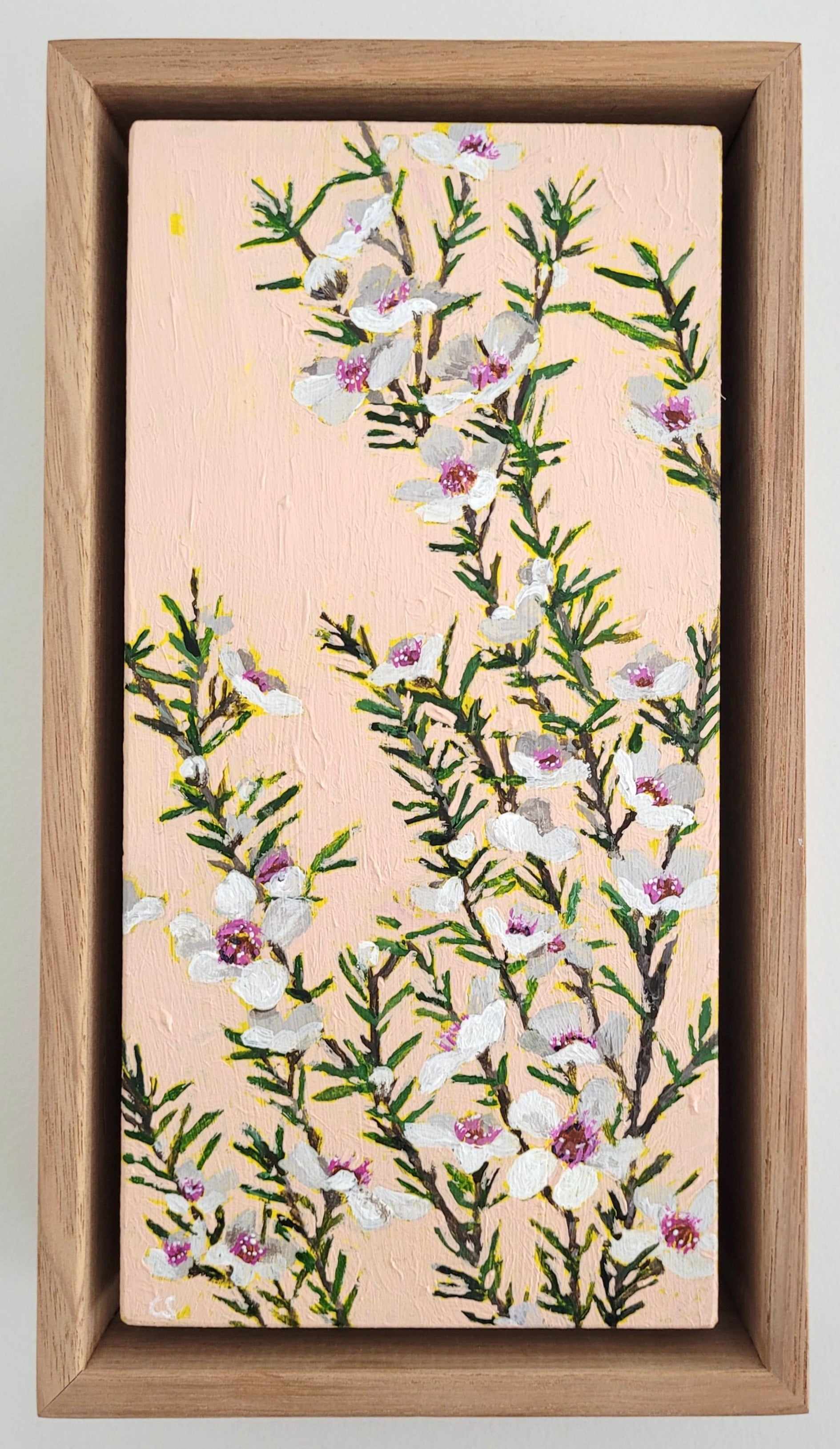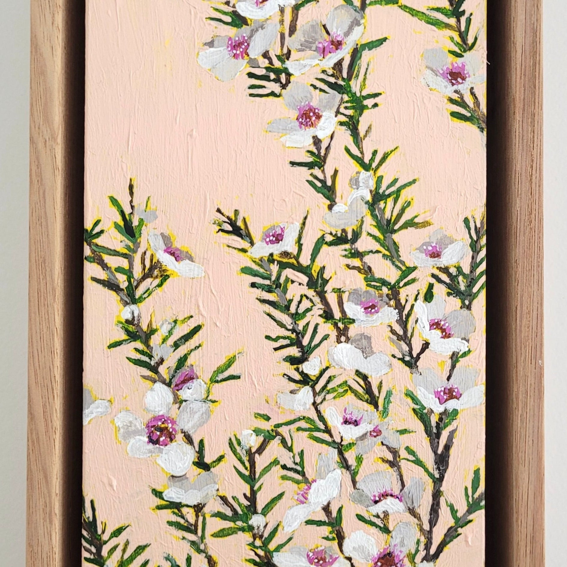 Mini Manuka I: A mini painting of tiny Manuka flowers and multiples of leaves. The mini canvas enhances the delicate nature of the flowers.