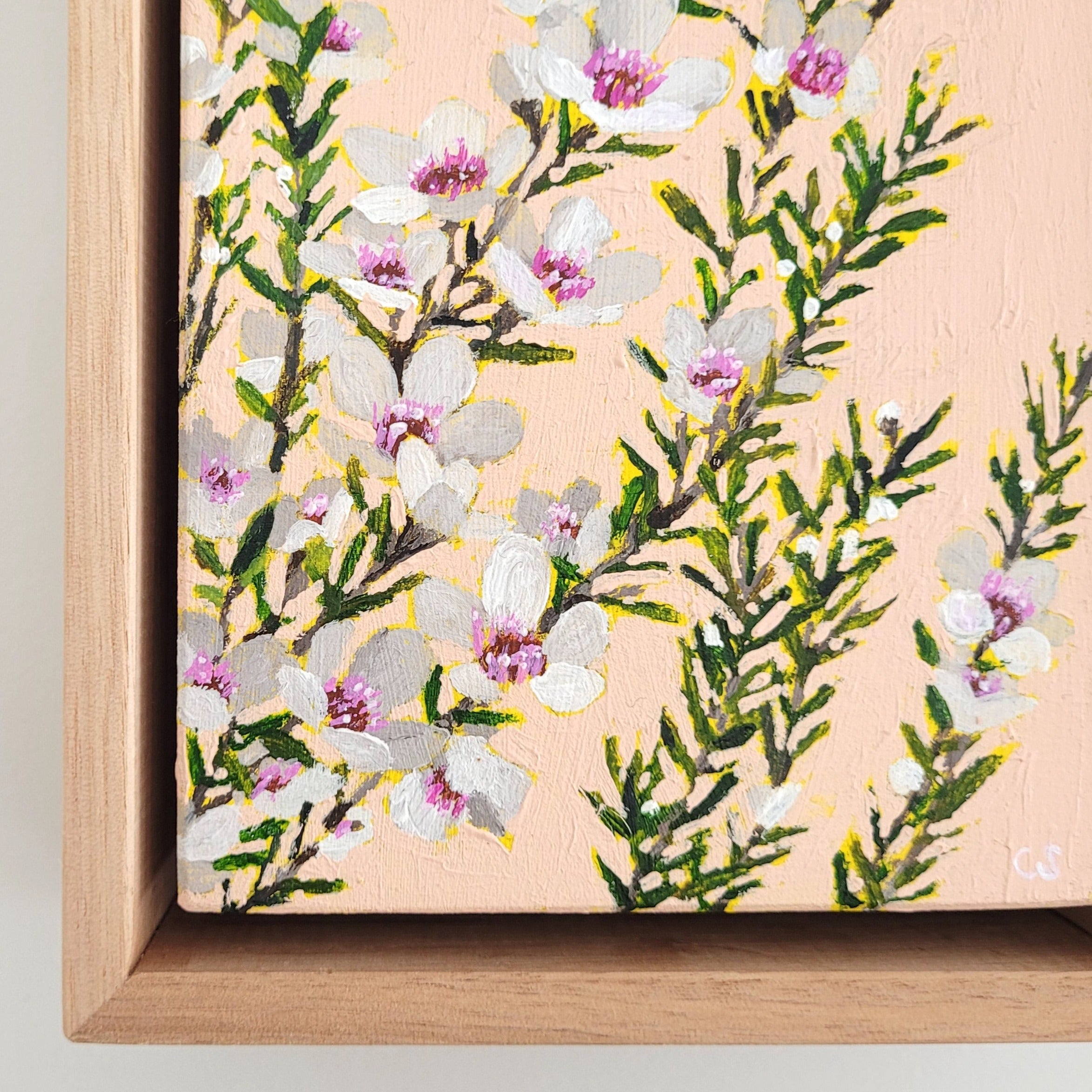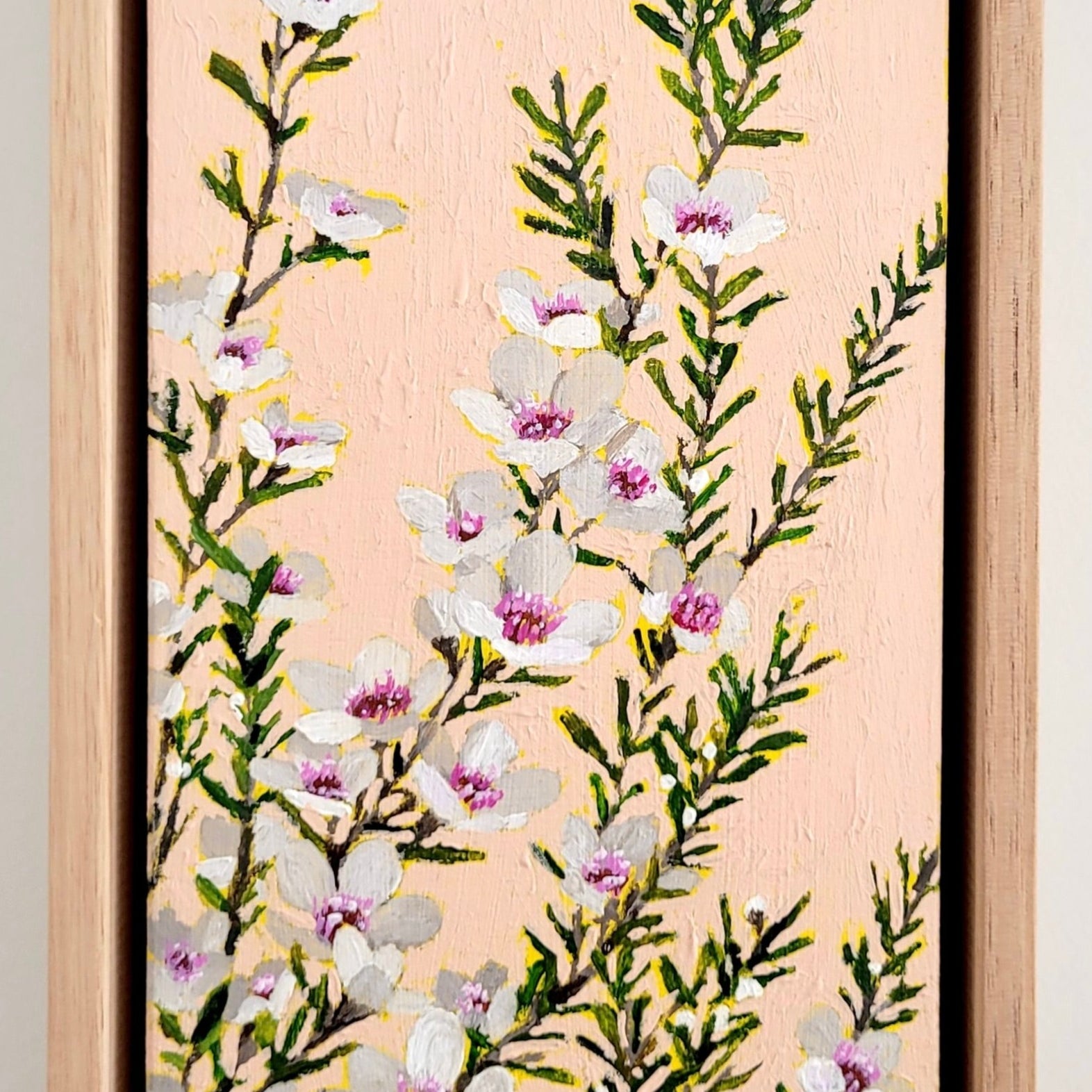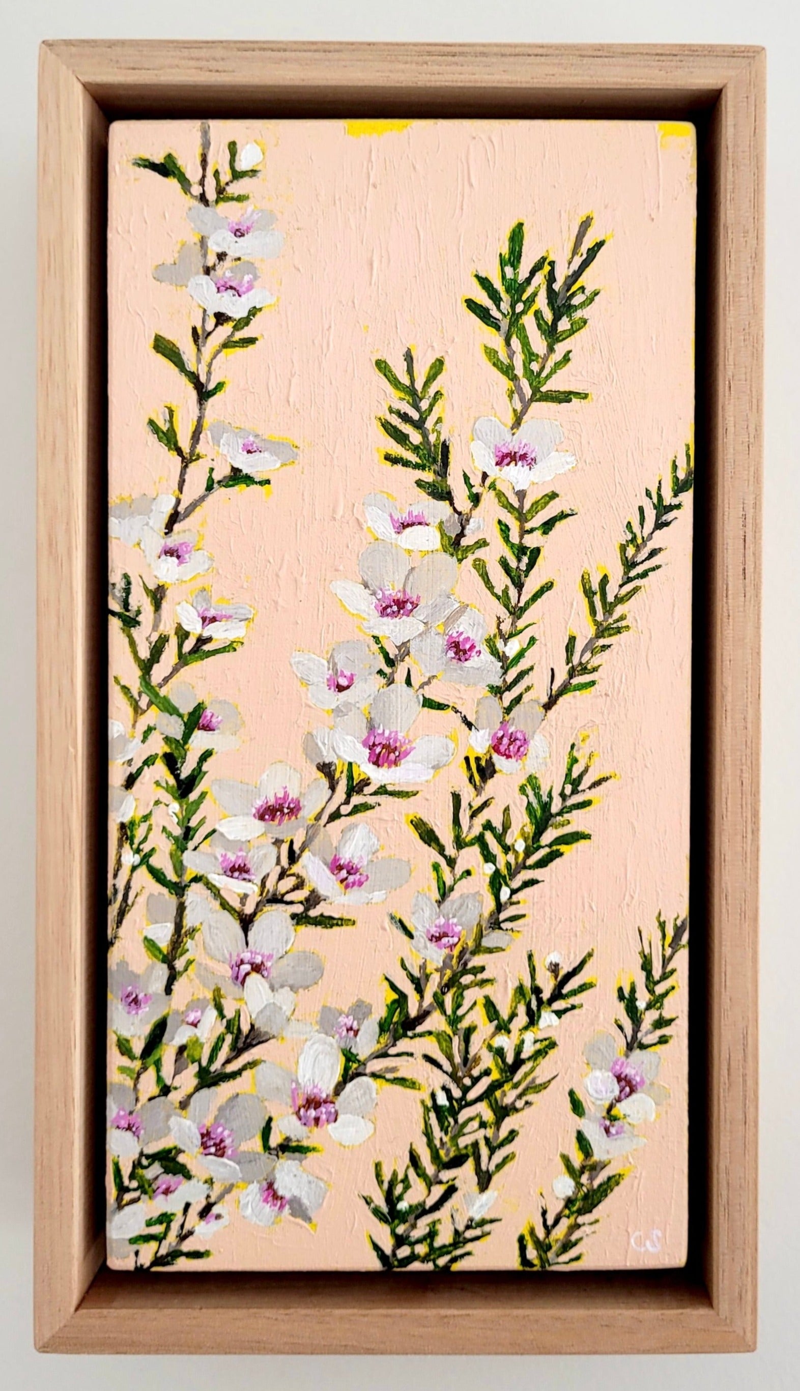 Mini Manuka III: A mini painting of tiny Manuka flowers and multiples of leaves. The mini canvas enhances the delicate nature of the flowers.