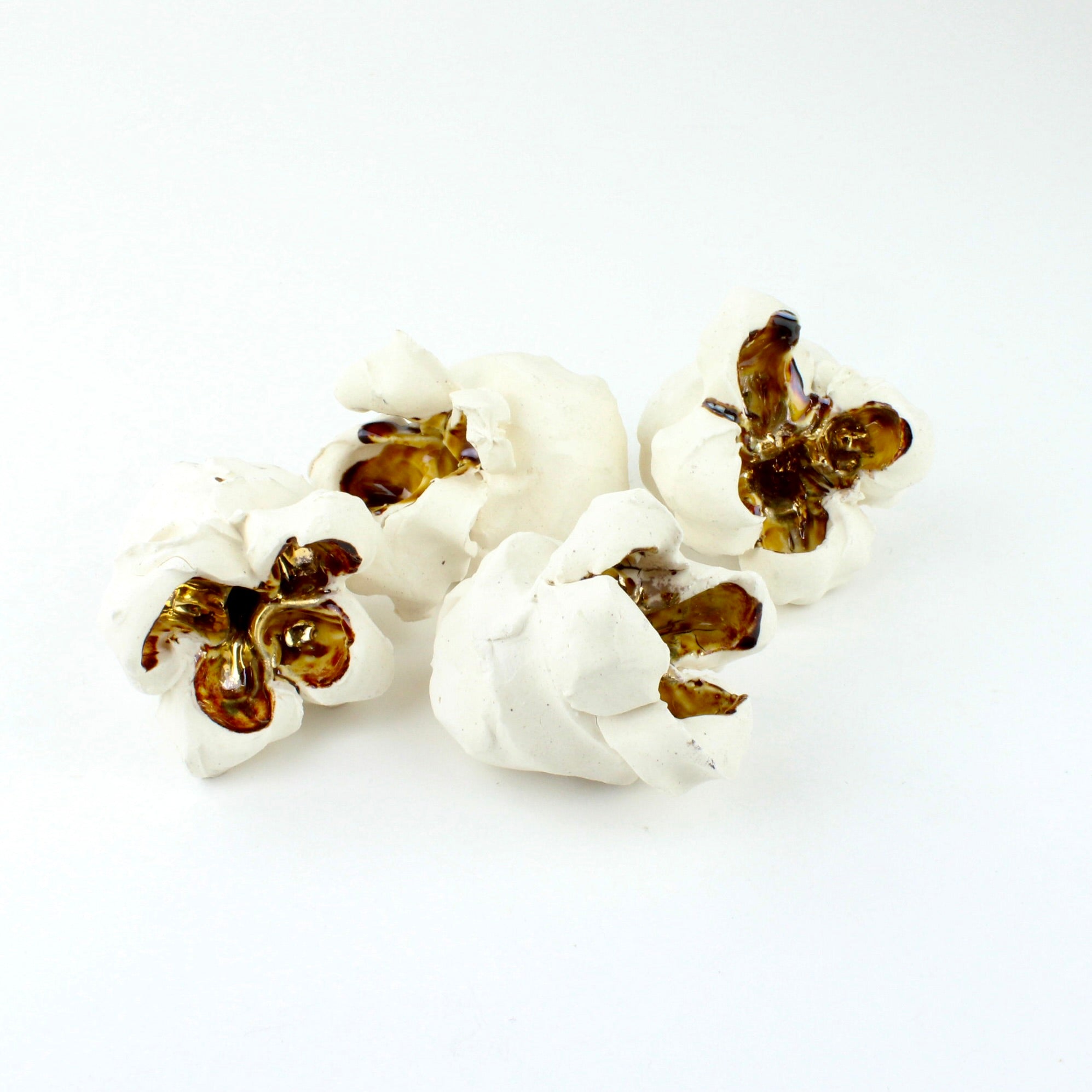 In this playful yet richly sculptural series, Madeline Child transforms everyday popcorn into enduring ceramic forms. Inspired by her children’s love of colourful, sugary popcorn, she became captivated by its 'fleshy gorgeousness and organic fecundity'.
