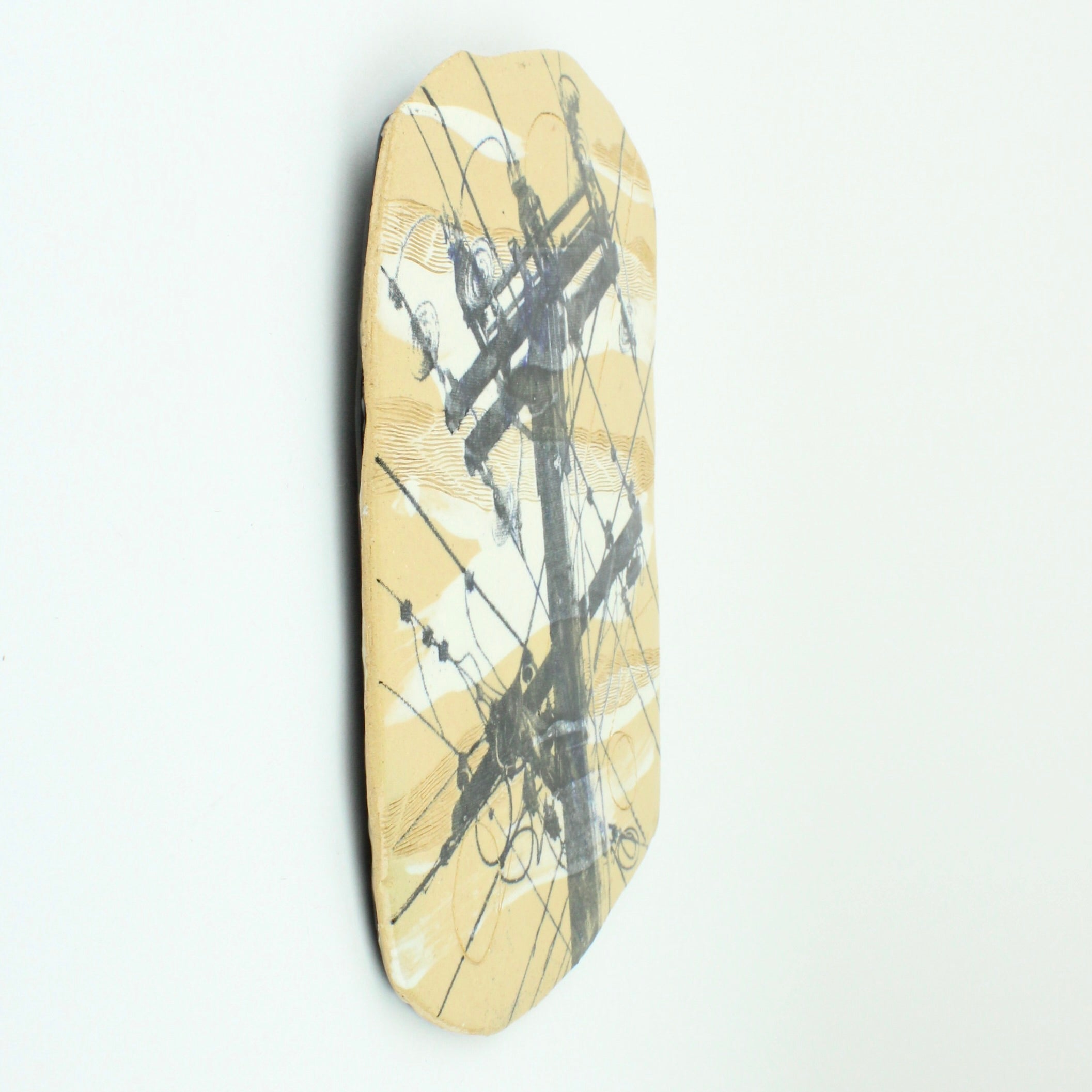 Kate McLean's collection of photographic and drawn ceramic forms create a dynamic tension between the organic nature of clay and the graphic systems layered upon it. Kate’s work invites viewers to consider how memory, place, and visual language imprint themselves onto the material world. In these clustered pieces, the traces of human gesture, printed image, and earthy form coexist, offering a quiet but compelling meditation on how we read, carry, and reinterpret the marks of everyday life.
