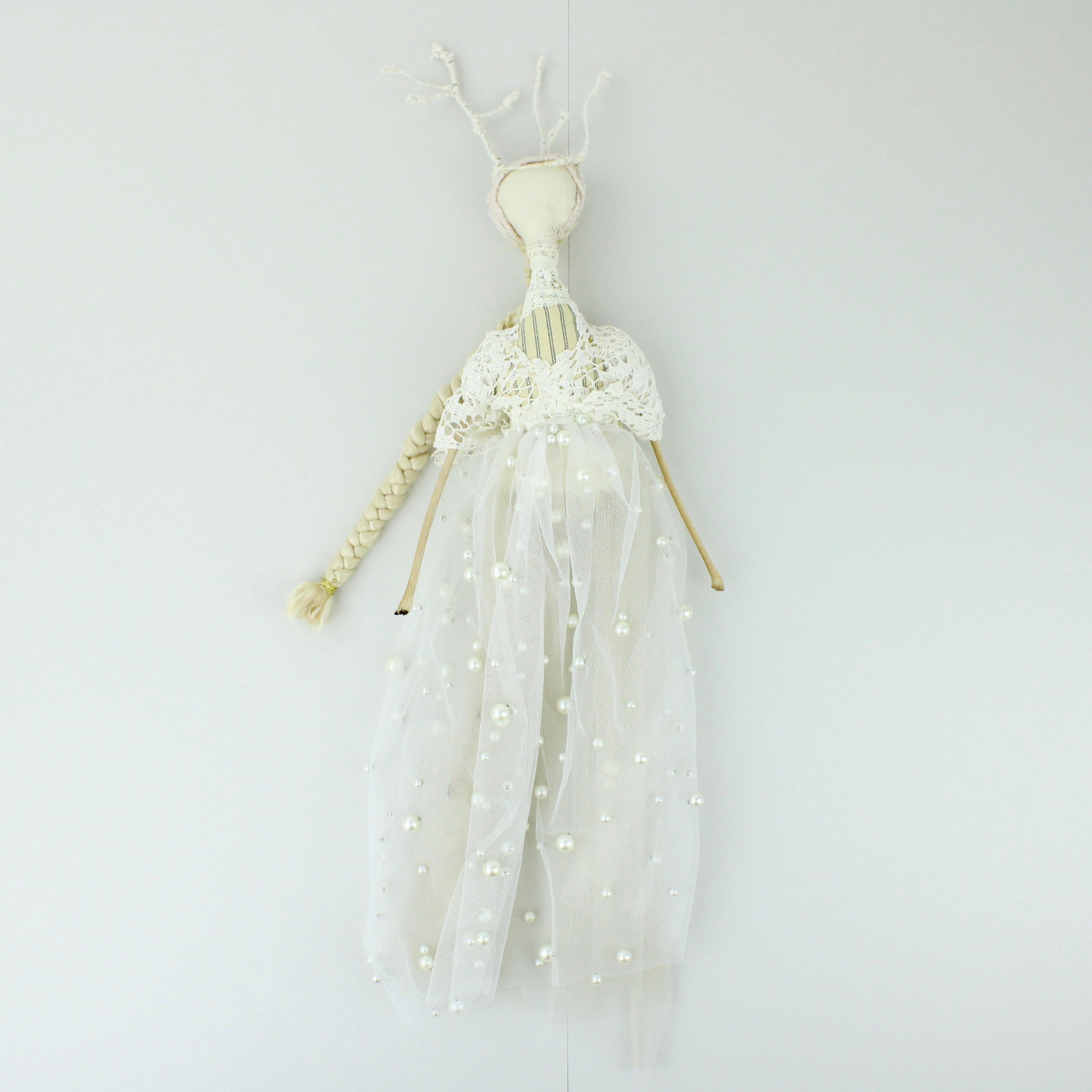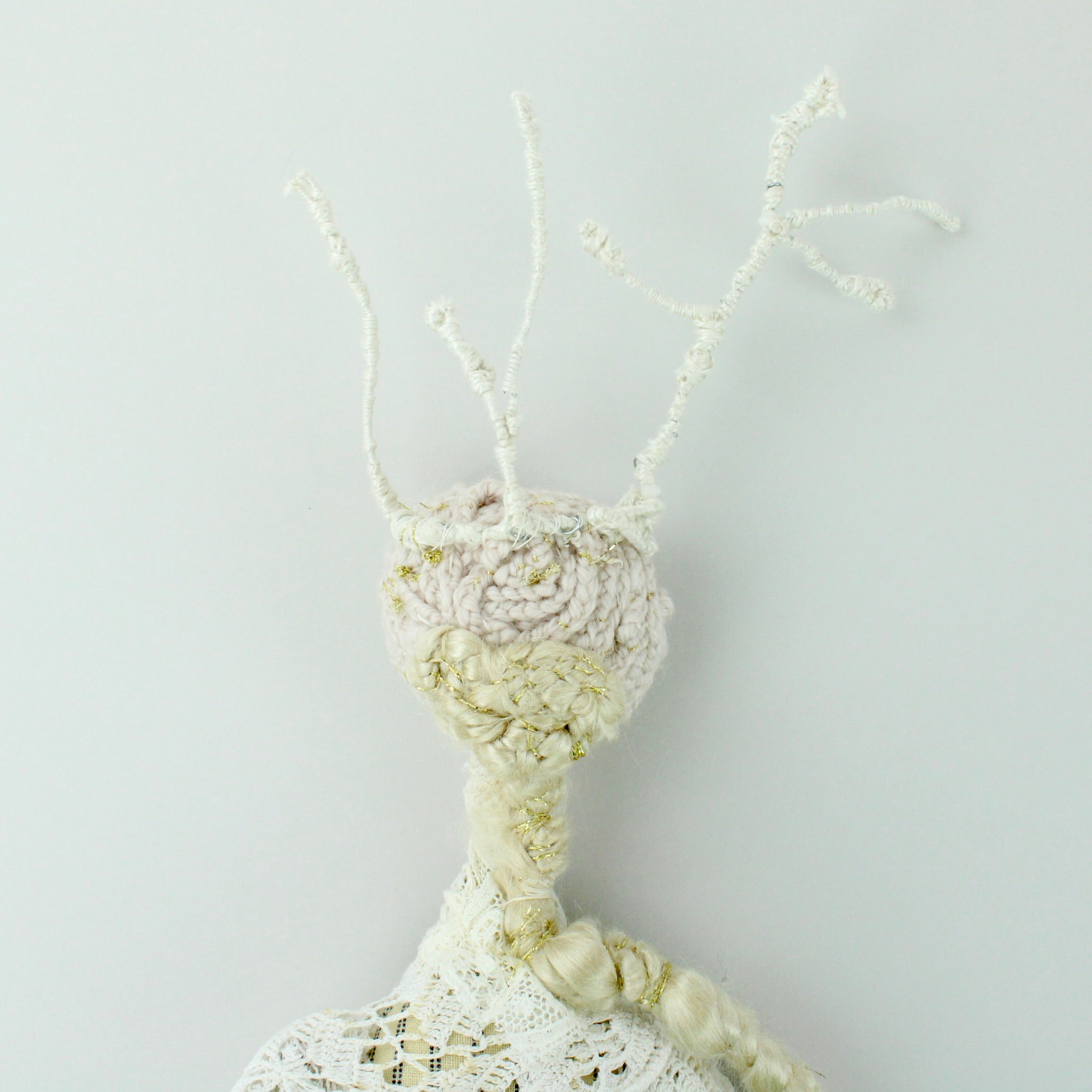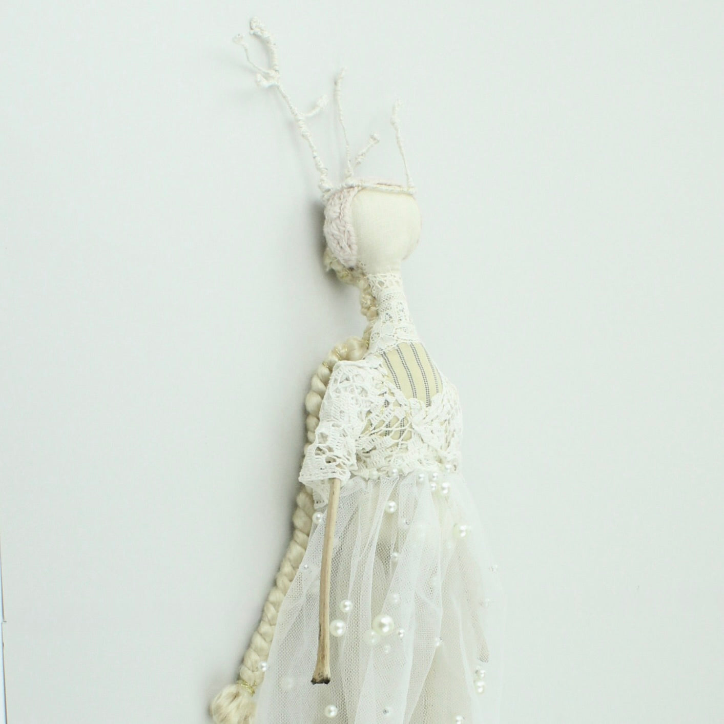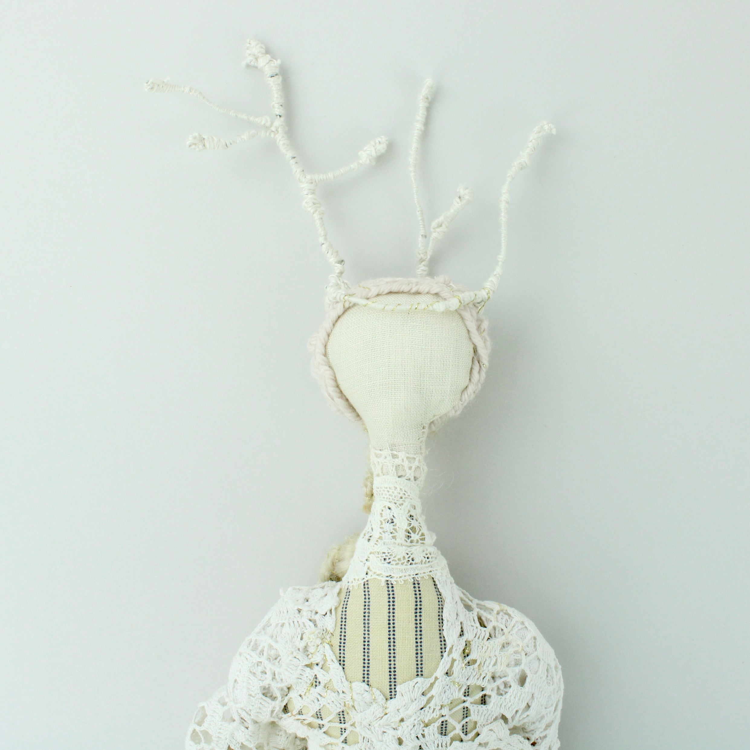 Wall hung. Crafted from Victorian bodice lace, mattress tacking, silk, wire, merino, tulle and twigs