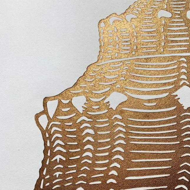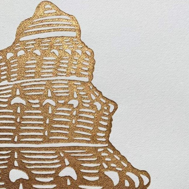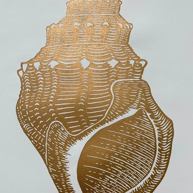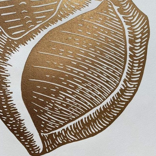 Golden Ostrich Foot Shell handmade original Linocut limited edition of 50 printed on Rosaspina fine art paper 220gsm.