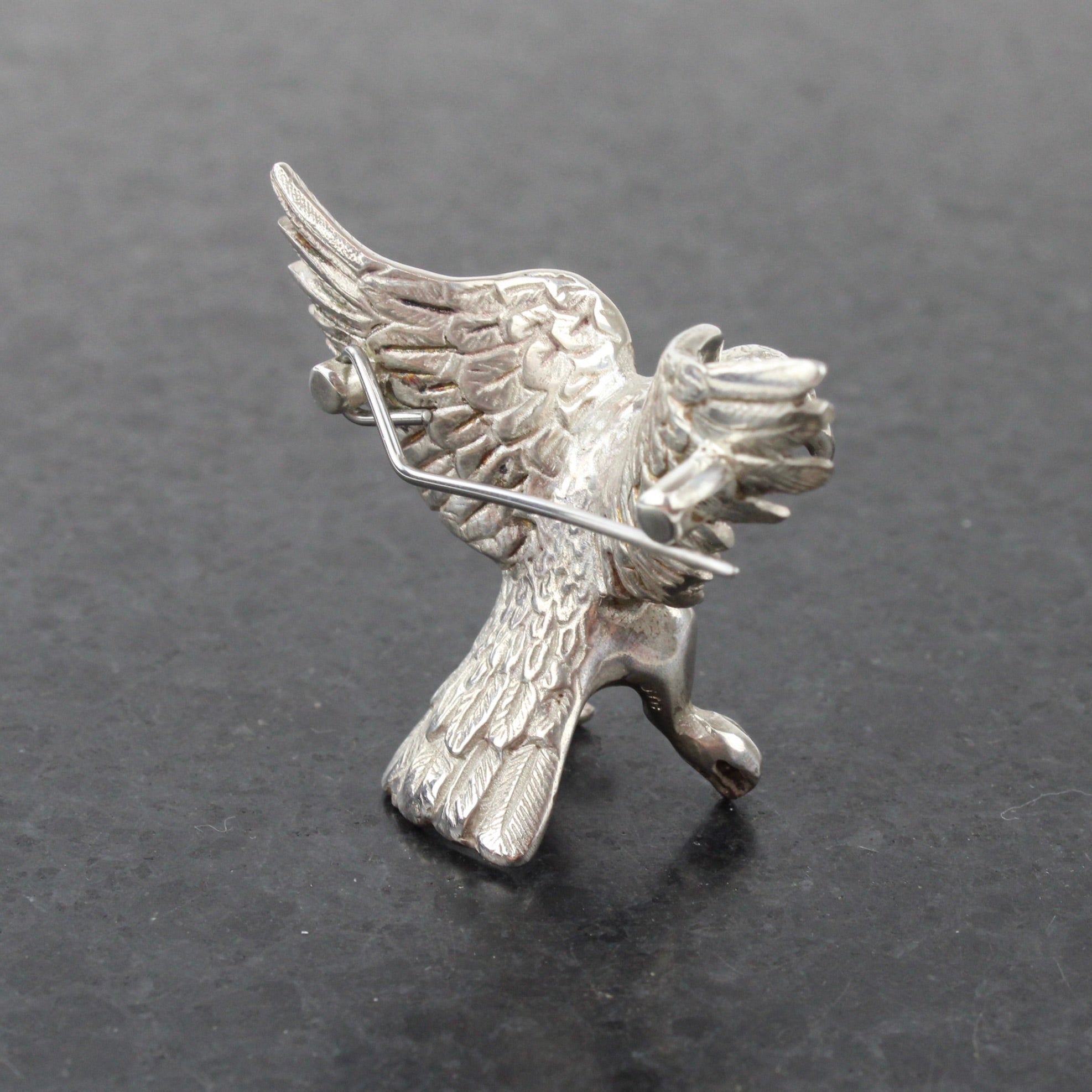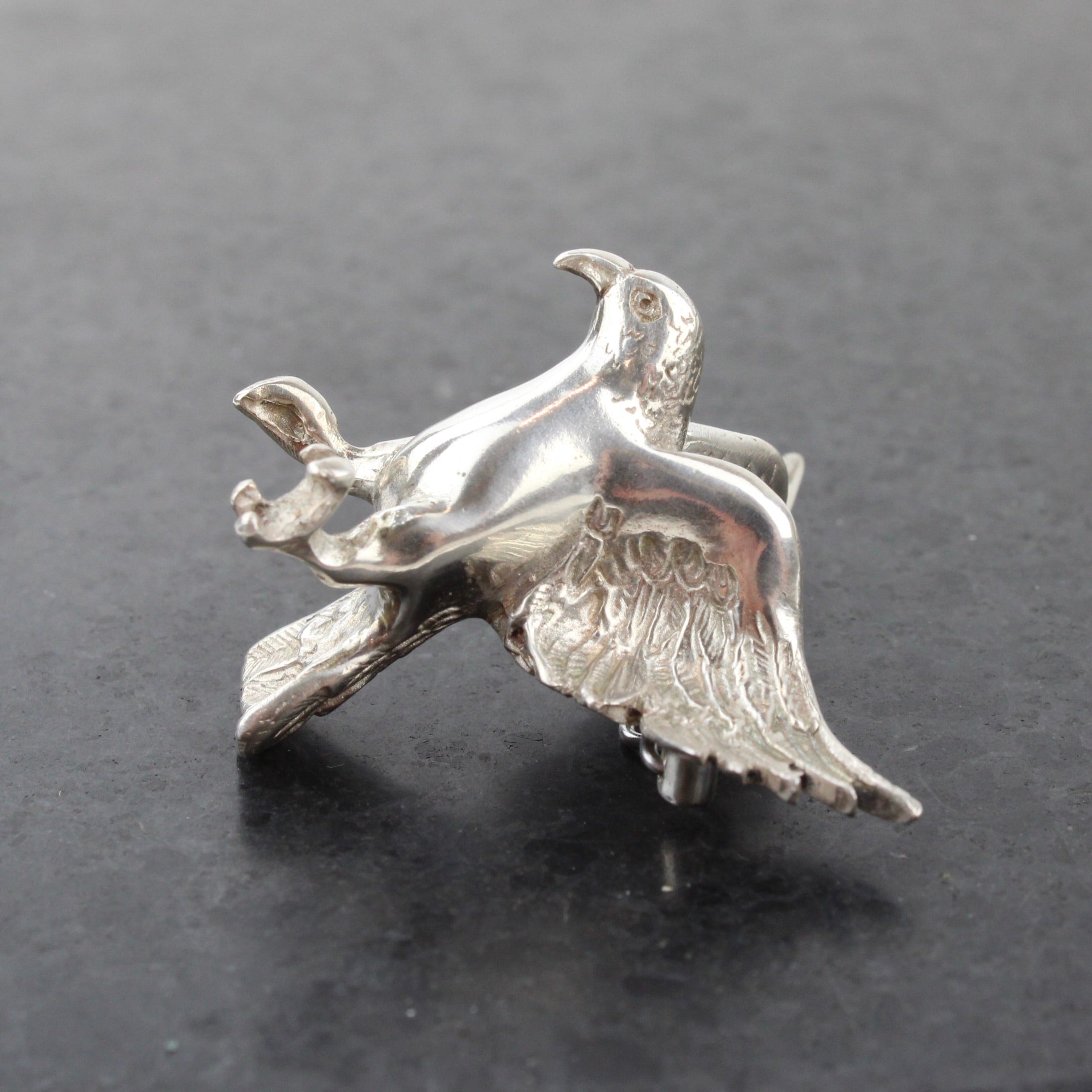 Wingspan is 42mm. This brooch is made from solid metal so sits best on a sturdy fabric, the lapel of a coat or jacket or a thick scarf are perfect.