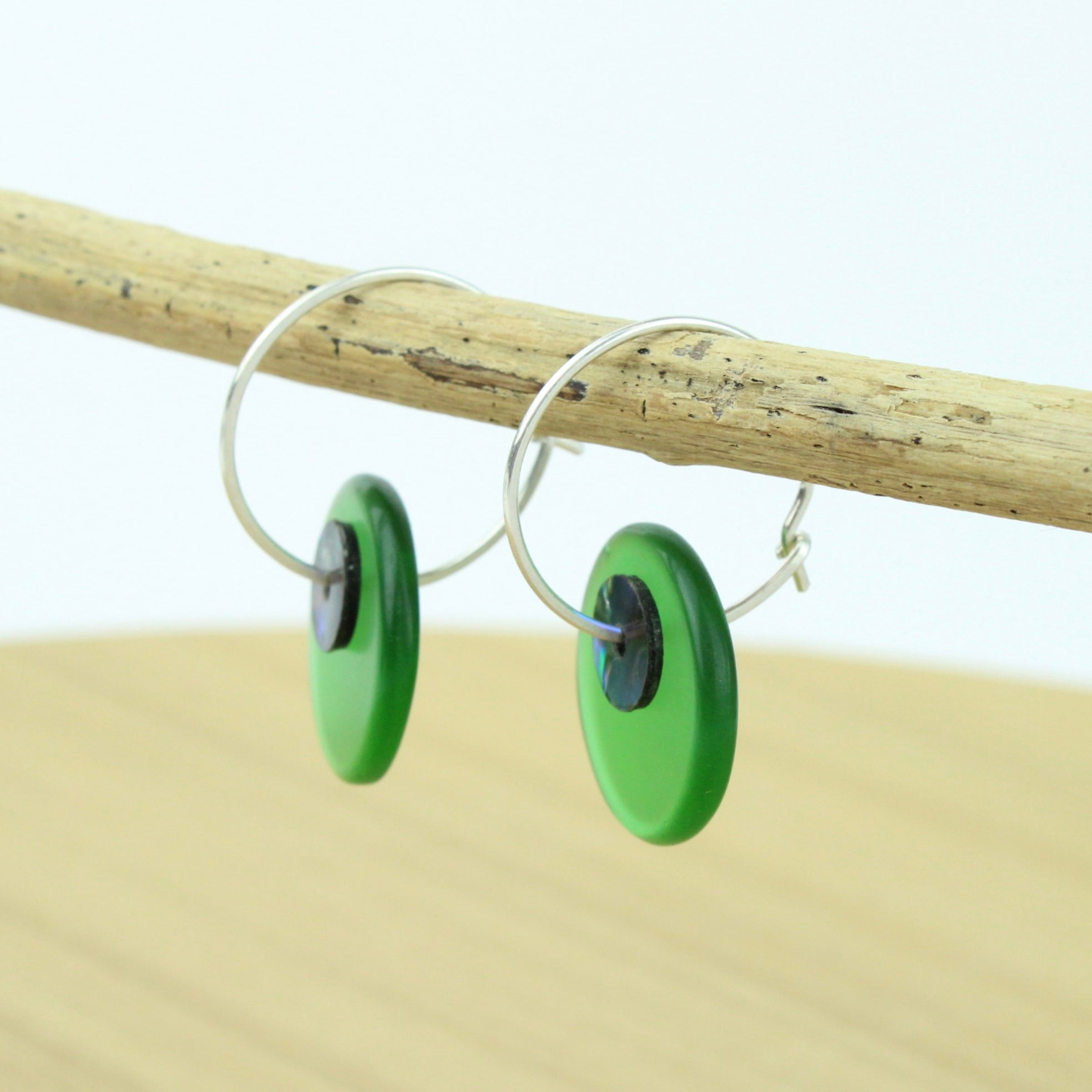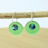 Recycled glass disc with a petite pāua disc on recycled sterling silver hooks