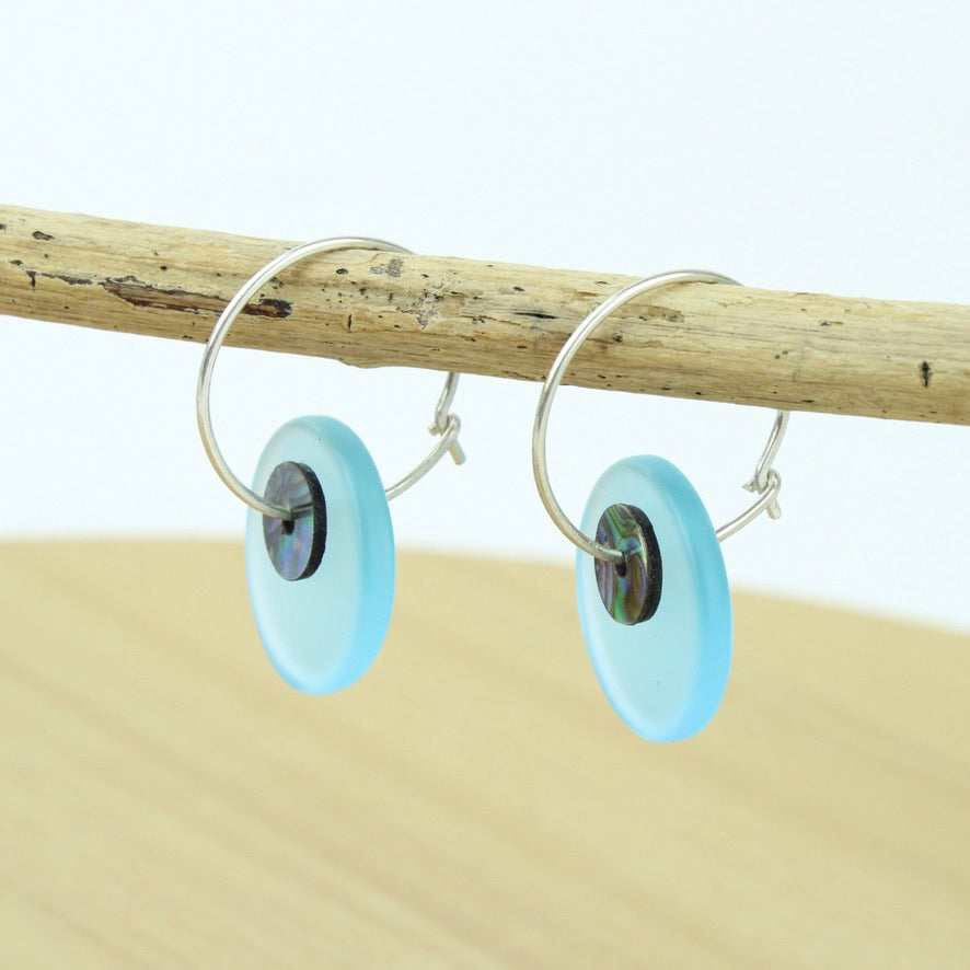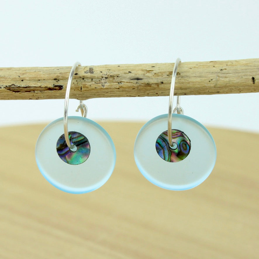 Recycled glass disc with a petite pāua disc on recycled sterling silver hooks