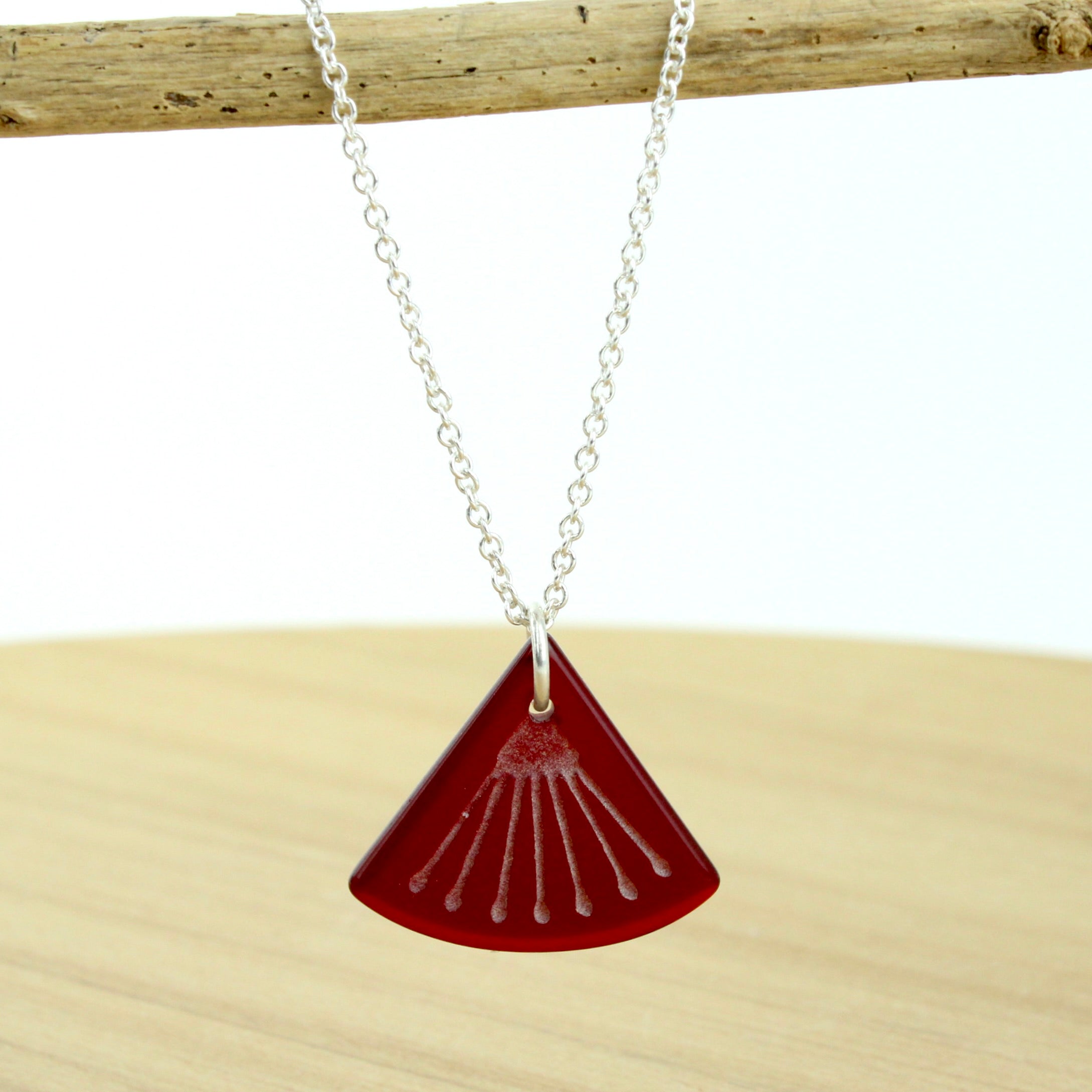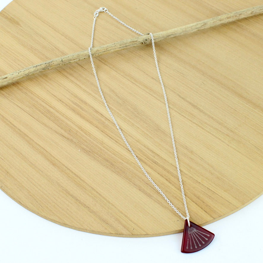 Recycled glass sandblasted with a stylised pohutukawa design on a sterling silver chain