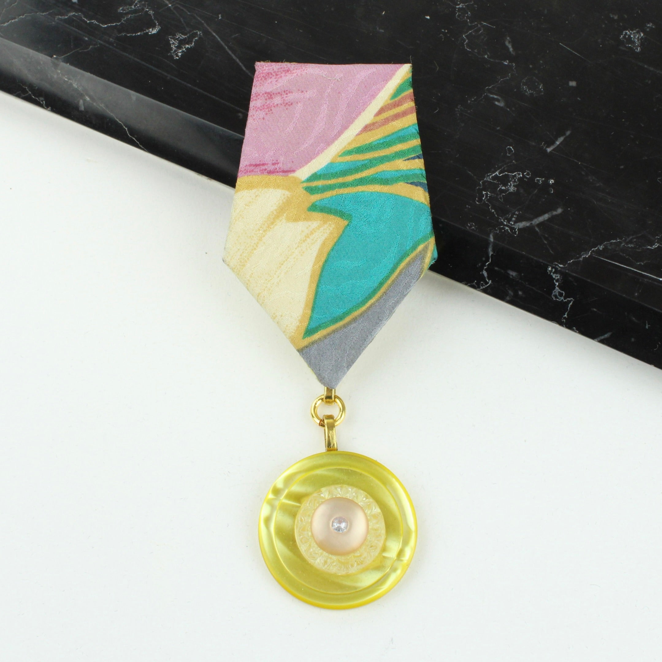 Trish Campbell's mini medallion brooches are a tribute to the domestic warrior. Each medallion is made from the union of two objects, each with prior history and associated place. Fashioned from a collection of pre-loved men’s tie and decorative buttons and found objects. More than a mere embellishment, the decorative is reassigned to construct a ‘decoration of honour’. “This is essentially a tribute to the domestic warrior in our lives - given with love and thanks for the unsung service on the home front”.