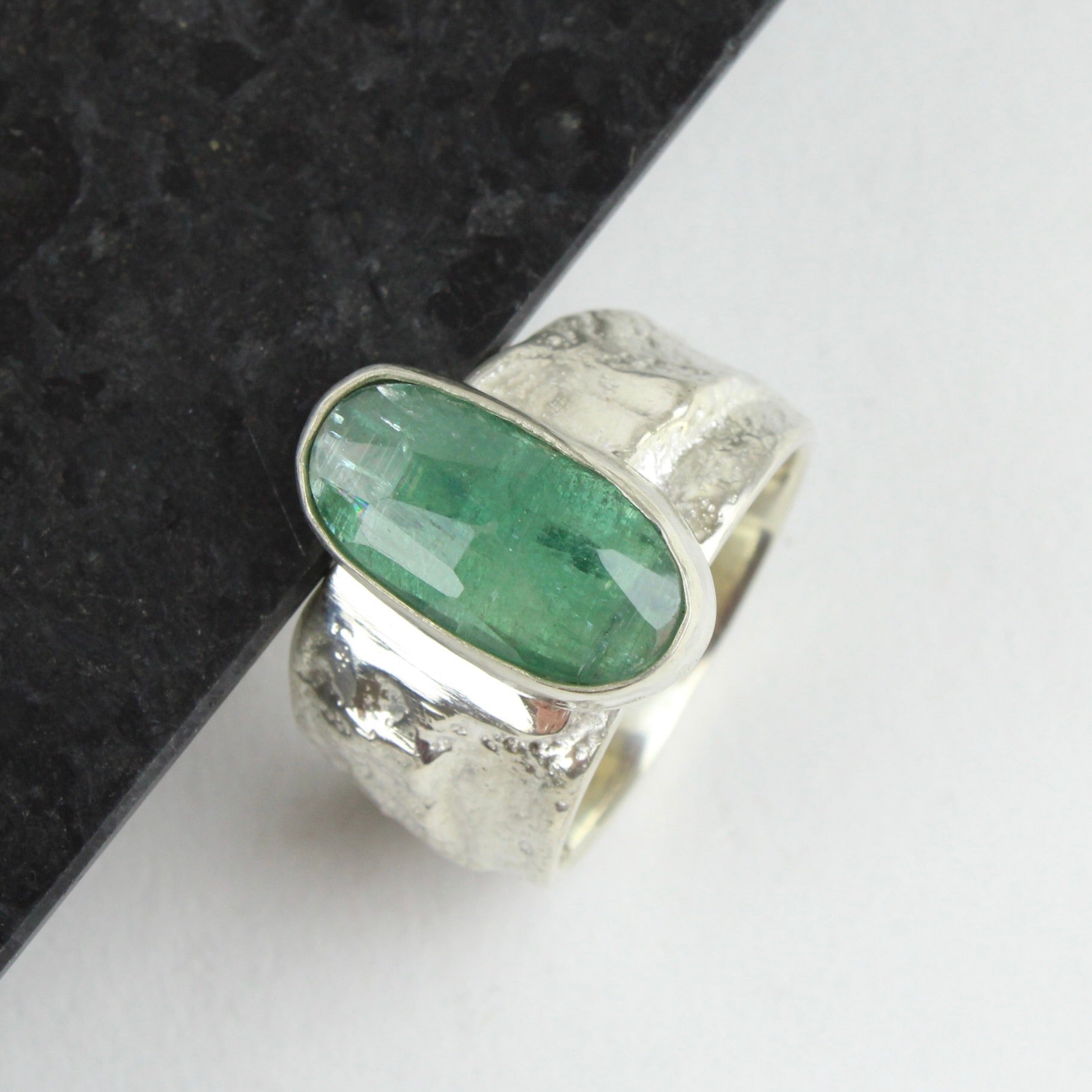 Sandcast, textured sterling silver with oval bezel green kyanite