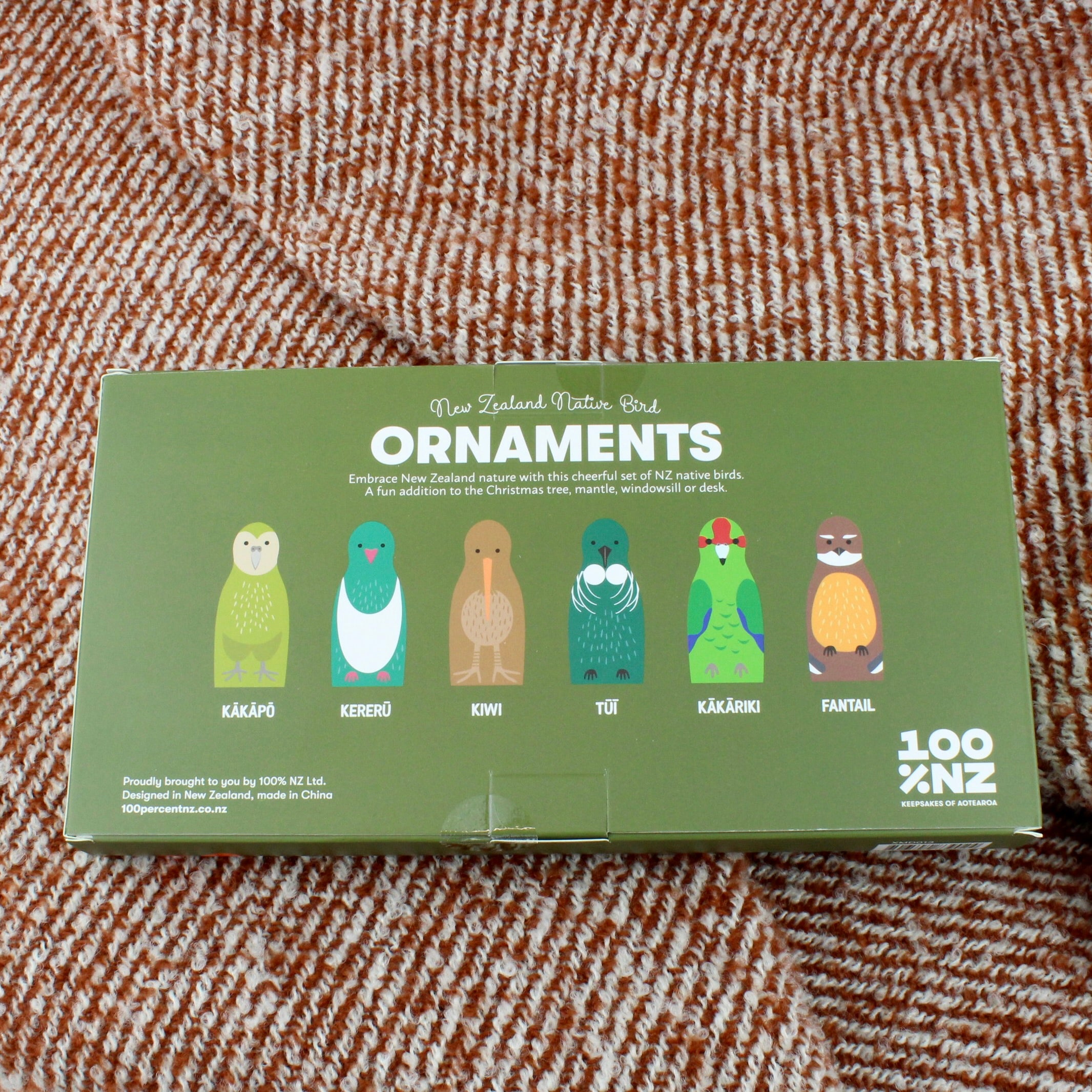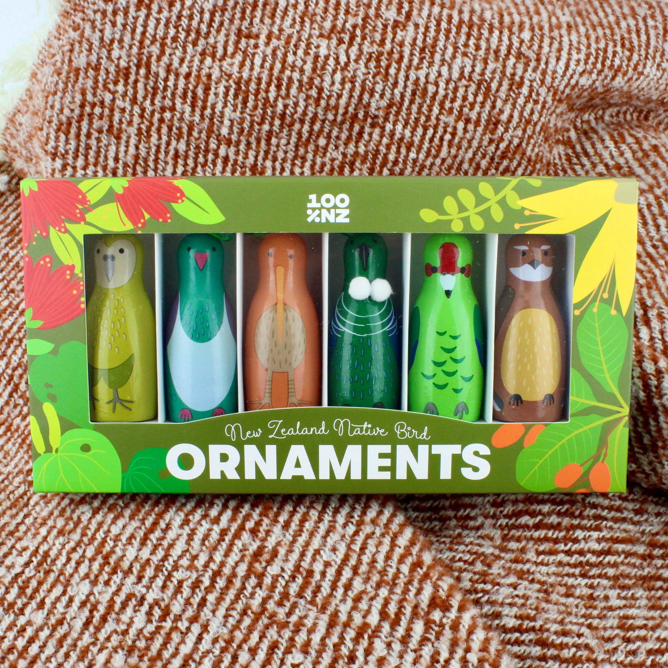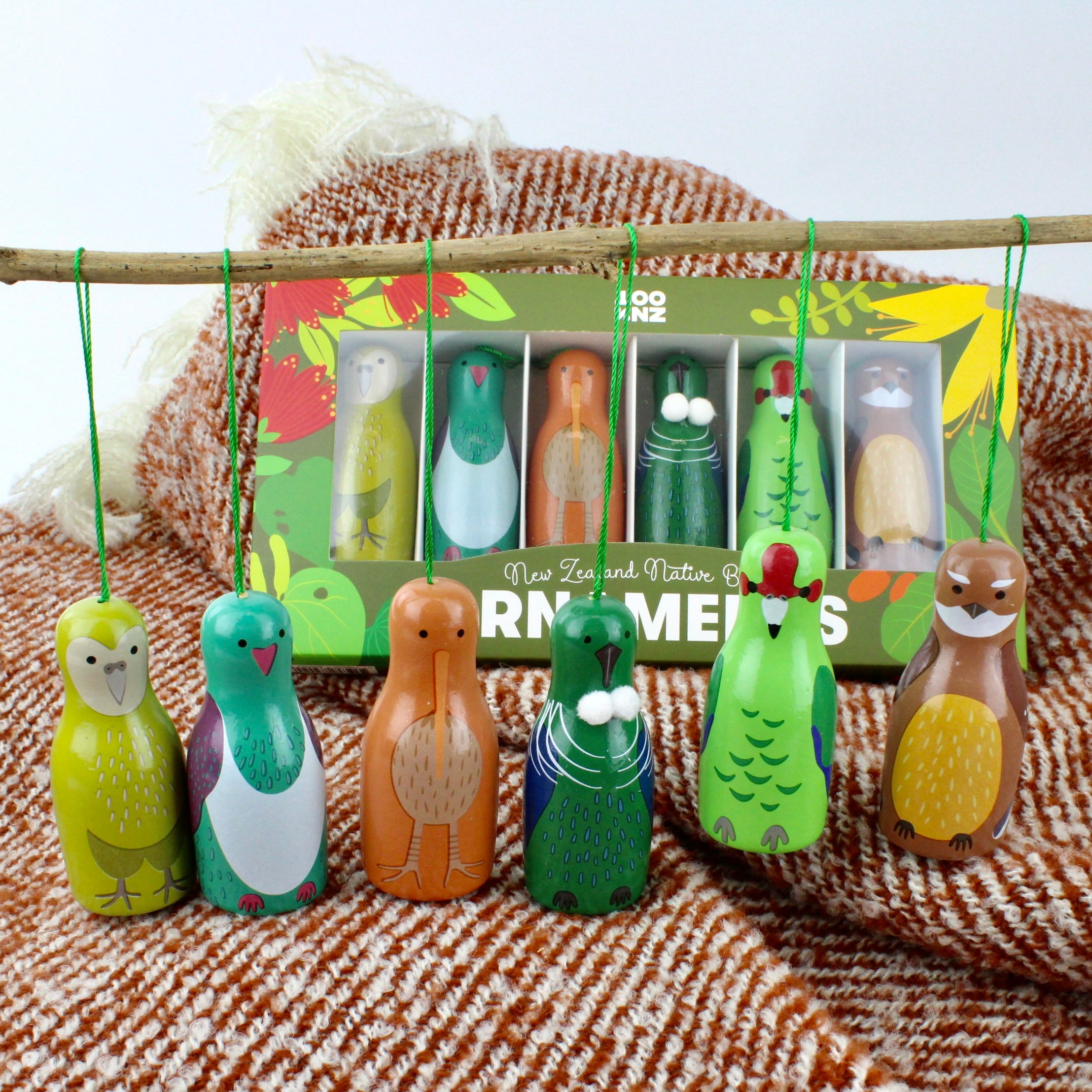Boxed set of six New Zealand native bird hanging wooden Christmas ornaments. These super cute birds are a perfect gift set or for your own tree, desk or window sill.