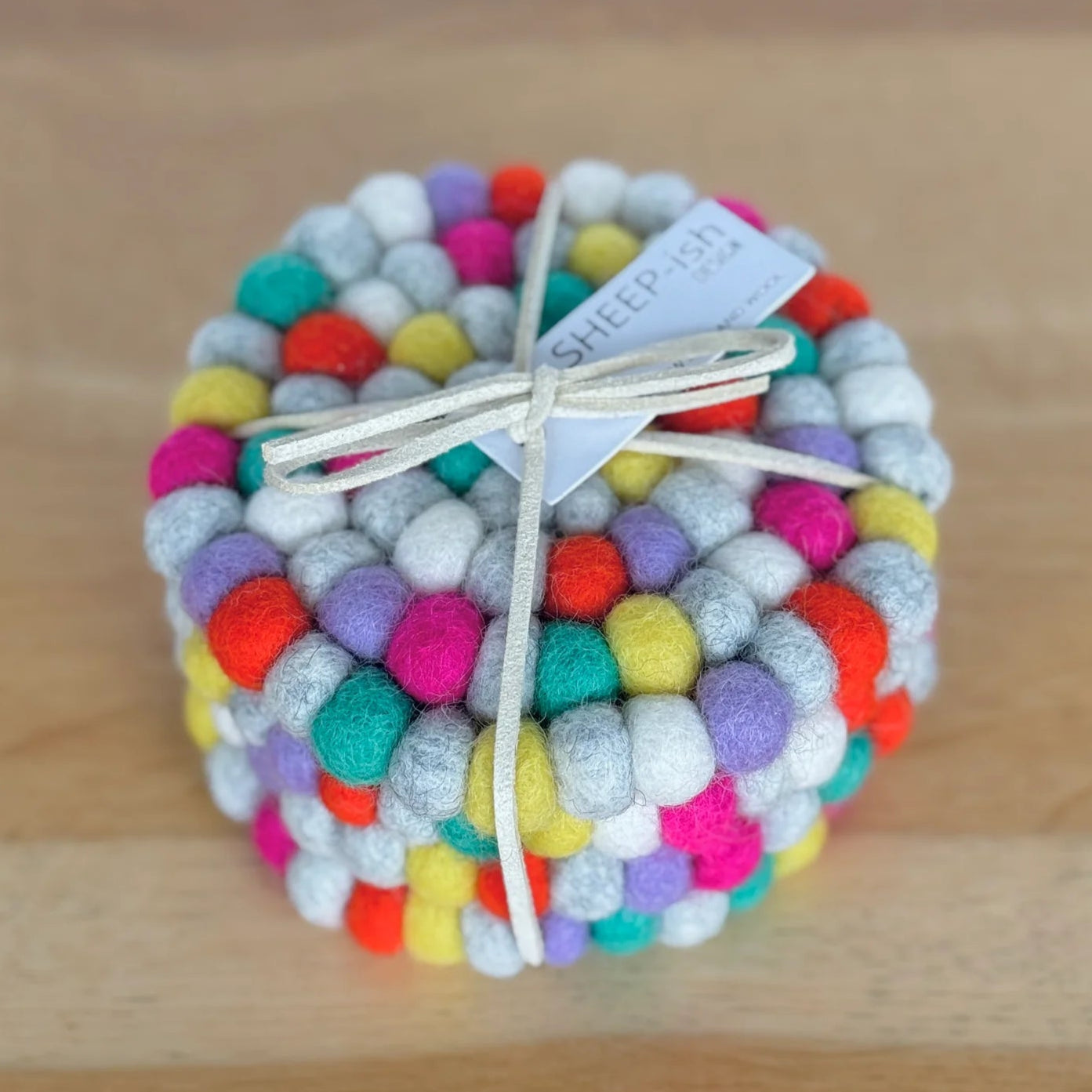 Care instructions - Gently spot clean with a damp cloth and wool wash. Sheep-ish feltball products are easy to care for and can be machine washed on a cold gentle wool cycle. If a spill occurs, simply dab away any excess before popping the item into the machine. After washing, reshape if needed and dry flat. Because the wool is already felted, it won’t shrink, but please avoid hot washes as the thread binding the feltballs may shrink and tighten. Dry out of direct sunlight
