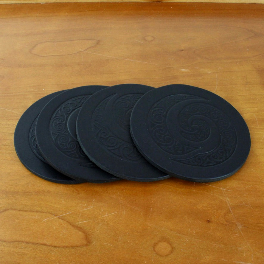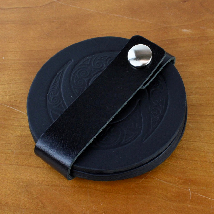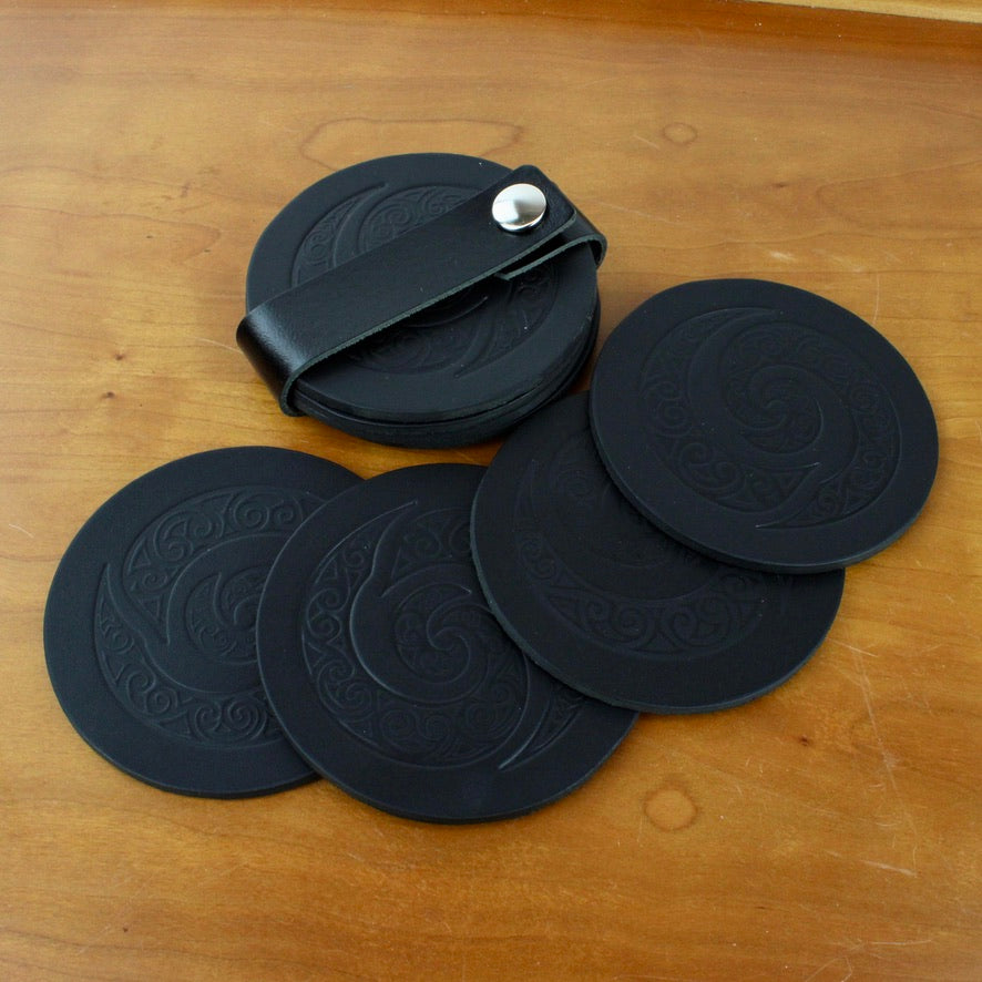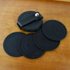 When not in use, the coasters tuck neatly into a domed leather wrap.