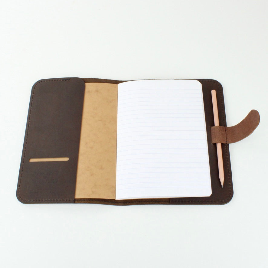 Included are the French-made A5 lined notebook and wooden pencil which are both easily replaceable, ensuring years of use. A handy card slot adds practicality, while the minimalist leather tab closure tucks neatly into place—perfect for those who appreciate clean, thoughtful design.