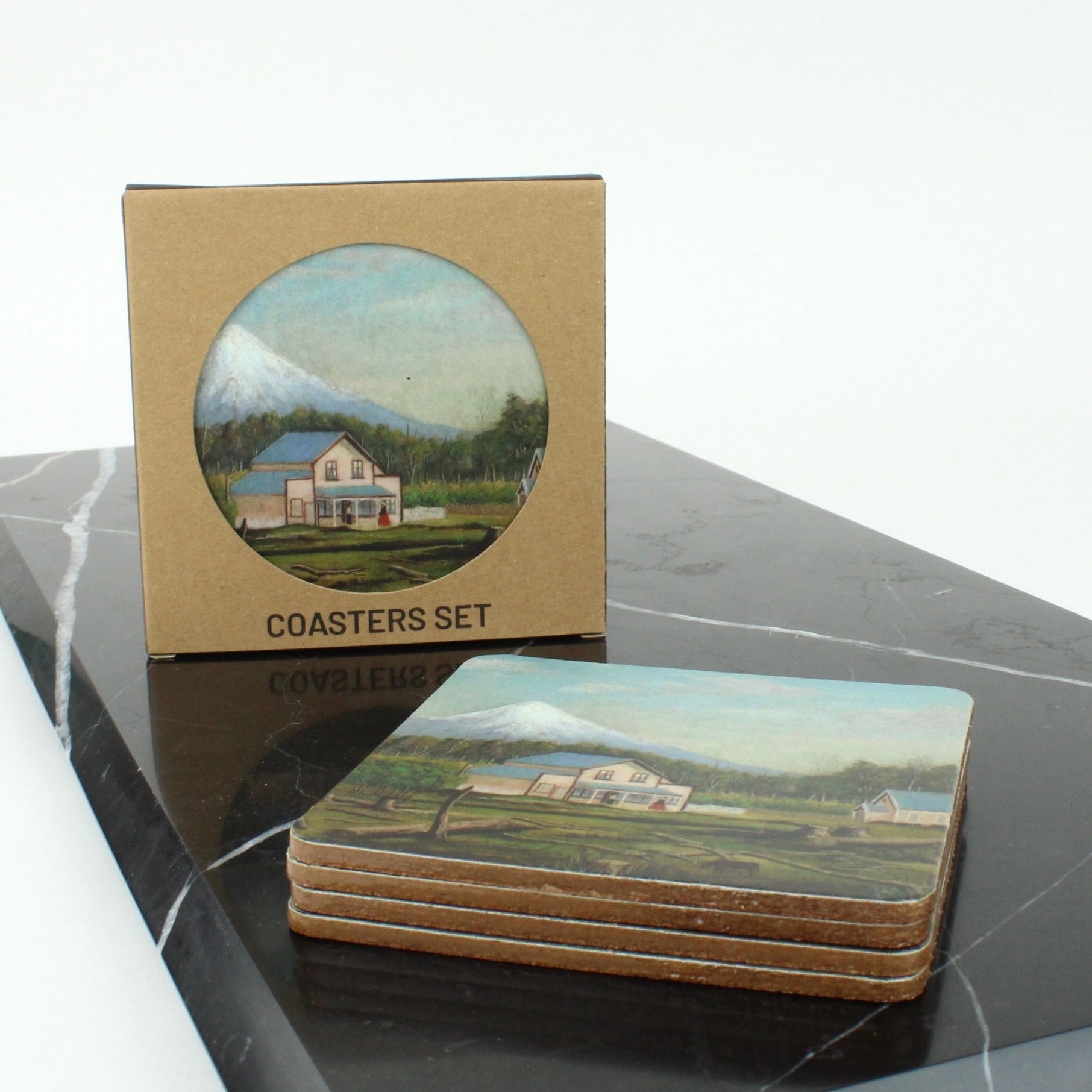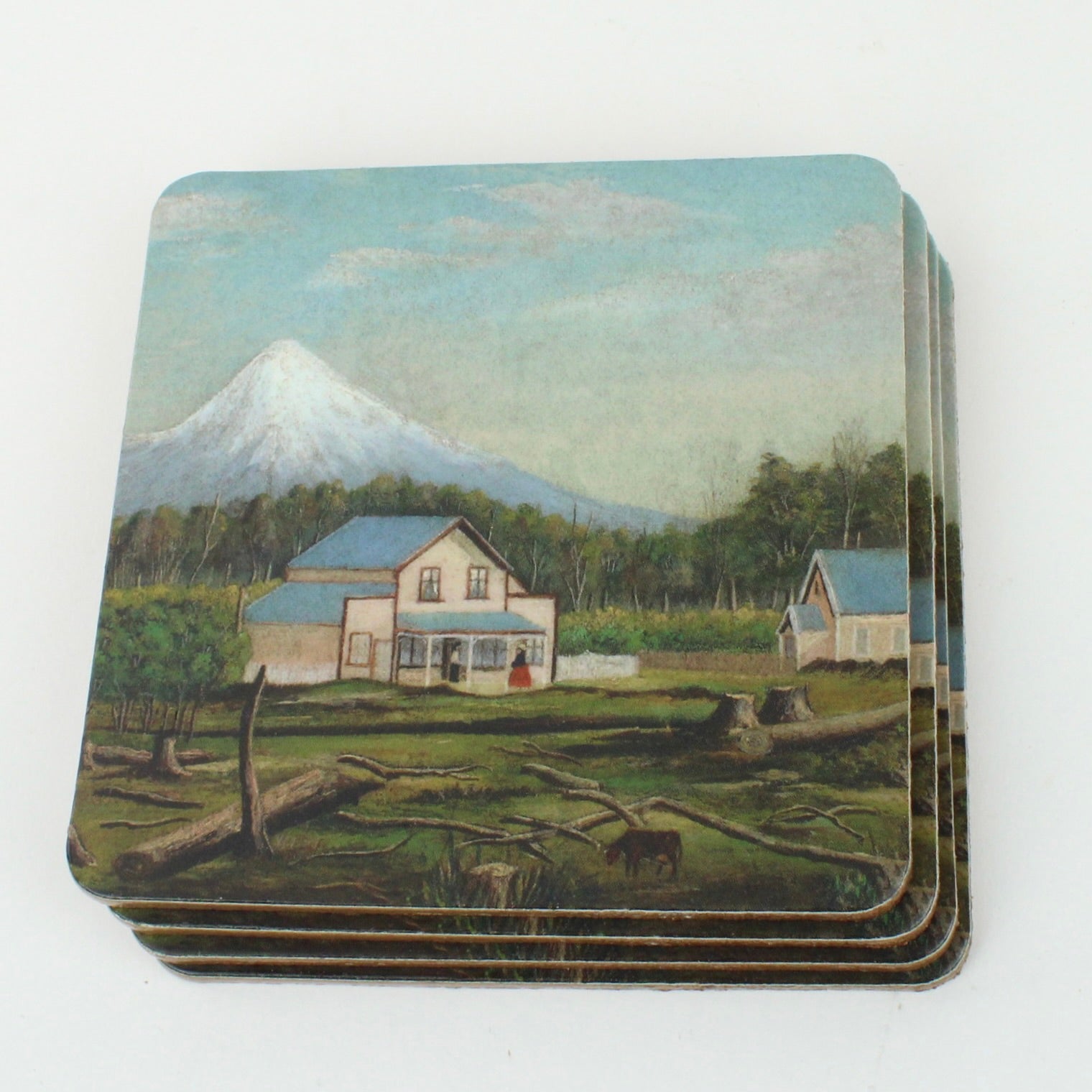Set of four coasters From Te Papa Collection Old Masters: Landscape with settlers, circa 1857, Taranaki, by Messenger Sisters
