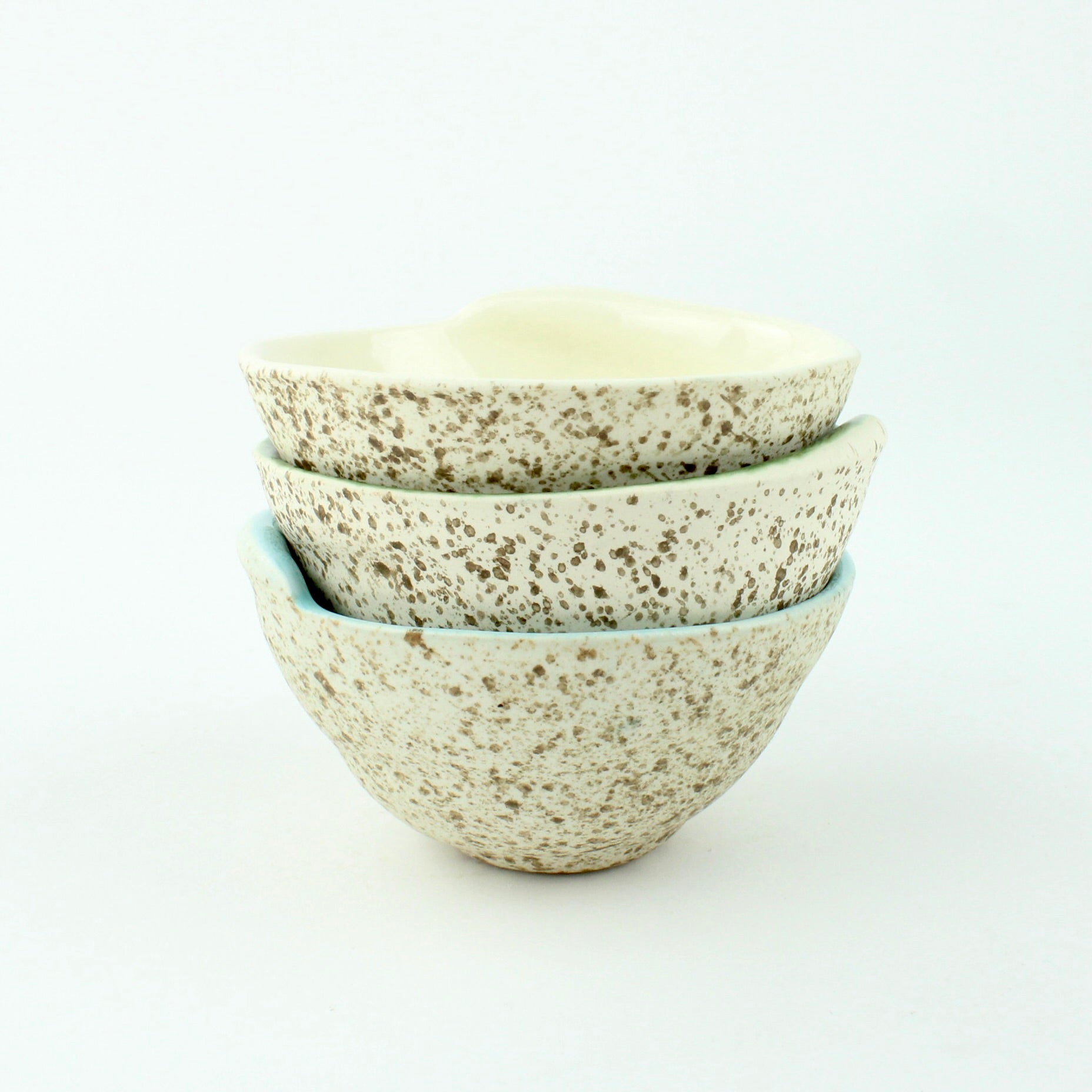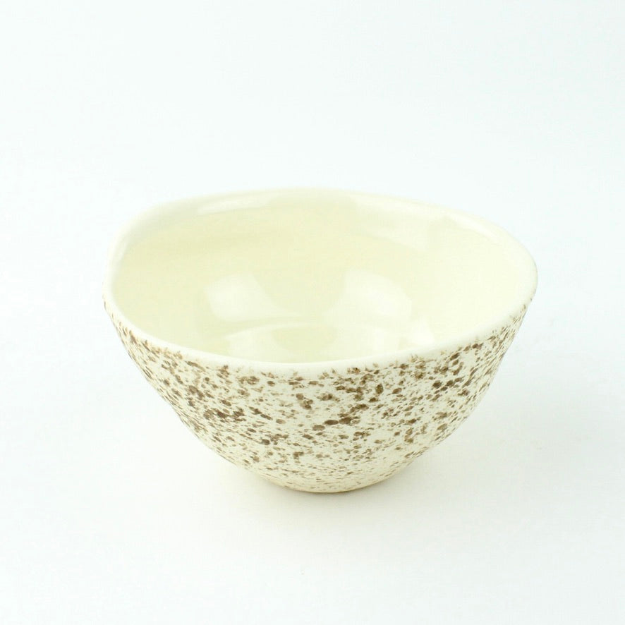 A charming little bowl, perfect for trinkets or a scoop of ice cream. The swirling pattern that breaks through the glaze on the inside, paired with the speckled exterior, makes it a true eye-catcher. Delicately detailed, with a swirl that gracefully winds up the sides—sweet and distinctive.